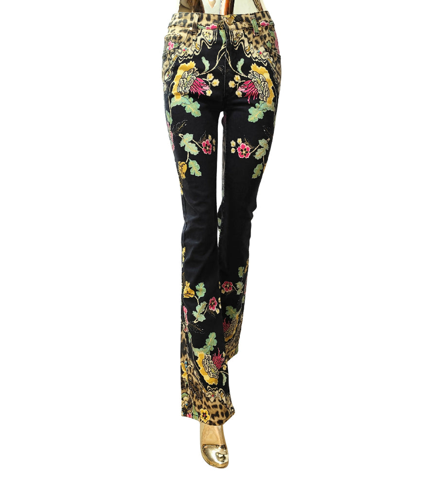 ROBERTO CAVALLI S/S 2003 CHINOISERIE PRINT BLACK AND YELLOW PANTS