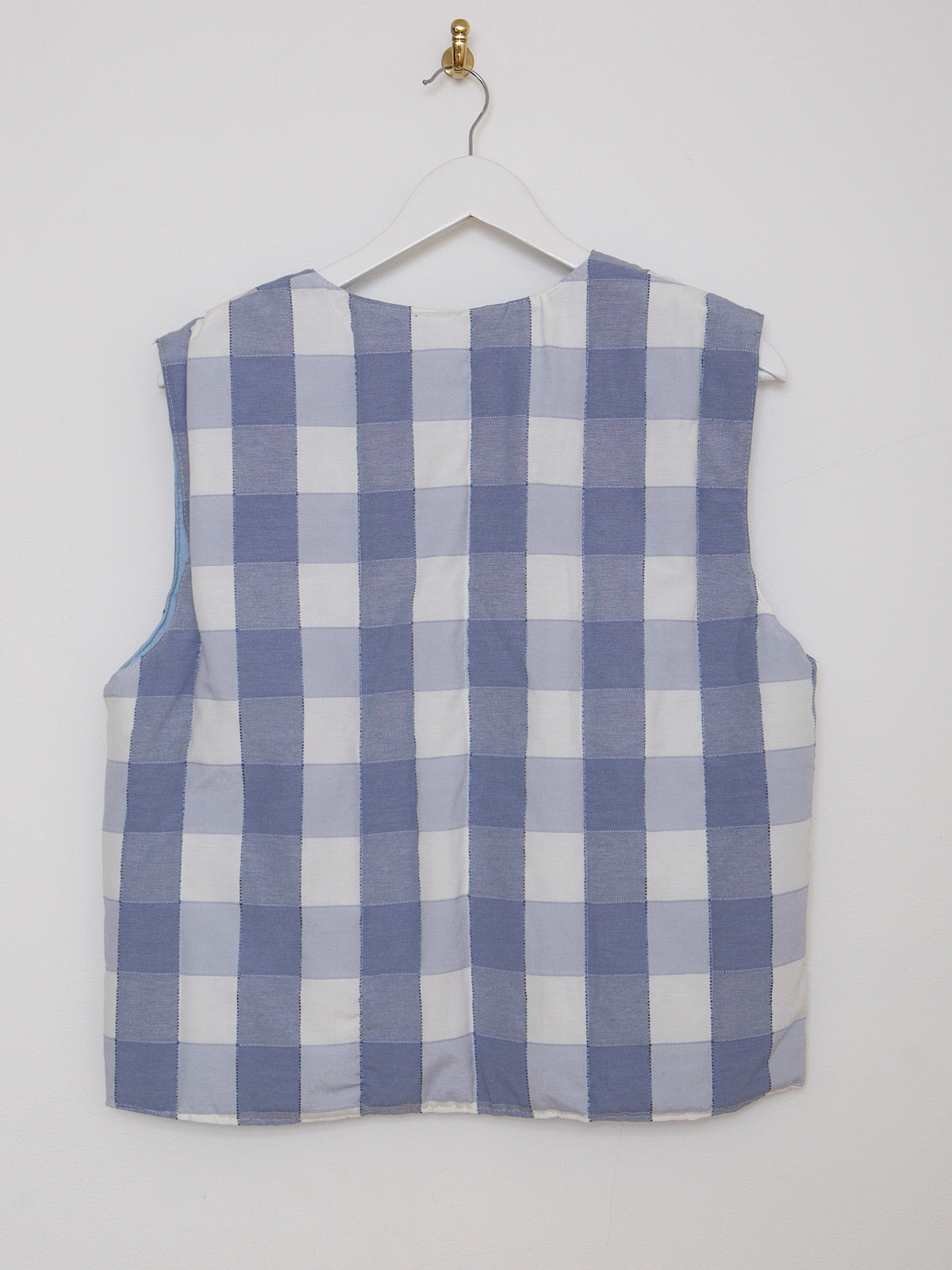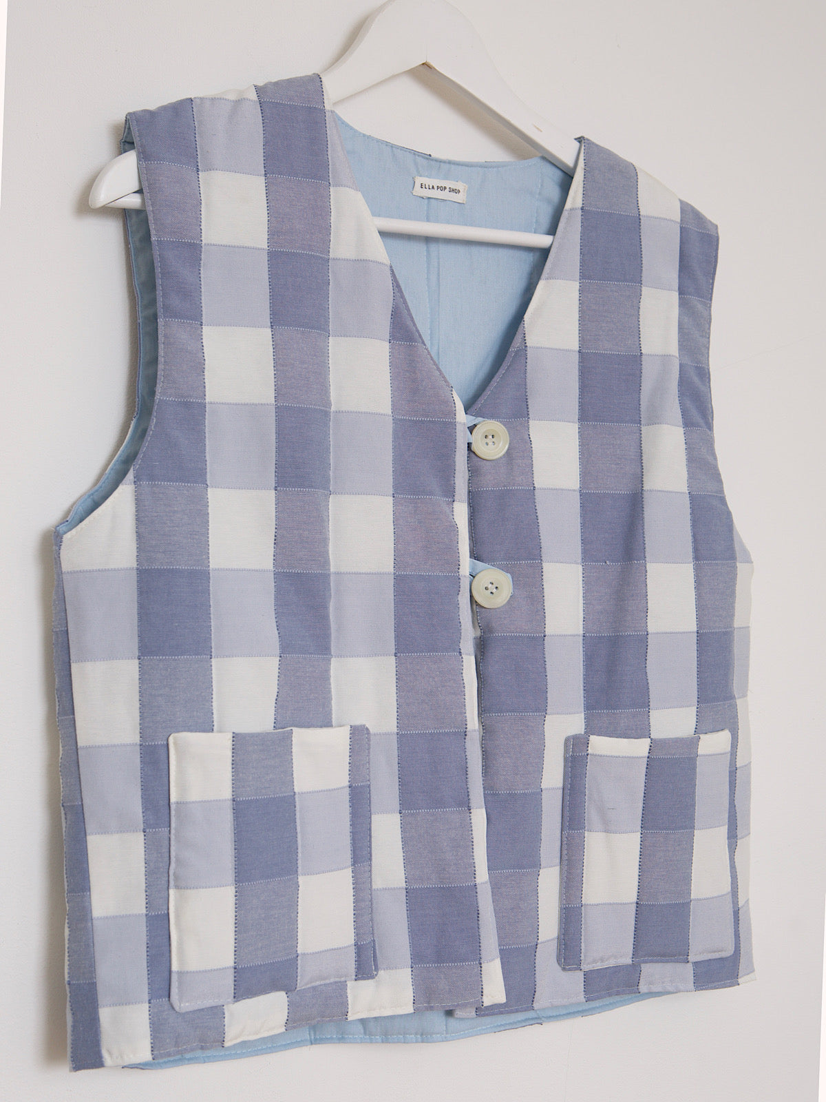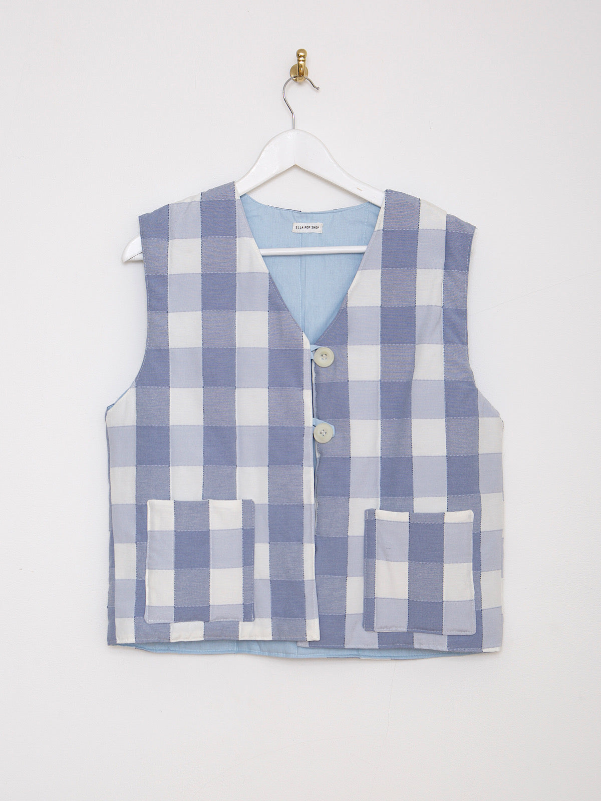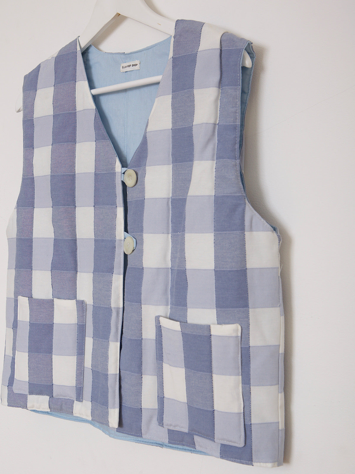 This waistcoat is handcrafted in East London, with beautiful checked blue cotton.