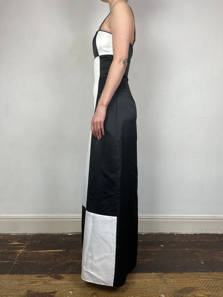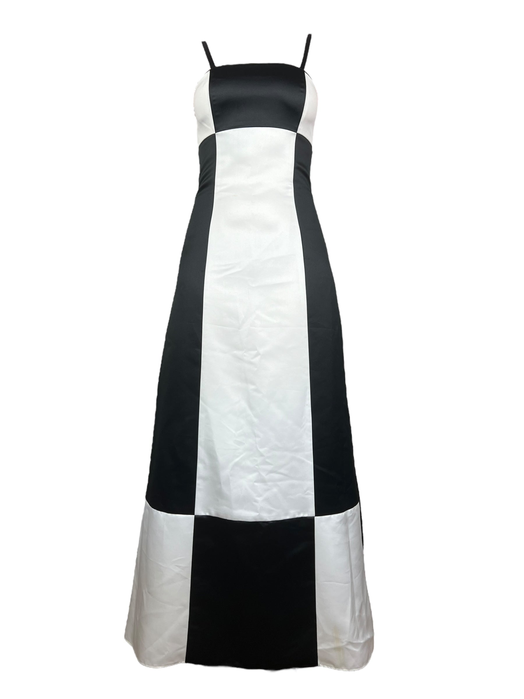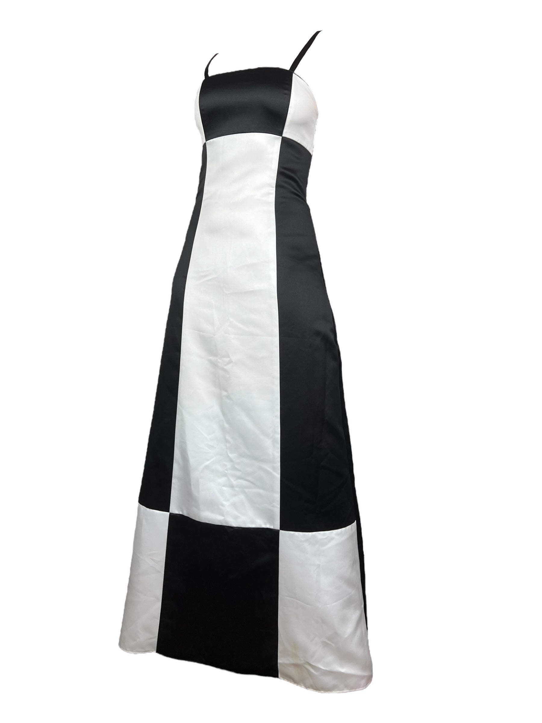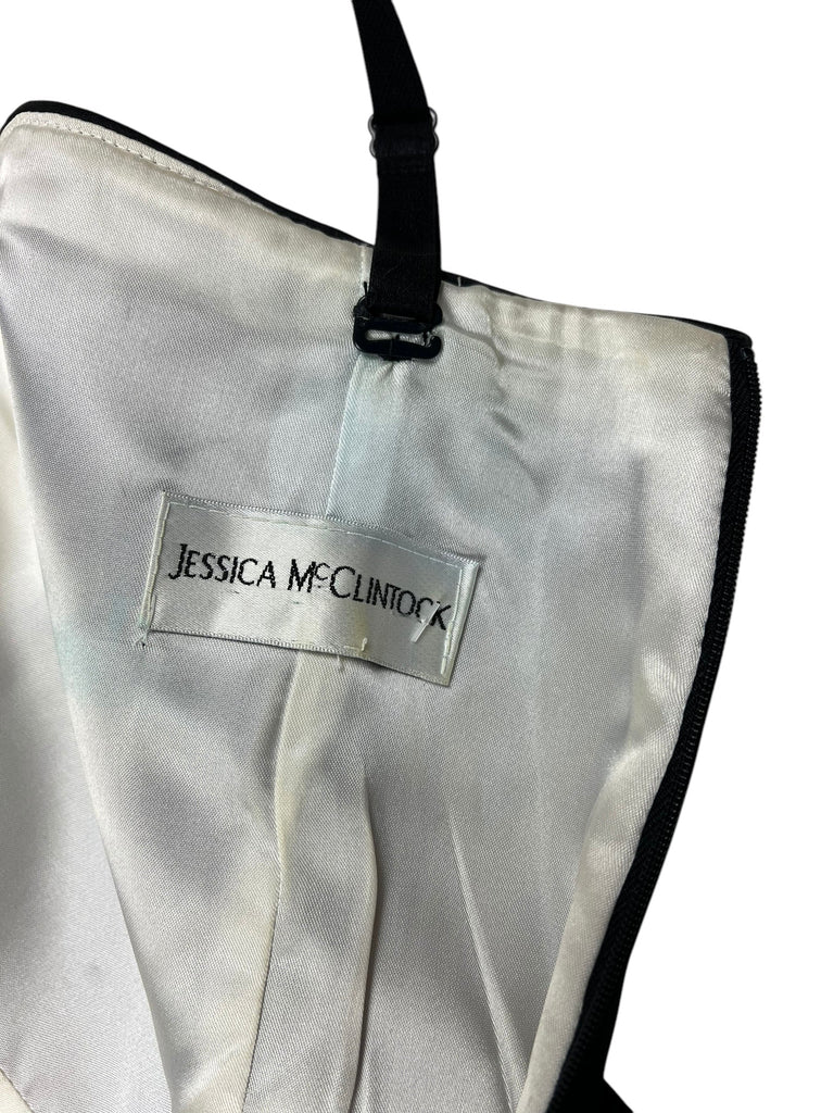 1990s Jessica McClintock monochrome gown. Fits modern UK8. The adjustable straps have been added but can be tucked in and do not show. All details below: