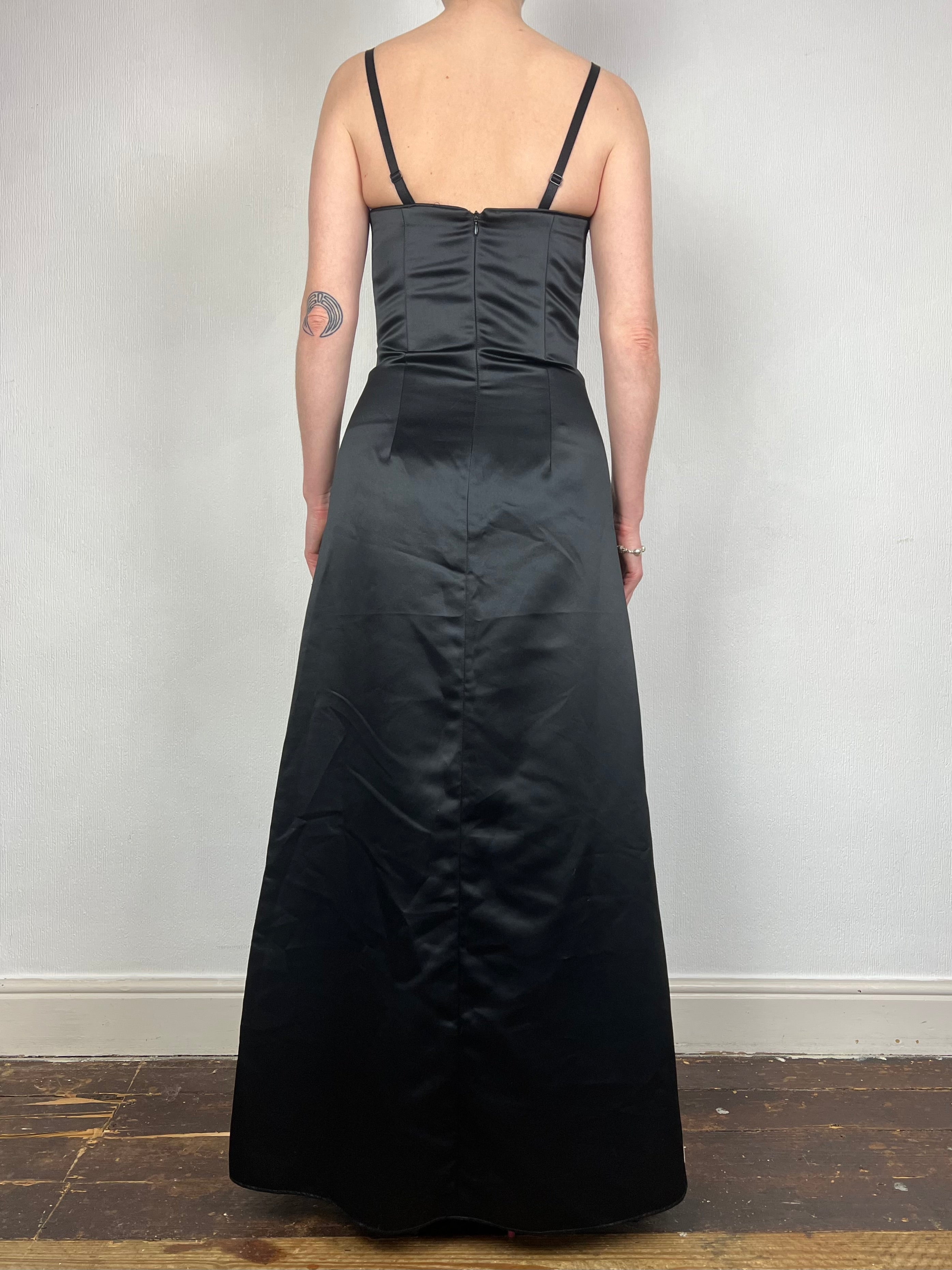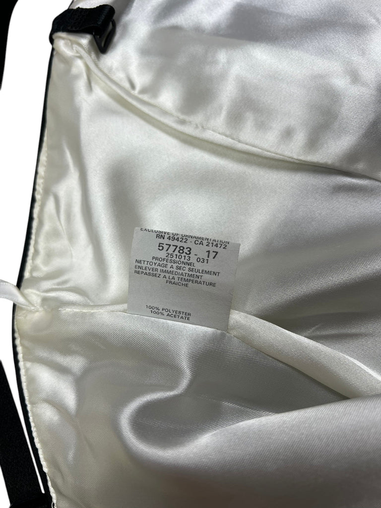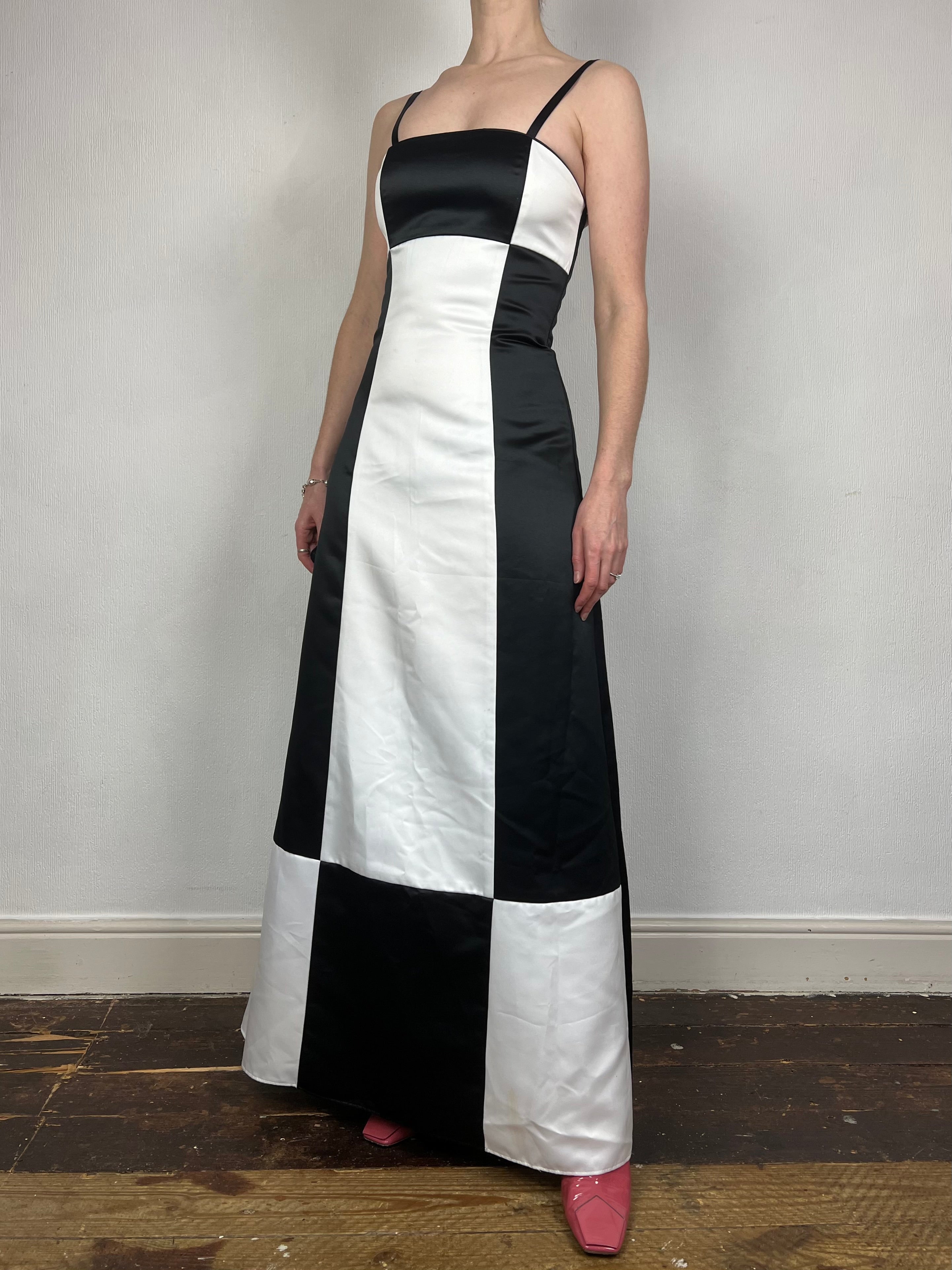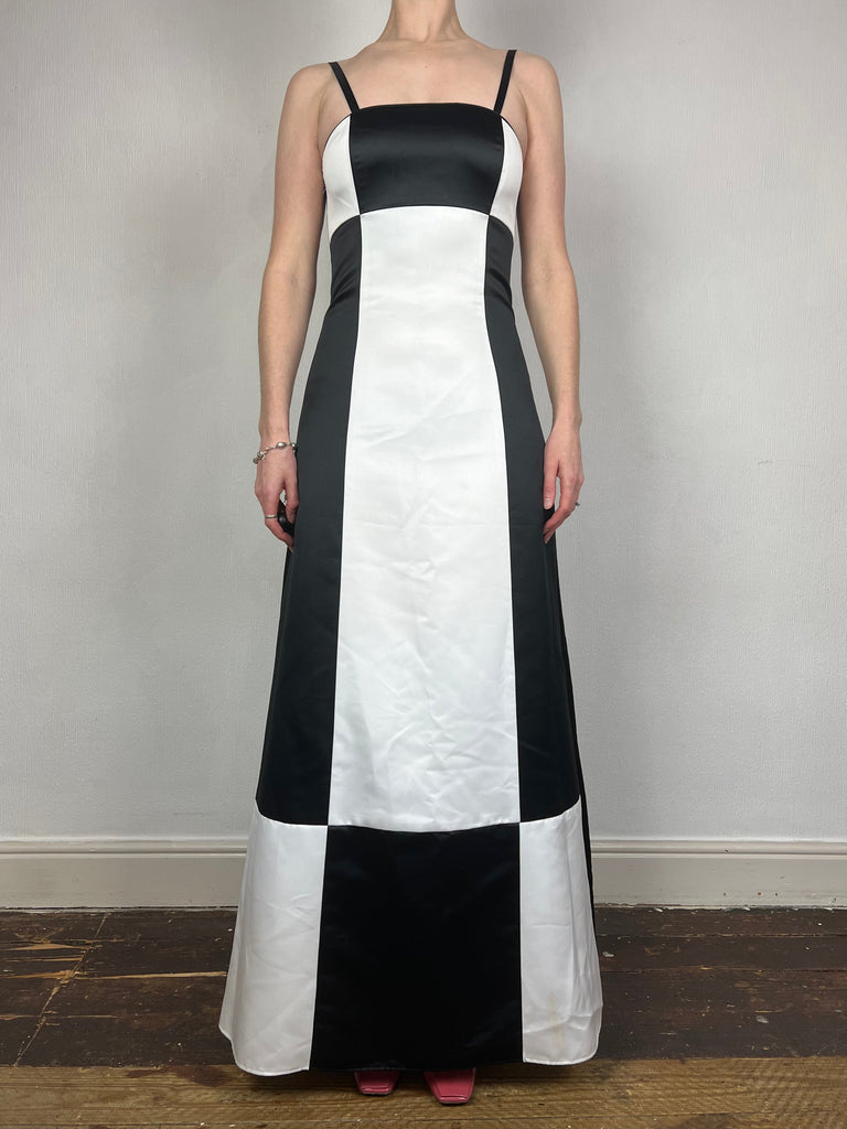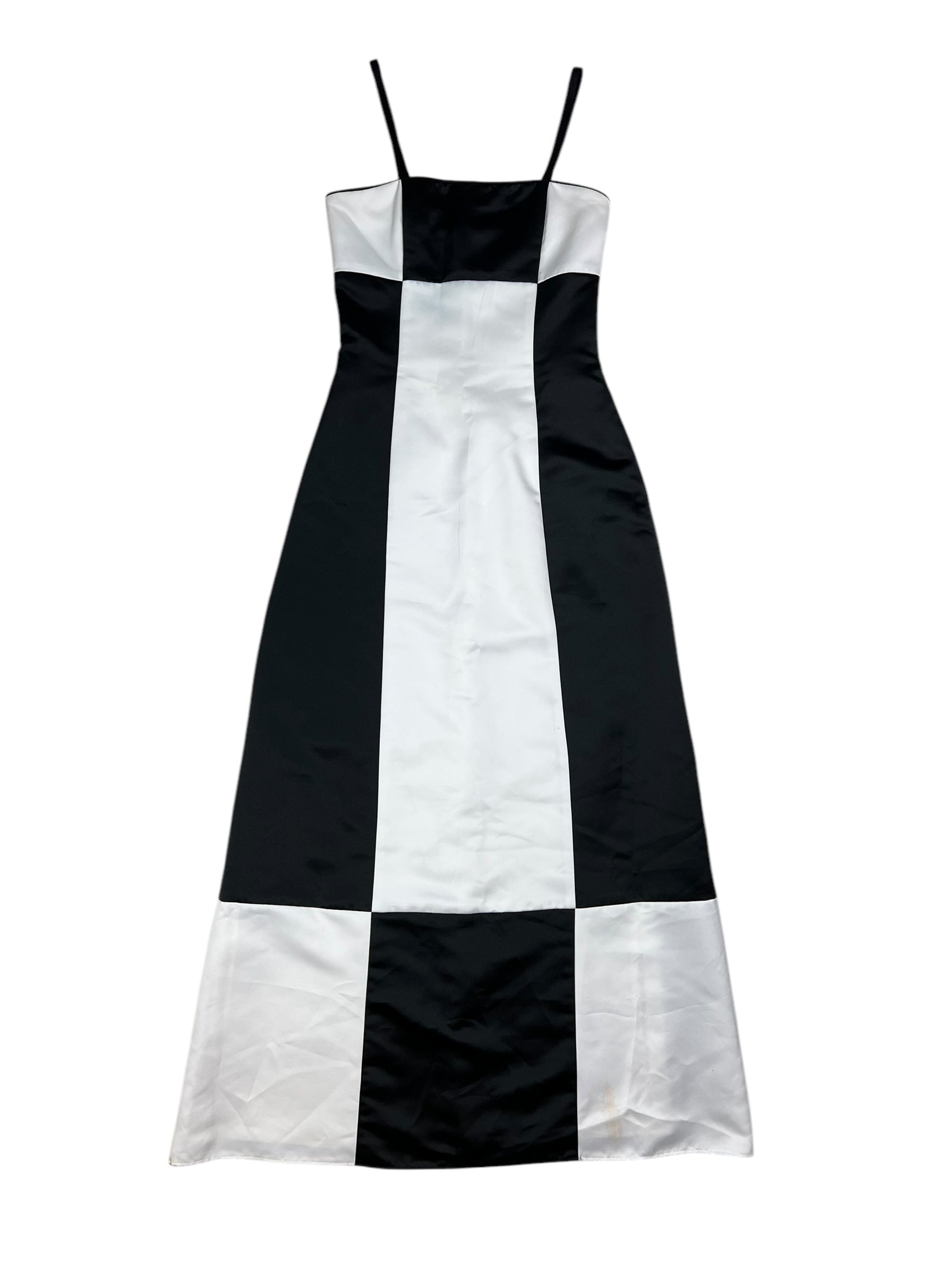 1990s Jessica McClintock monochrome gown. Fits modern UK8. The adjustable straps have been added but can be tucked in and do not show. All details below: