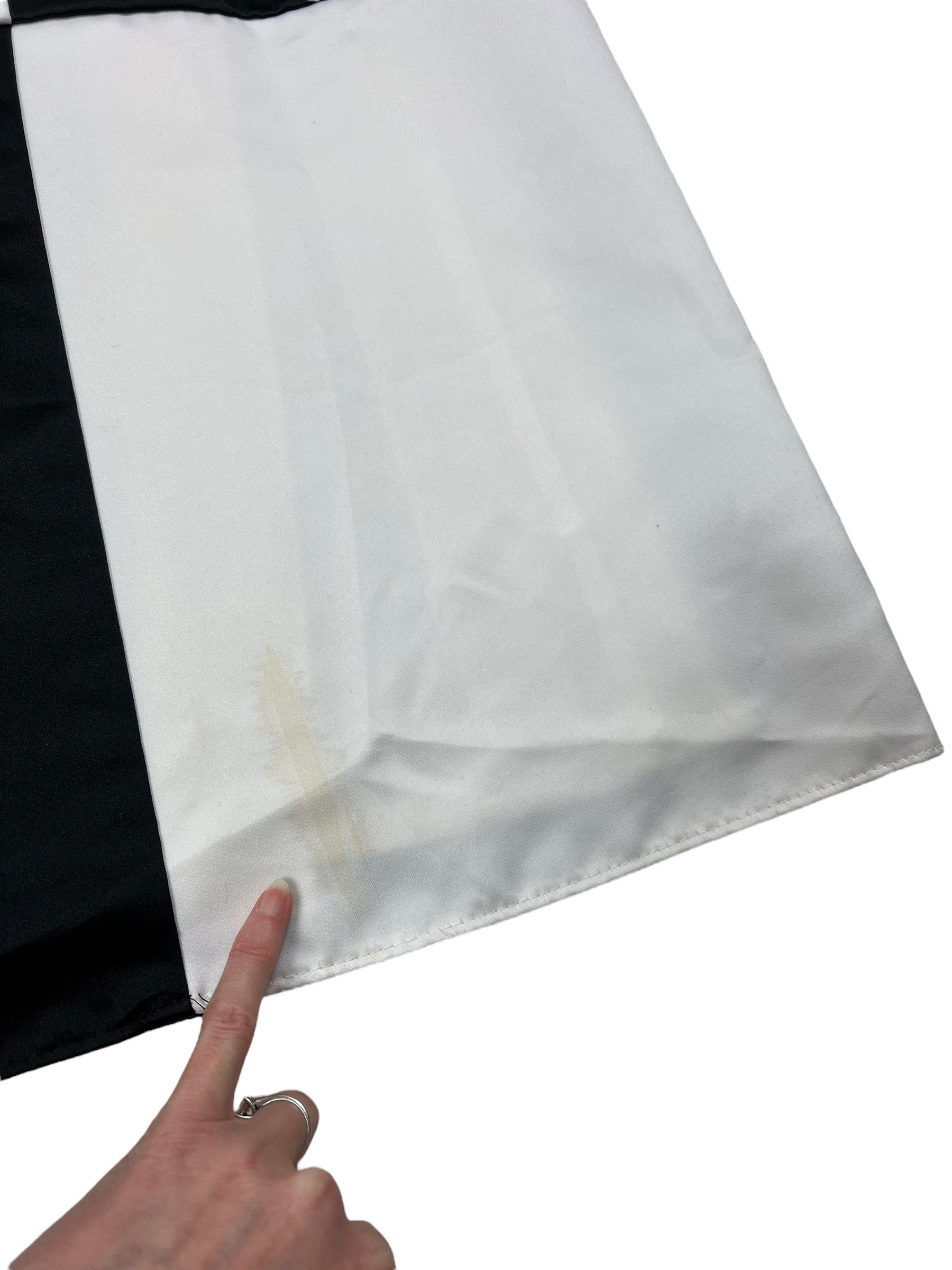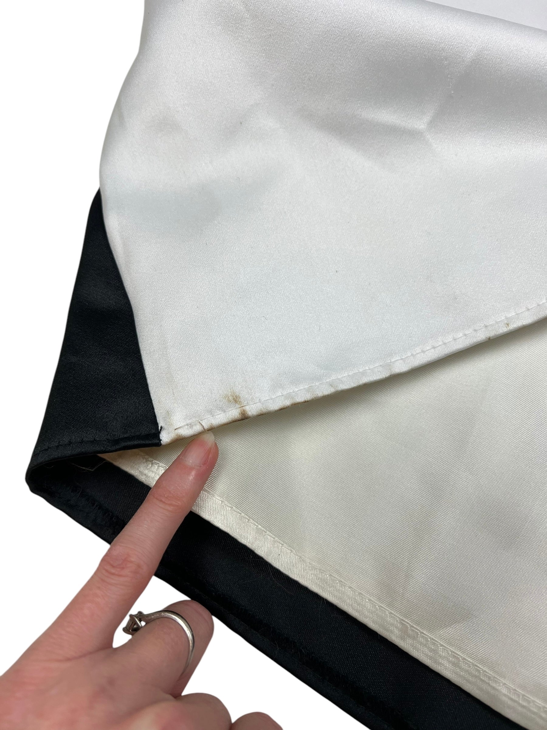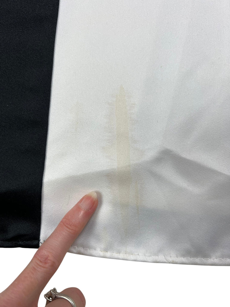 🐥 Condition is good overall but with some light stains. Very subtle colour variation to white material just along the seam under arms - not noticeable when worn. Some white residue on the black edge of seams under arms - again, only subtle. Small spot marks and a very faint blueish tinge stain on white part below right chest. A large but faint-in-colour mark at the bottom of the dress. Professional dry clean only. 100% polyester outer. Lining 100% acetate.