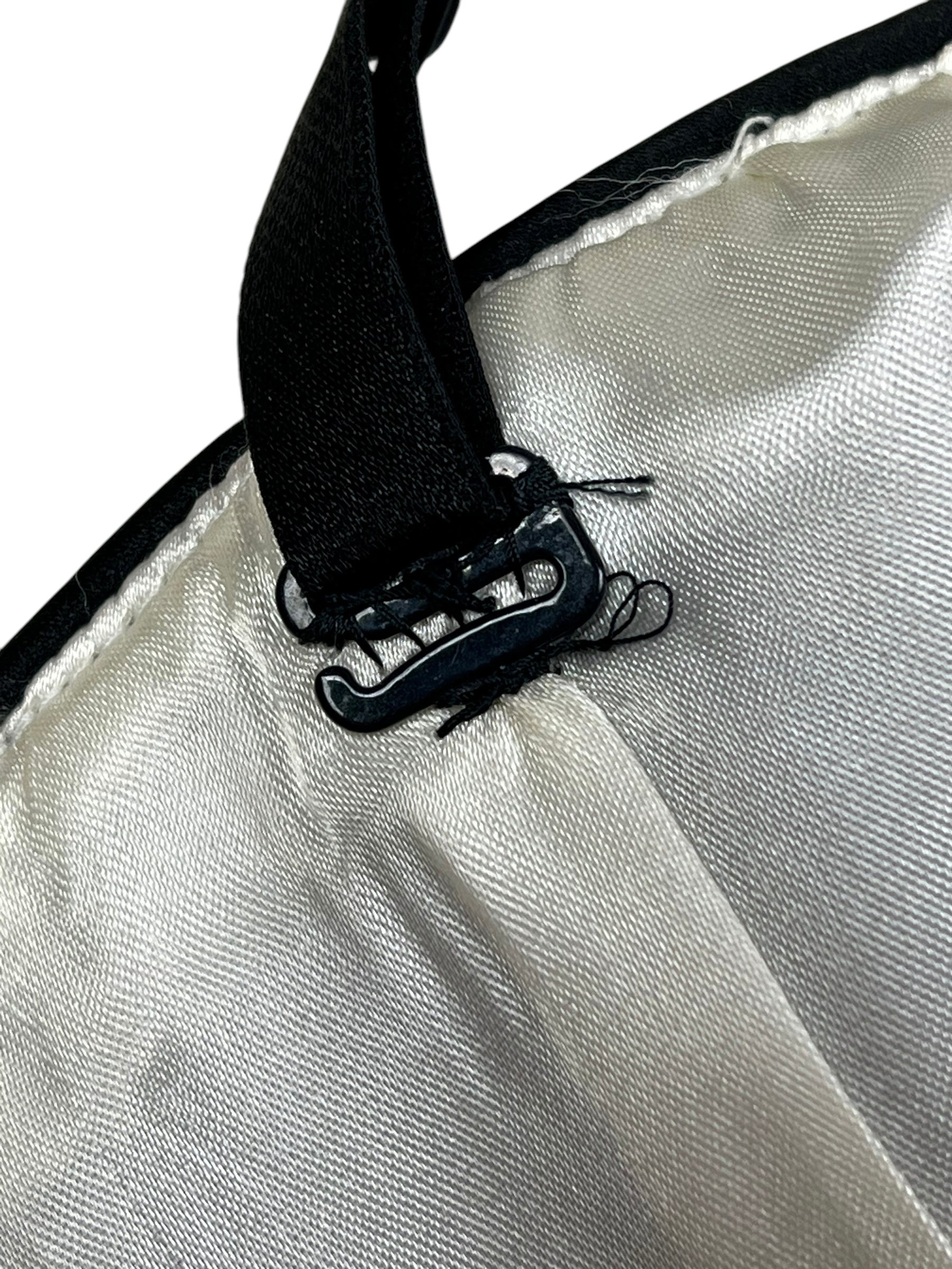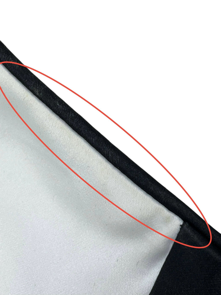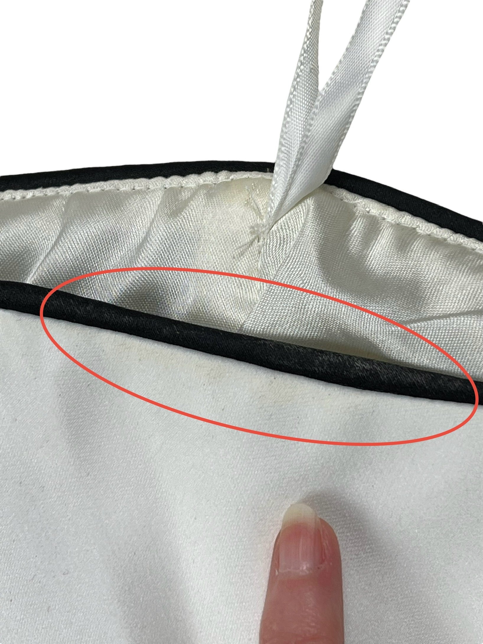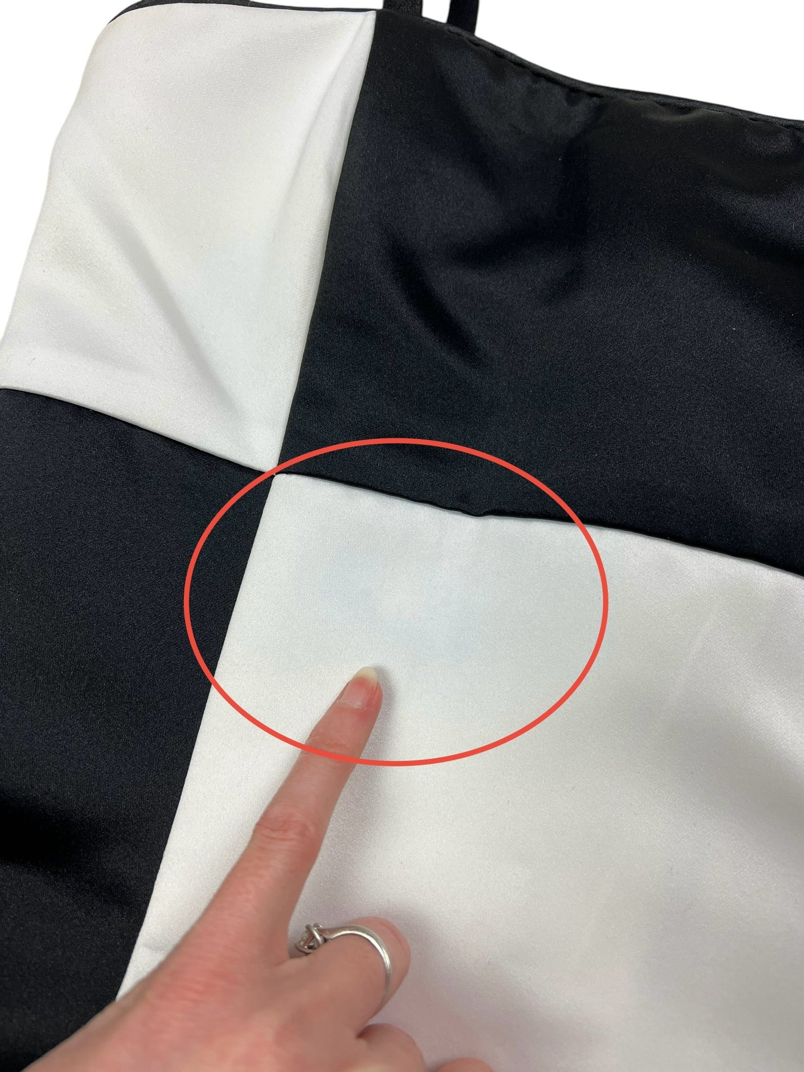 🐥 Condition is good overall but with some light stains. Very subtle colour variation to white material just along the seam under arms - not noticeable when worn. Some white residue on the black edge of seams under arms - again, only subtle. Small spot marks and a very faint blueish tinge stain on white part below right chest. A large but faint-in-colour mark at the bottom of the dress. Professional dry clean only. 100% polyester outer. Lining 100% acetate.
