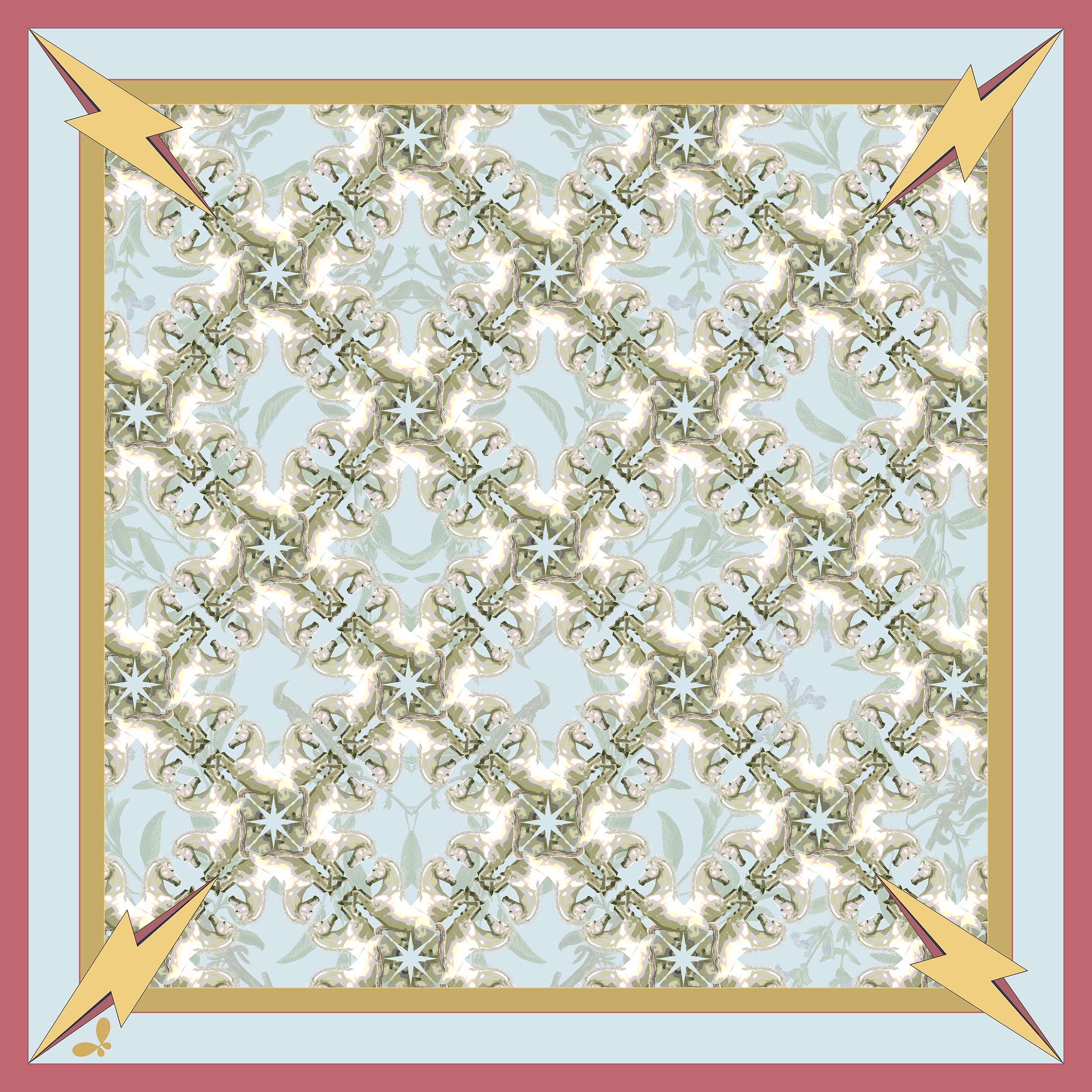 Silk bandana featuring a repeat horse and star print; lightning flashes in each corner.