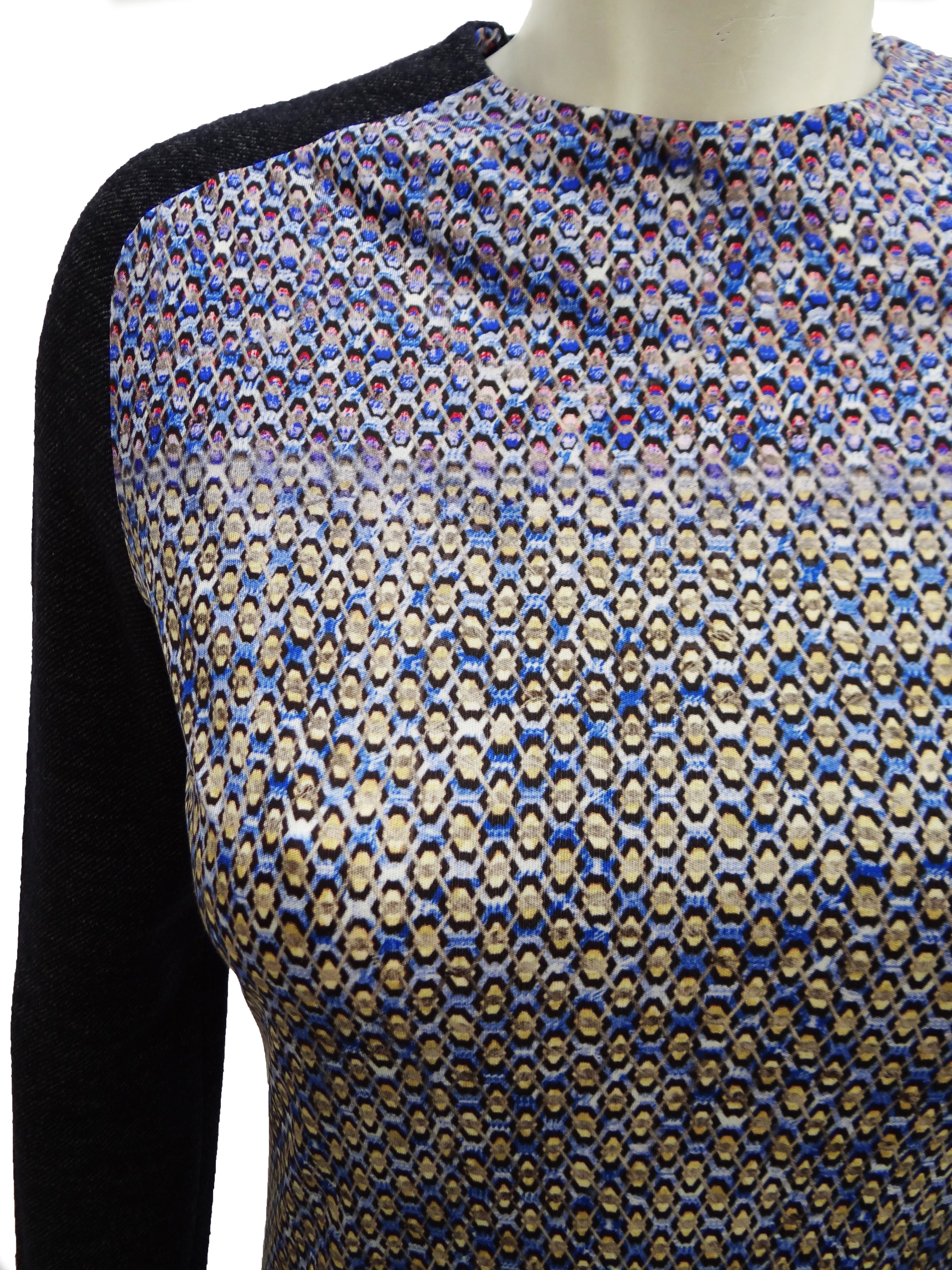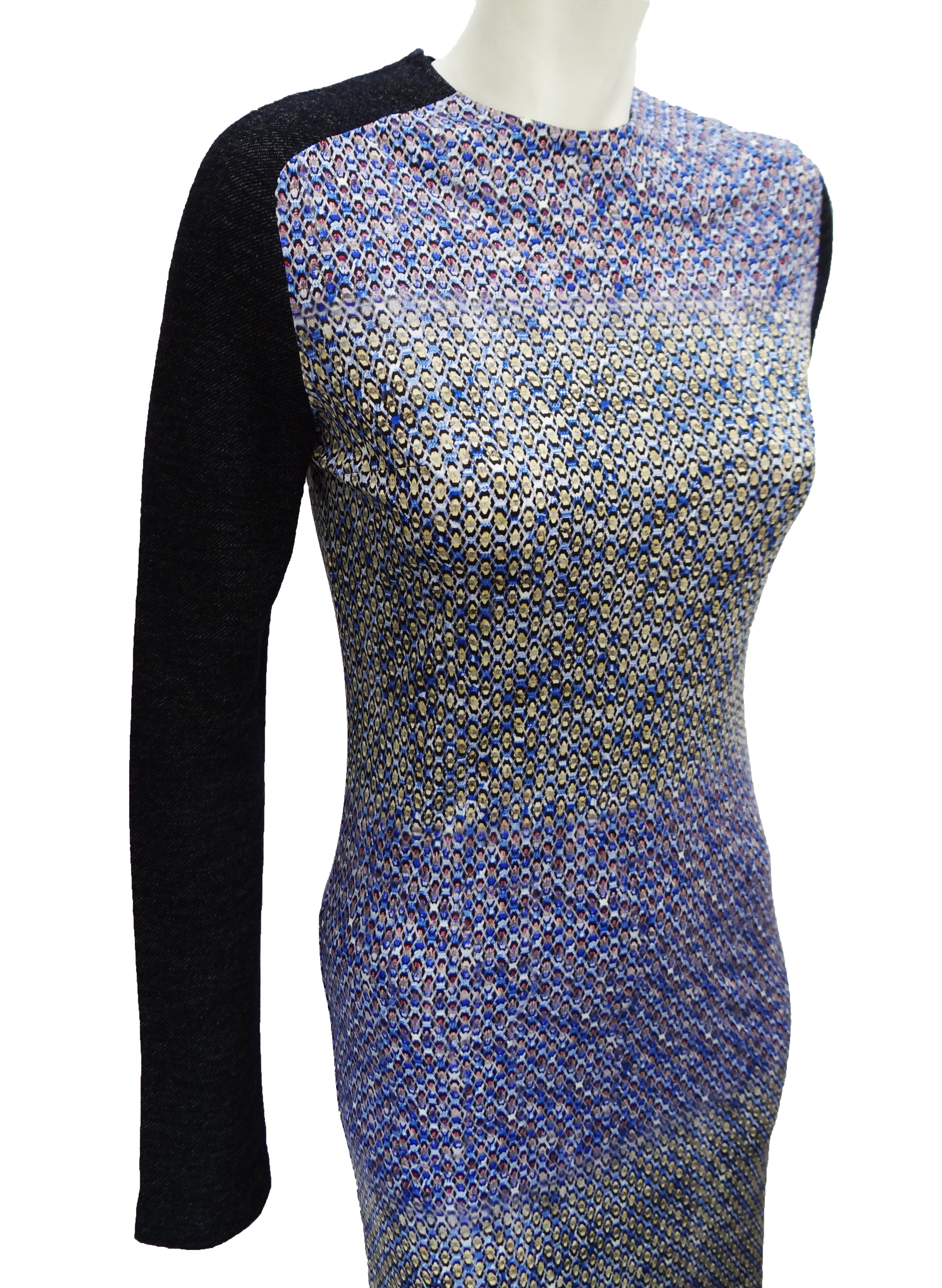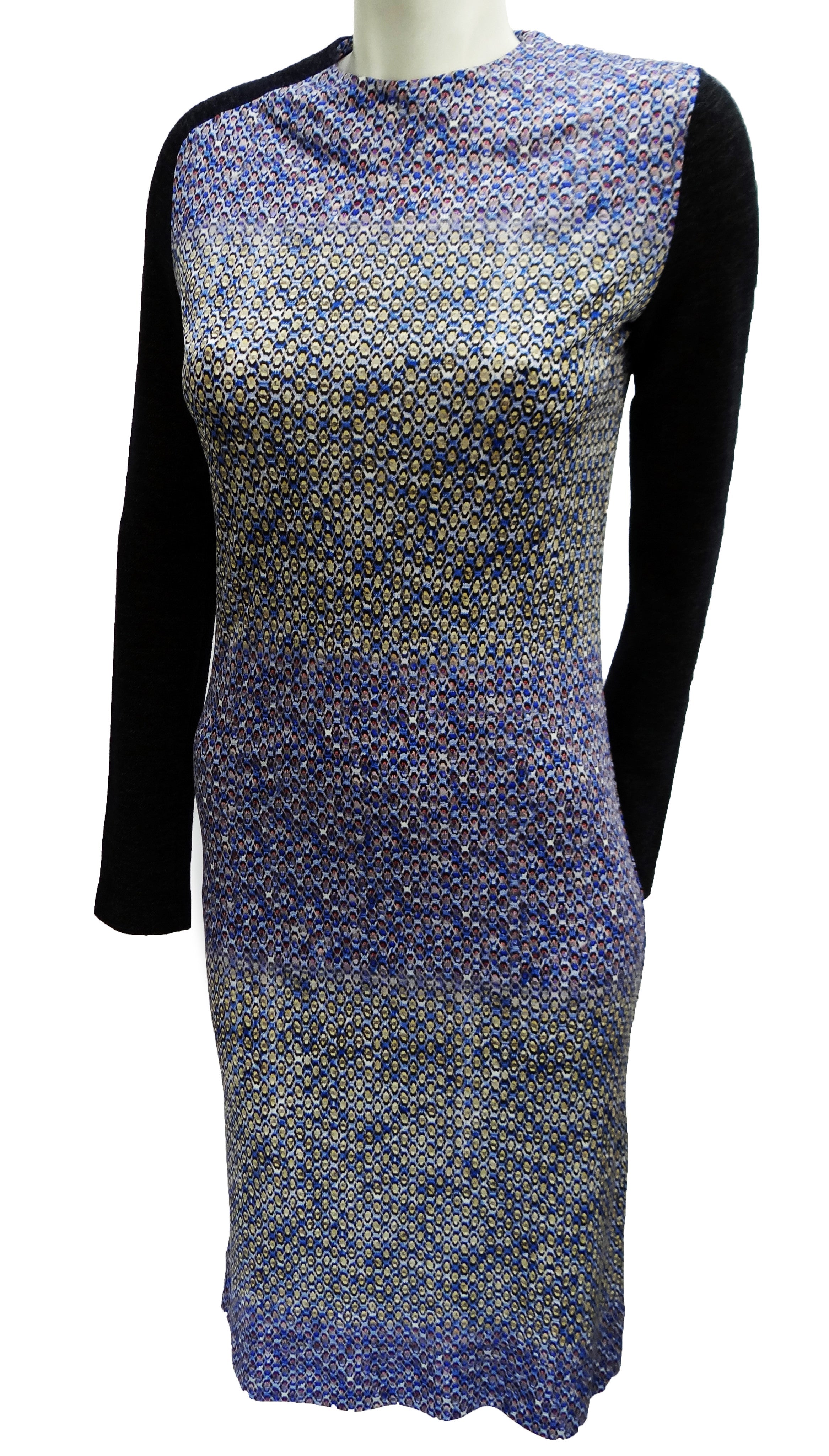 A chic jersey silk sheath dress by Peter Pilotto, in laser print geometric pattern, a lovely abstract print which is vaguely aquatic, in predominantly blue tones with reds & yellows in subtle horizontal bands down the body.