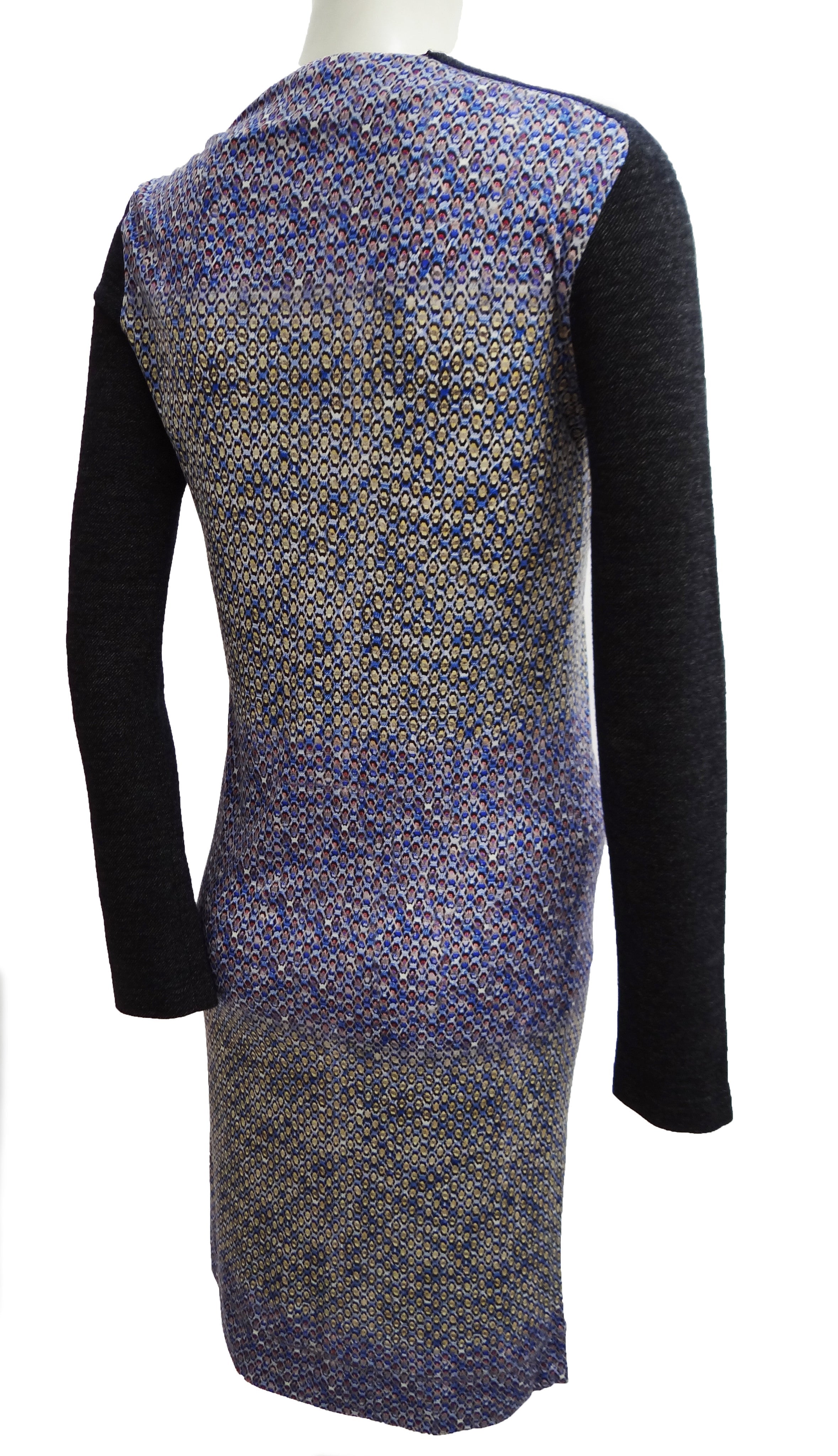 It has a simple round neck with long sleeves in contrasting grey knit fabric, one of which is regular and the other raglan, concealing a side neck zip. It hugs the figure straight to just below the knee. Unlined.