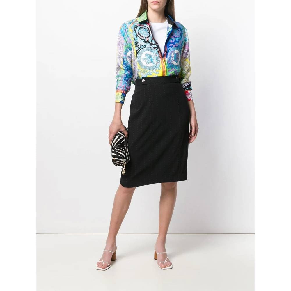 Salvatore Ferragamo pinstriped black virgin wool high waist skirt. Decorative front buttons and hook and zip side closure.