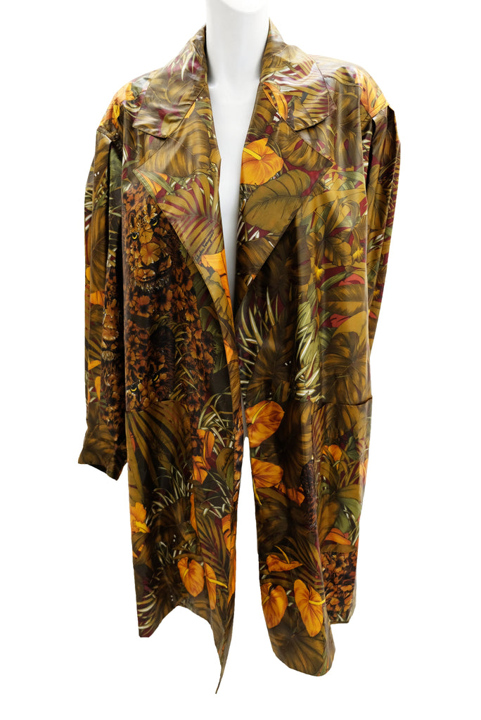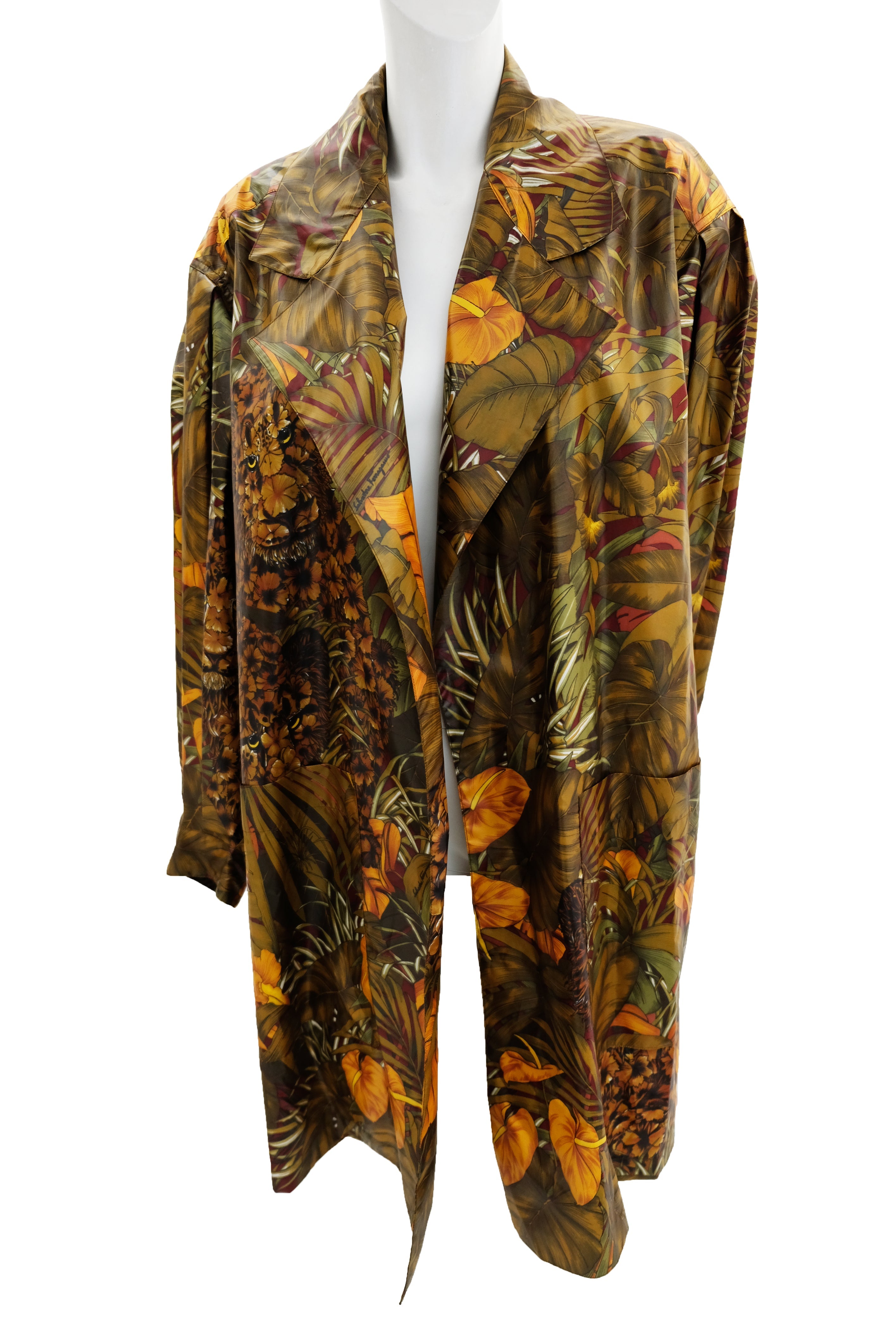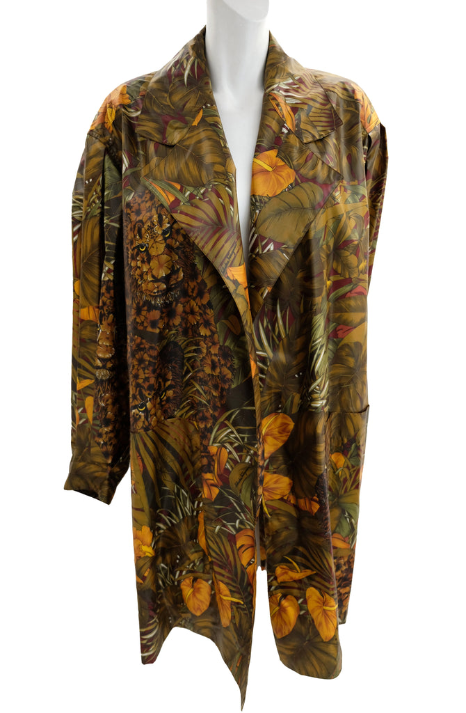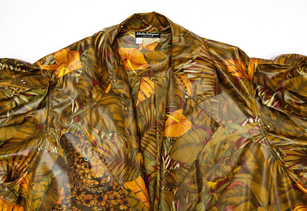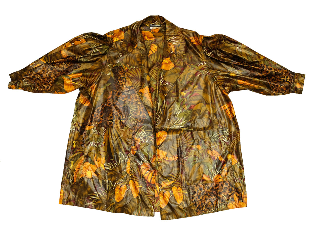 A marvellous swing coat by Salvatore Ferragamo in luscious jungle print coated polyester fabric. Fabulous print of jungle cats, palms and foliage in olive green tones with orange highlights.
