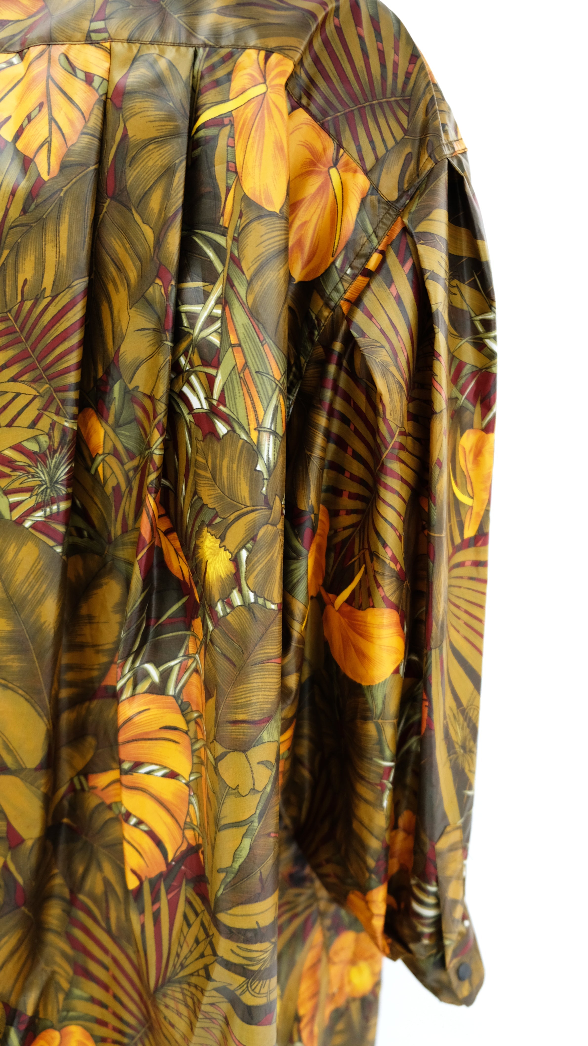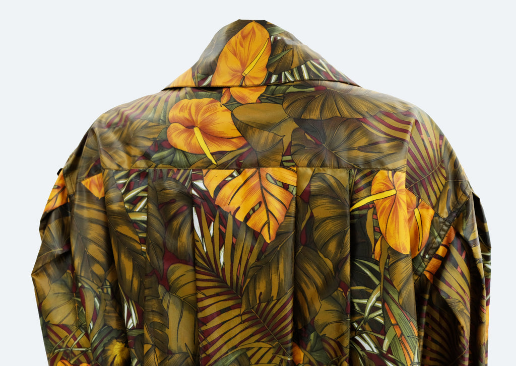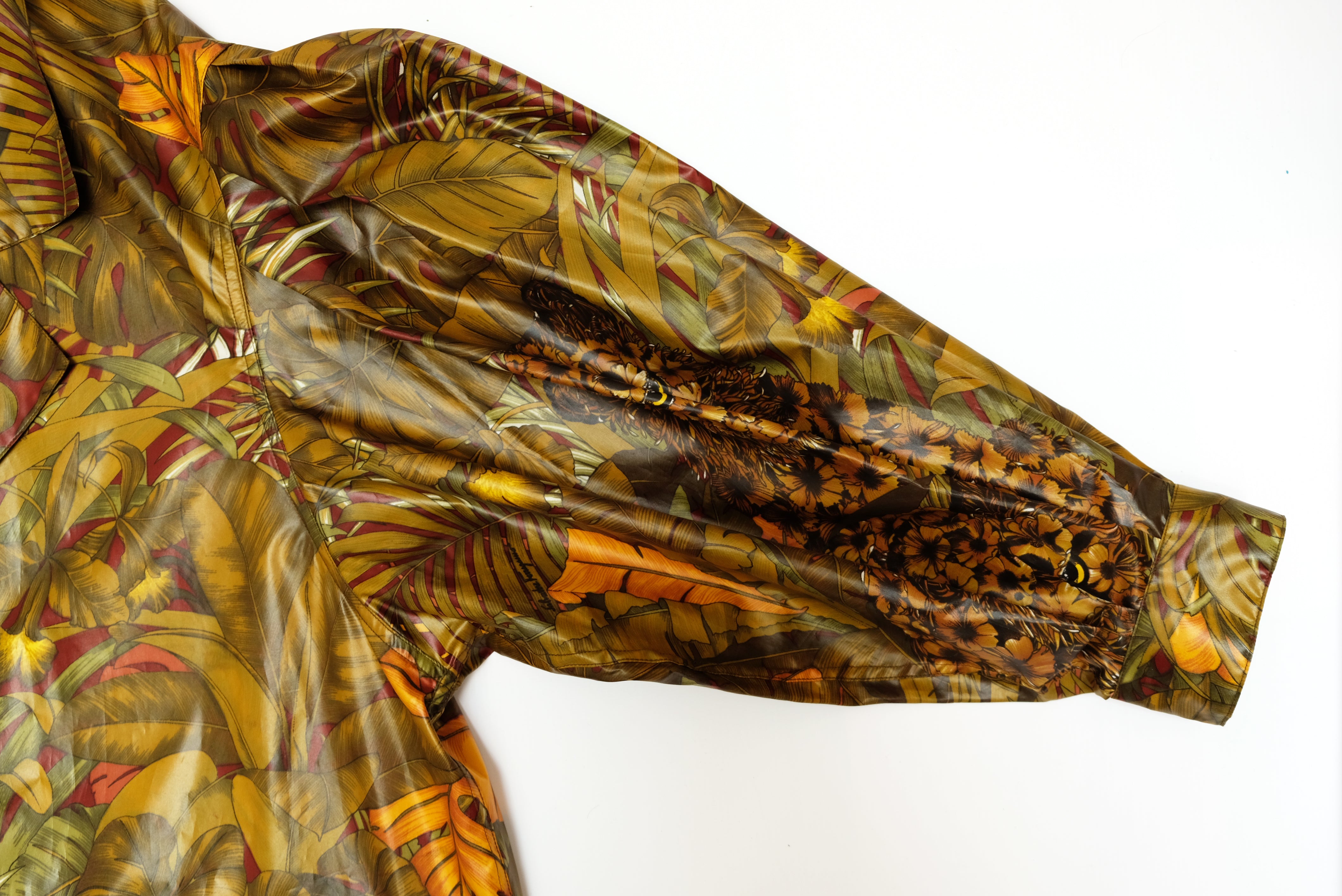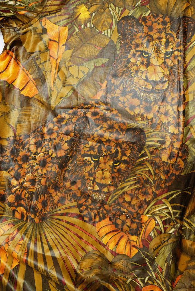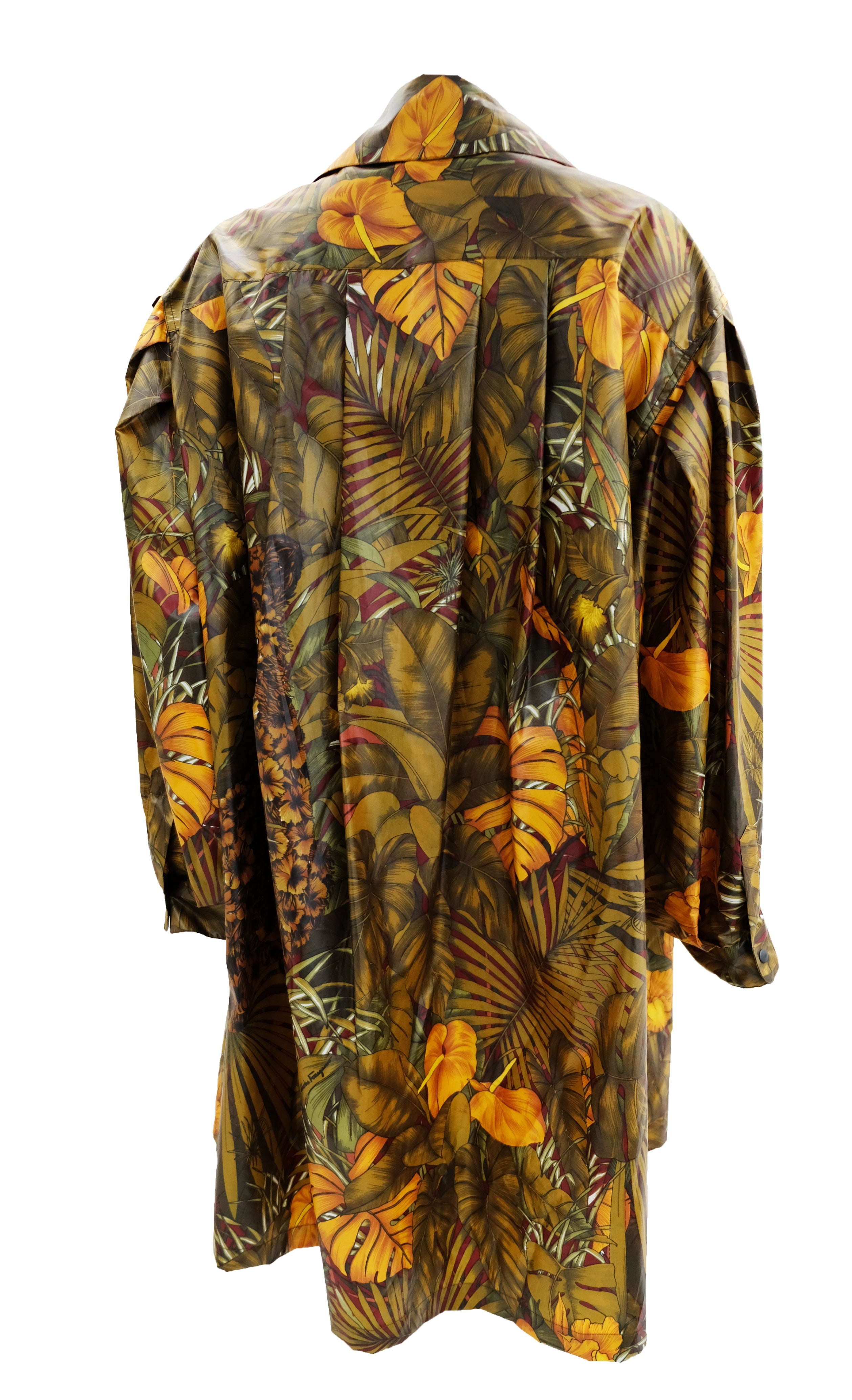 A marvellous swing coat by Salvatore Ferragamo in luscious jungle print coated polyester fabric. Fabulous print of jungle cats, palms and foliage in olive green tones with orange highlights.