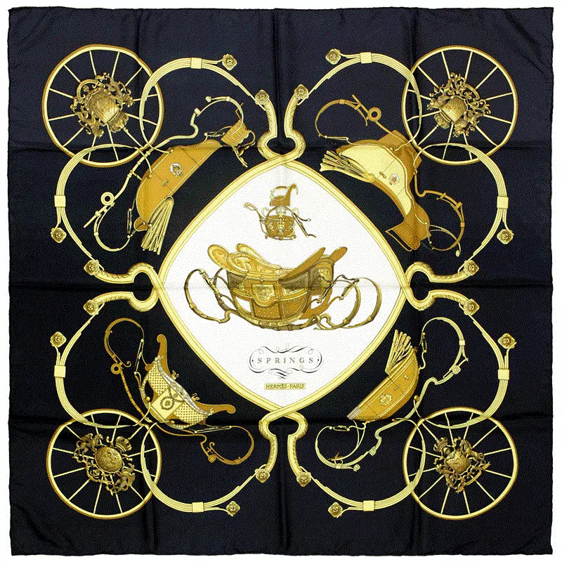 1974 Hermès Black “Springs” by Philippe Ledoux 90cm Silk Twill Scarf
