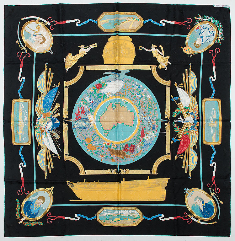 1992 Hermès Black “Geographe” by Sandra Laroche Silk Jacquard Scarf