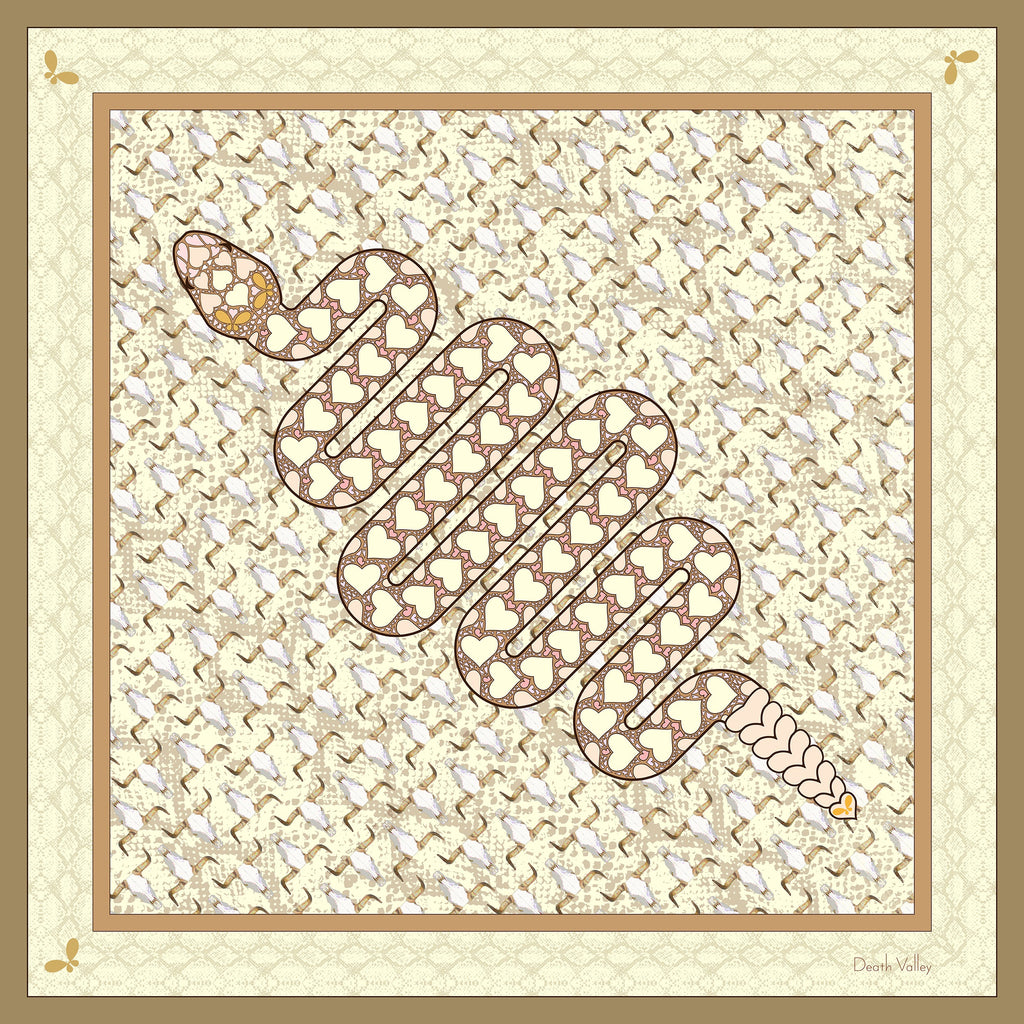 A swirl of snakeskin and goats skulls. Inspired by the extreme, barren and mysterious desert landscapes of Death Valley. Sheer, floaty and lightweight. Cream, ivory, sand and caramel shades.