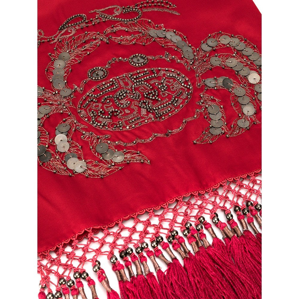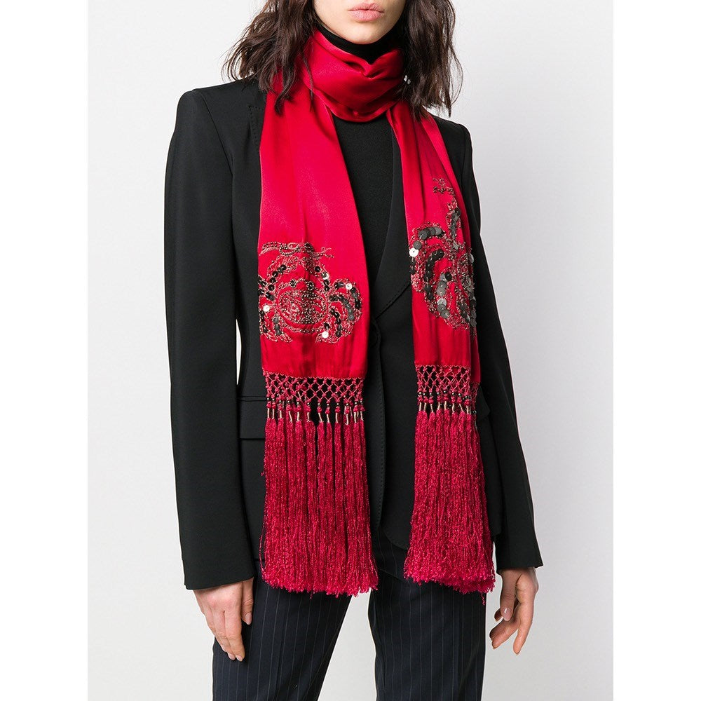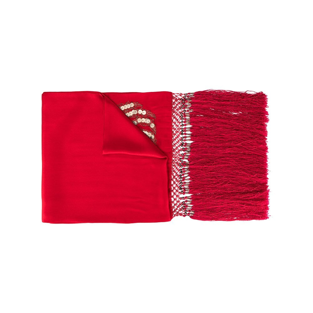 Giorgio Armani red silk scarf with embroidery, decorative applications and fringes on the hem. The items show some small flaws, as shown in the pictures.