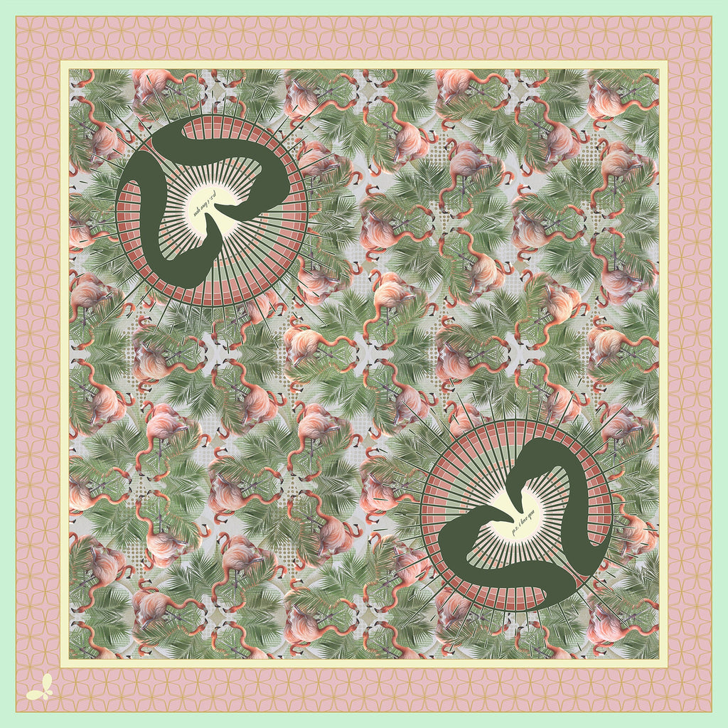Palm Springs lovers! Flamingo and palm print with mid century pattern. Printed using environmentally friendly inks with a hand finished hem.