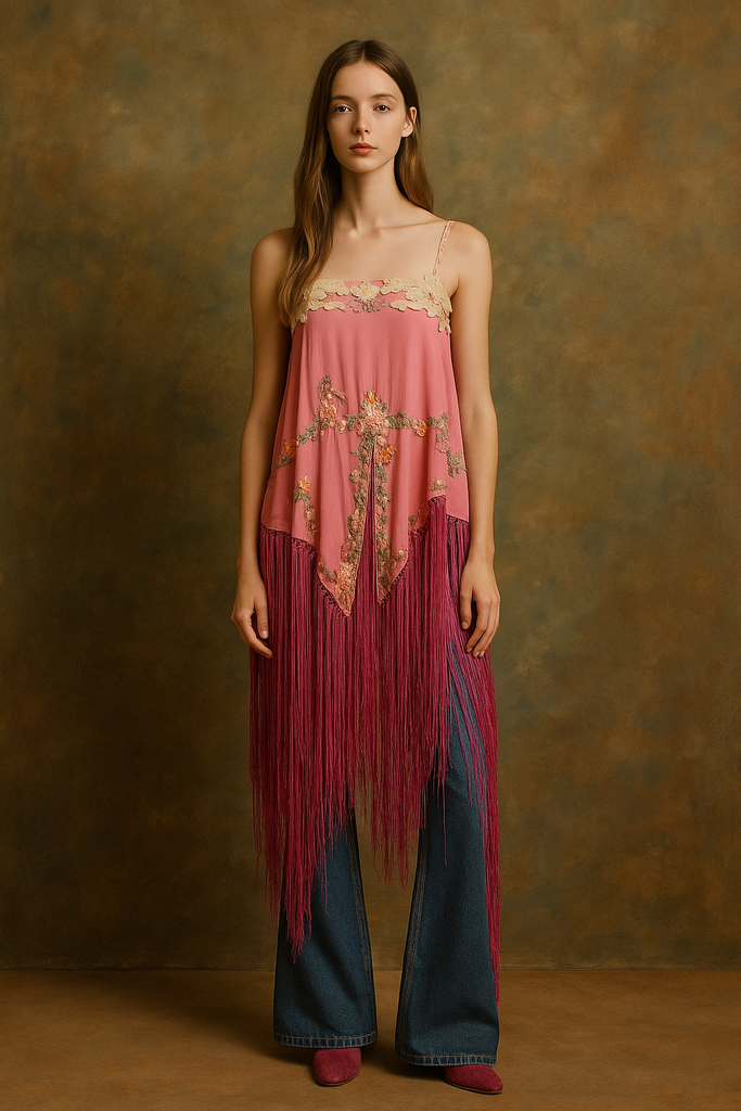 Odette, reworked 1930s pink embroidered floral scarf tunic
