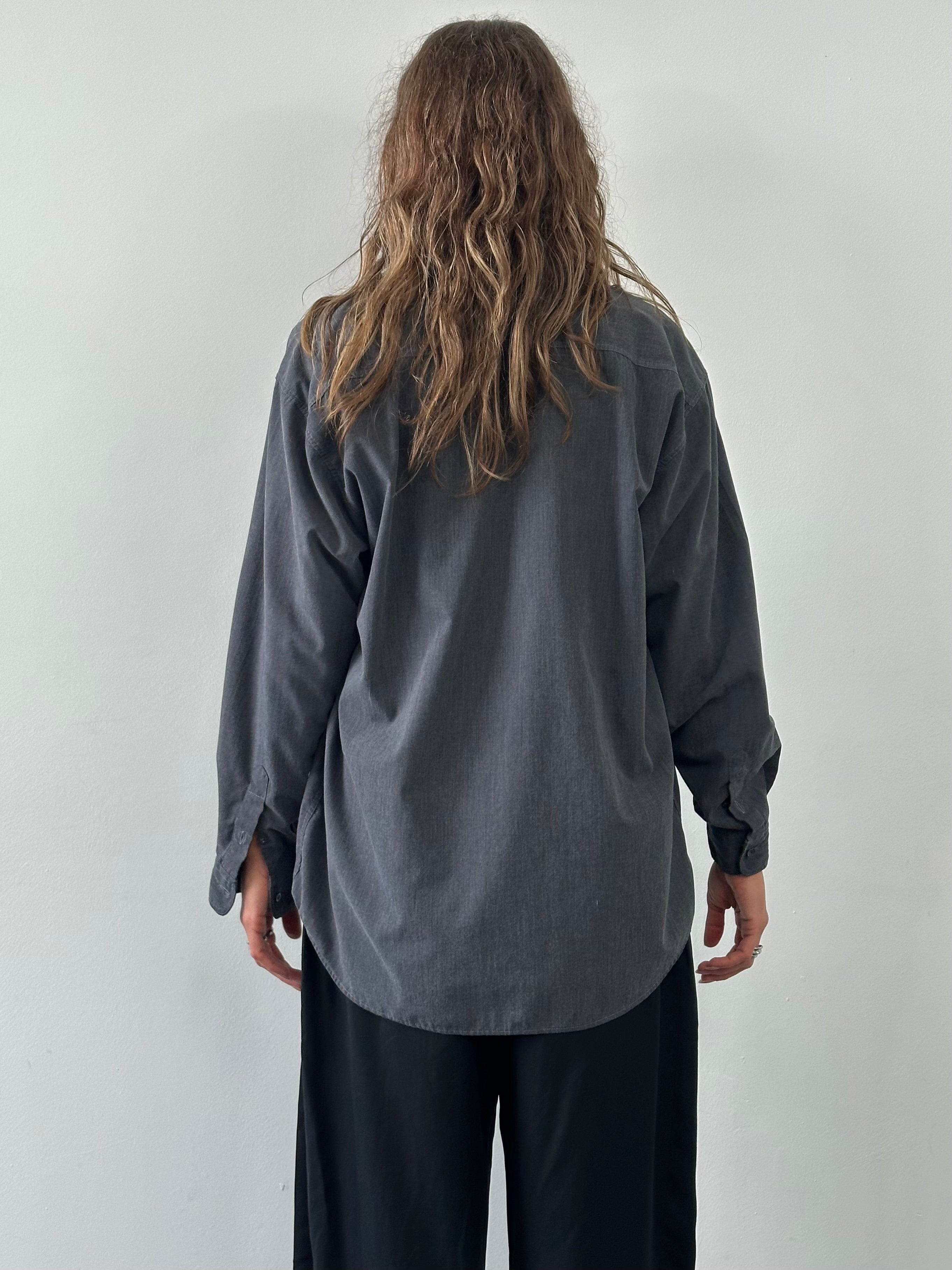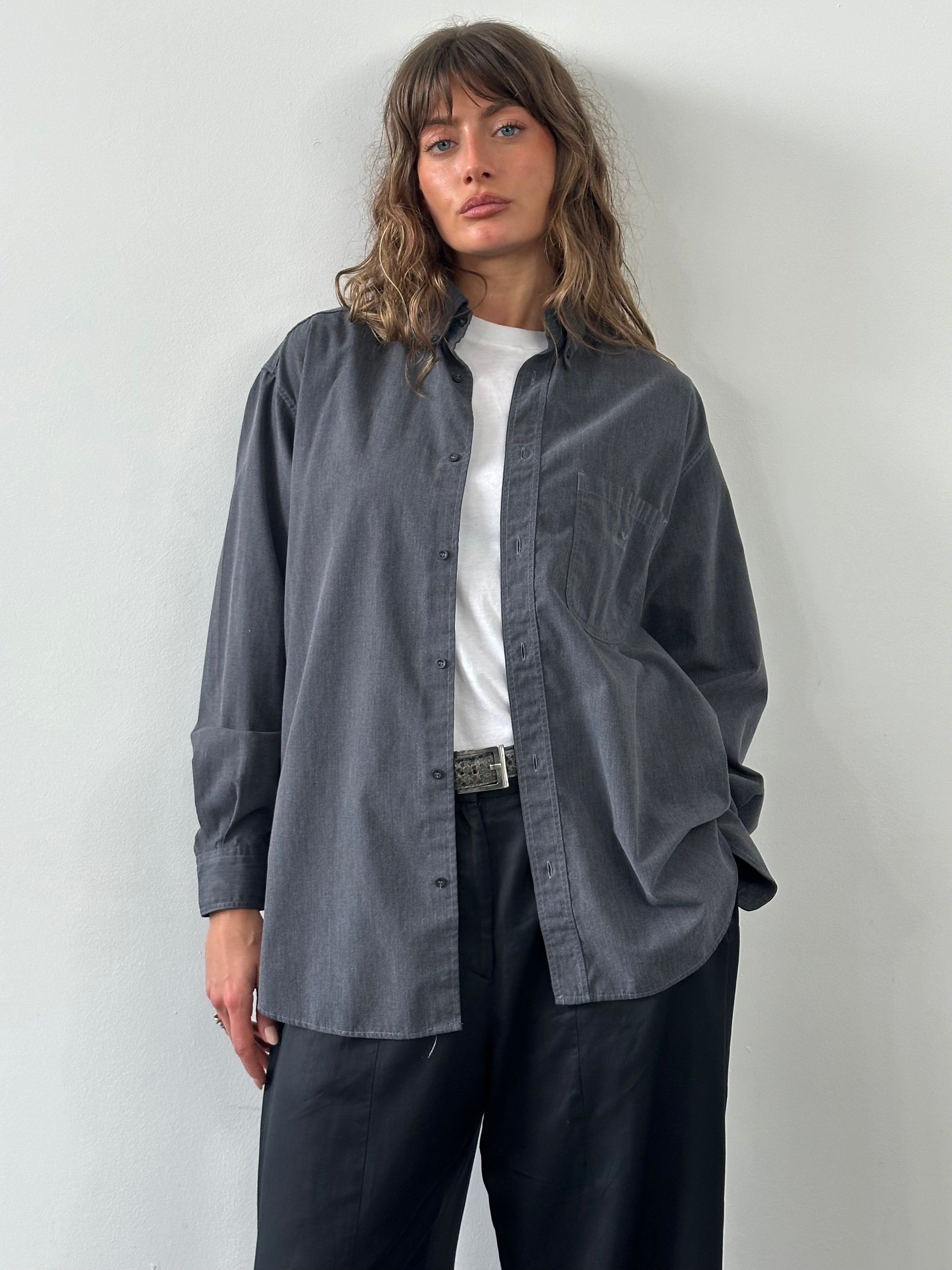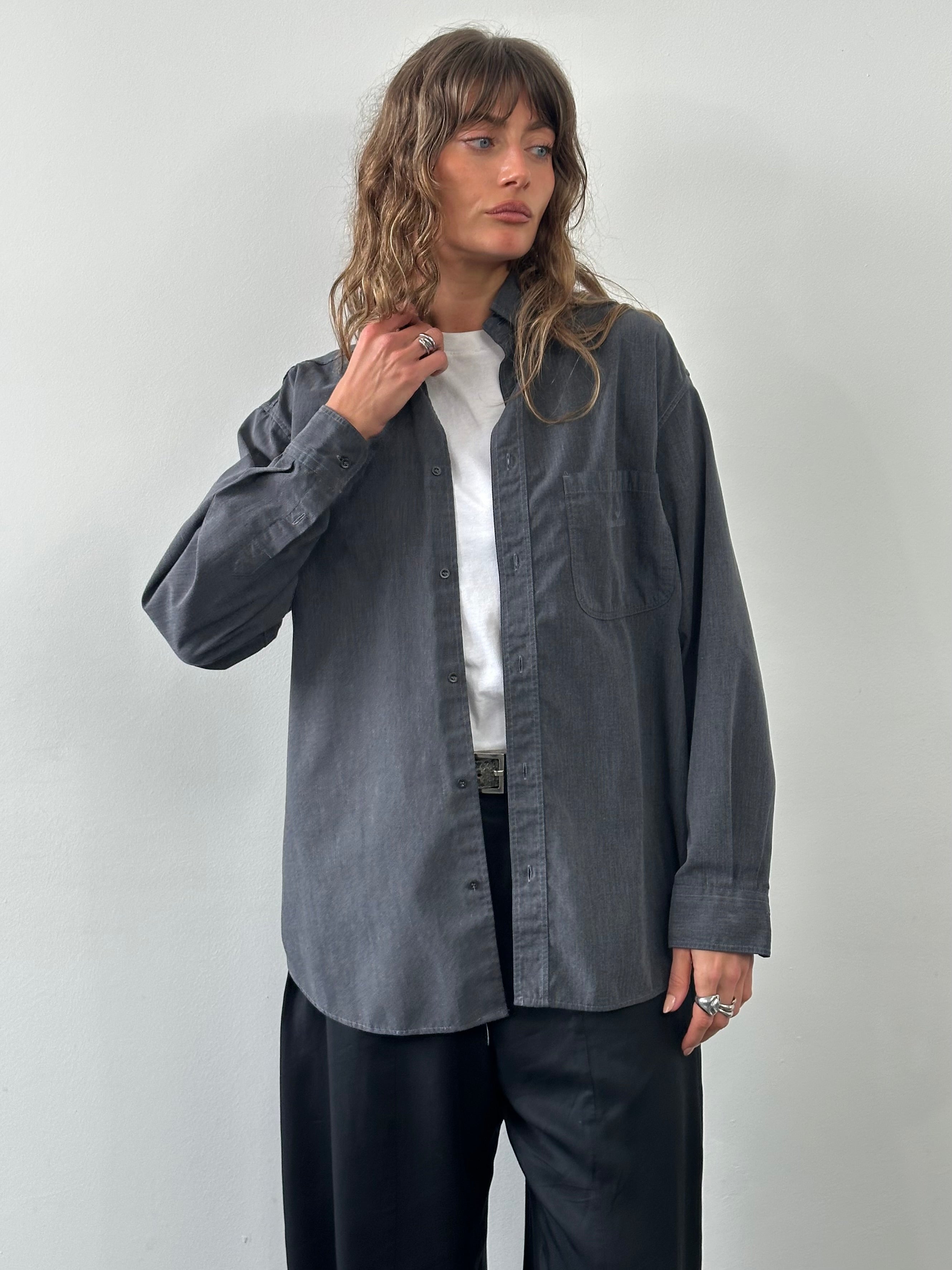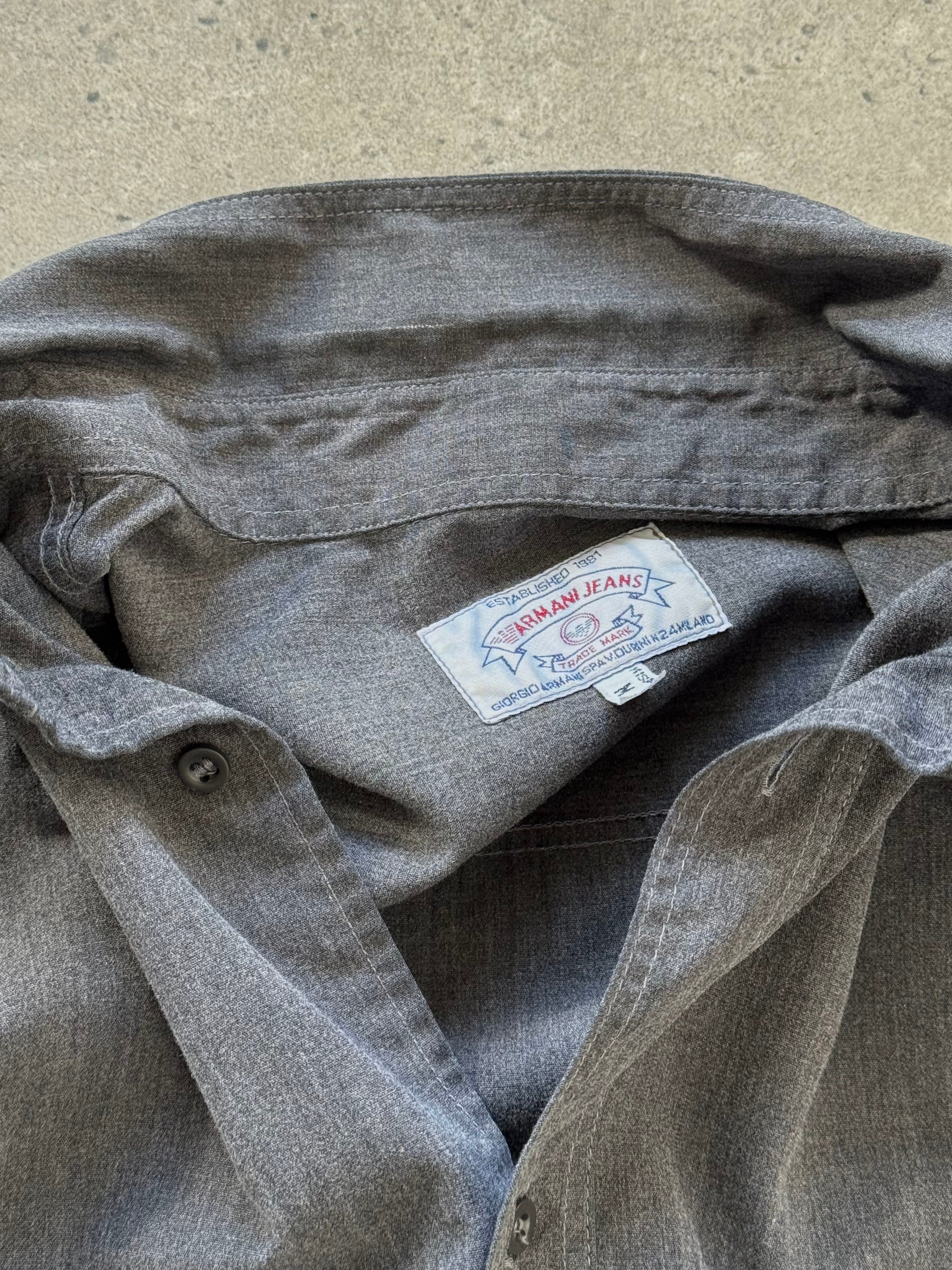 Vintage grey button down shirt by Armani Jeans featuring a subtle embroidered logo at the chest pocket and a relaxed classic collar. Cut in a soft cotton blend with a clean straight hem, reflecting late 1990s casual tailoring.