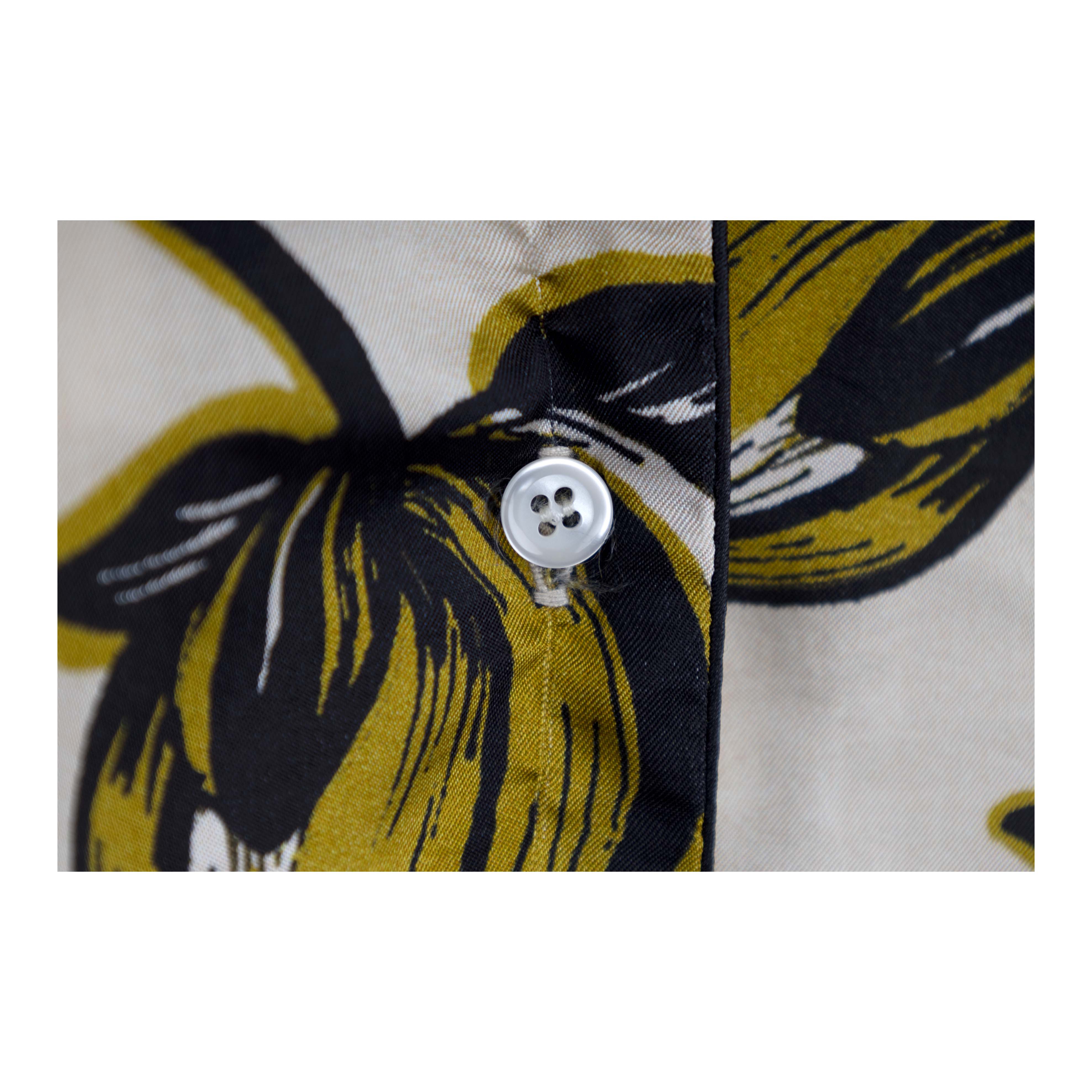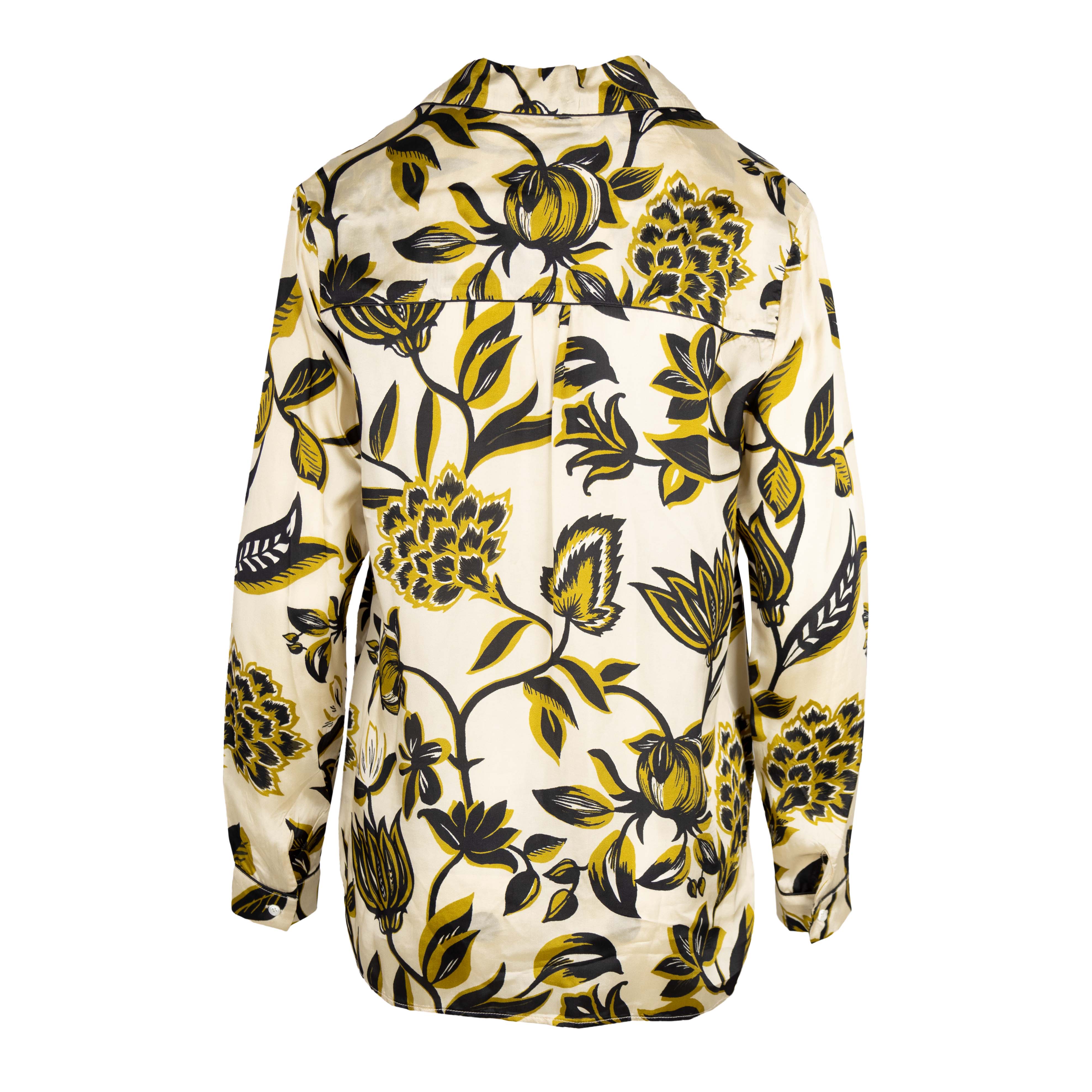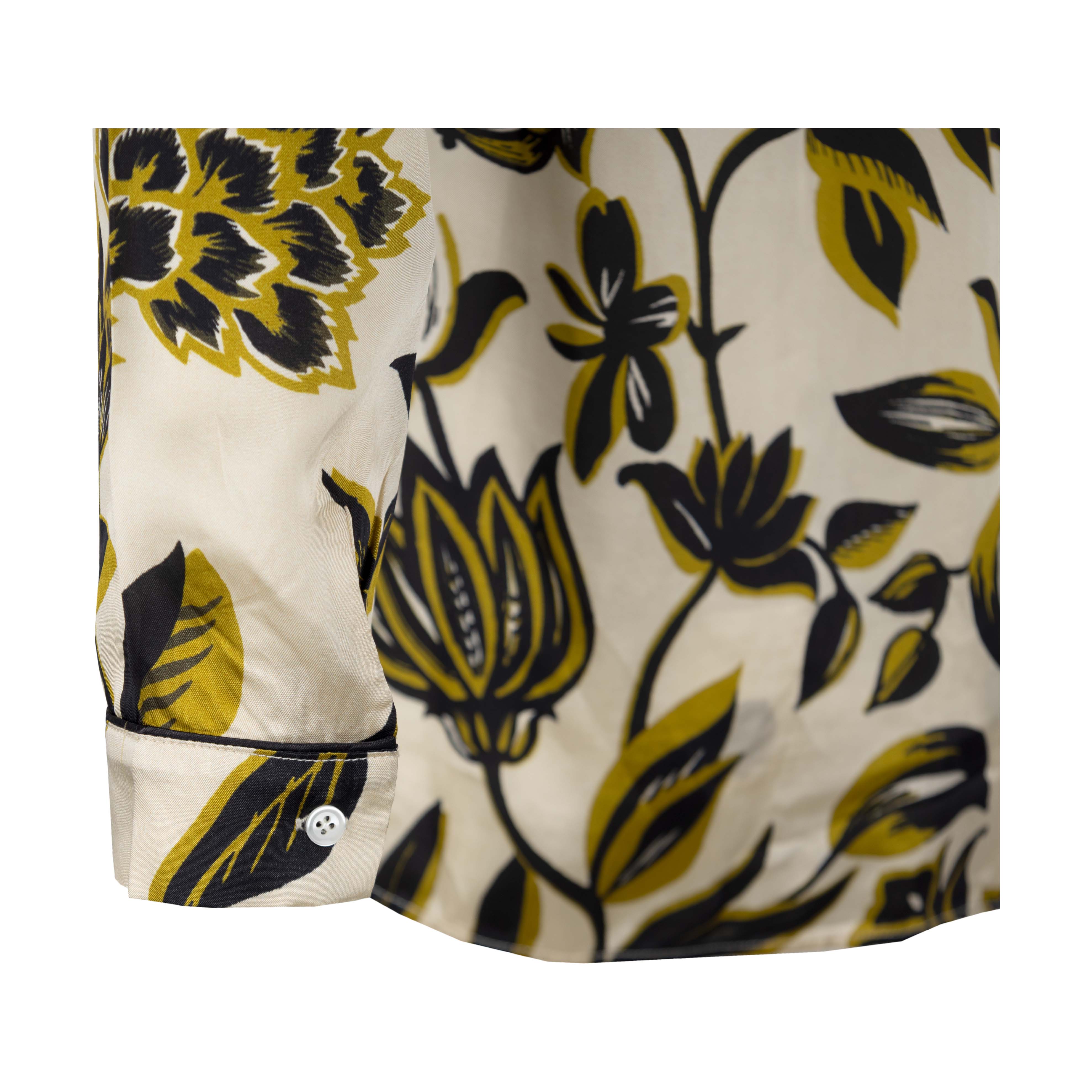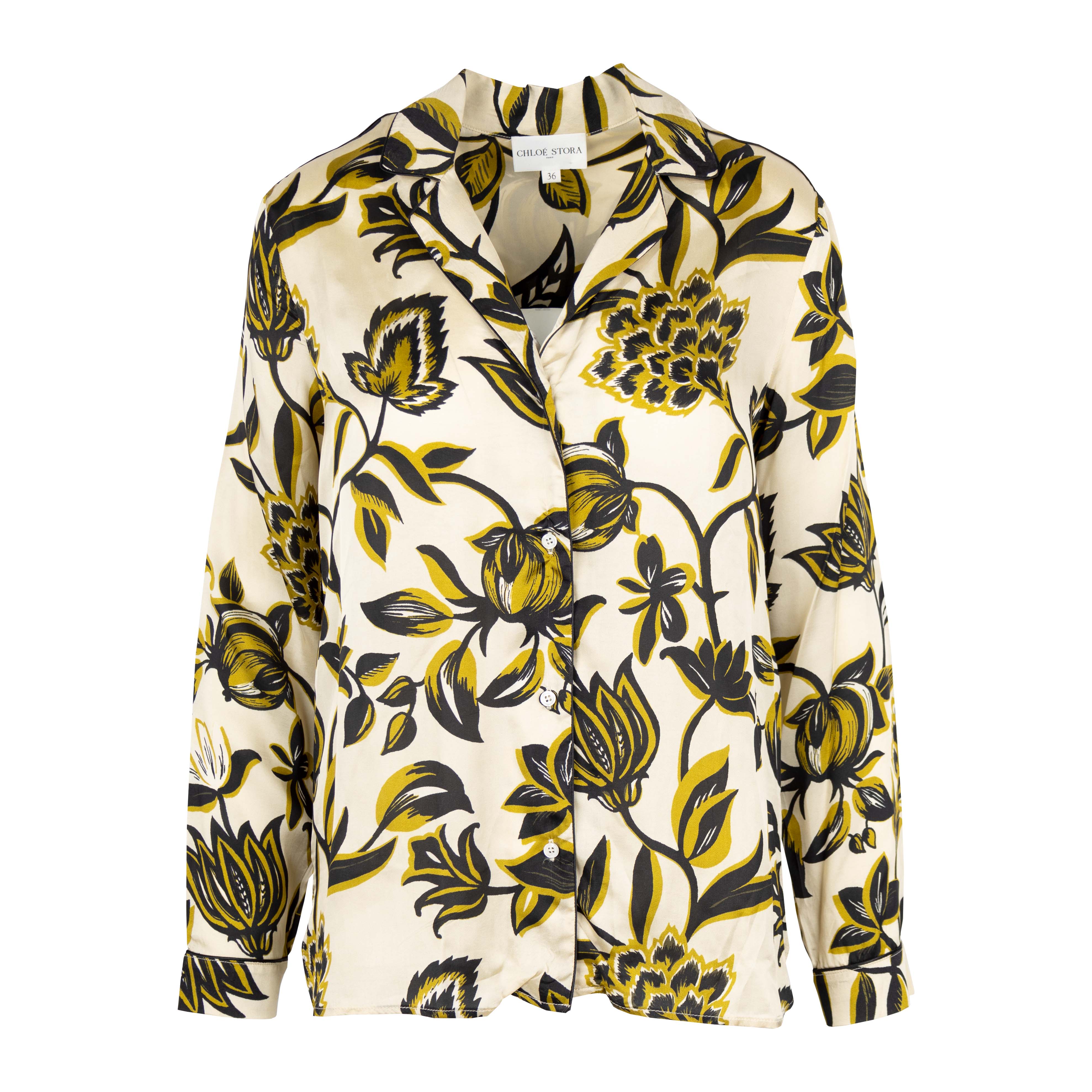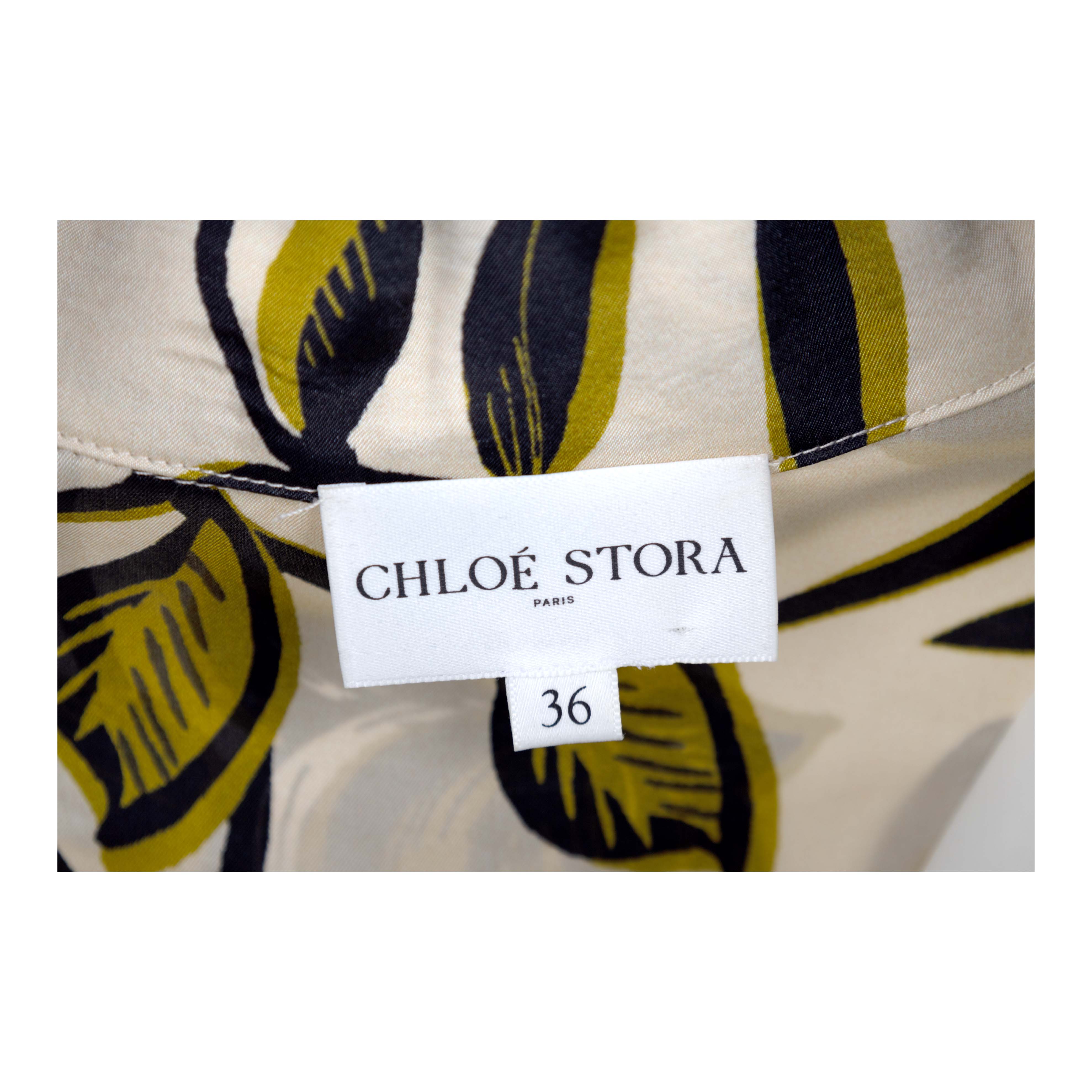This long-sleeved Chloé Stora shirt features a vibrant, multi-green tonal floral print on an off-white fabric. Designed with a tailored collar and stylishly hemmed cuffs and collar in black, this shirt offers a classic button-down style with a soft-touch fabric for superior comfort.