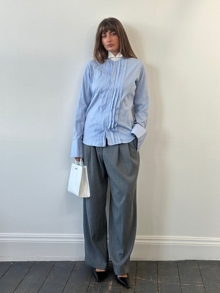 1980s light blue formal Christian Dior Monsieur tuxedo shirt with a contrasting white collar and smooth pleated front, offering a refined vintage Dior silhouette.