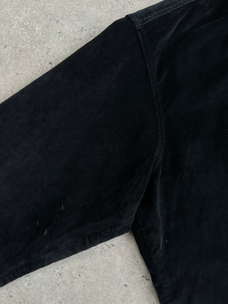 Italian vintage minimal black velvet shirt from Energie with a soft drape and rounded collar. A clean Italian 1990s piece that brings a refined, understated mood to contemporary styling.