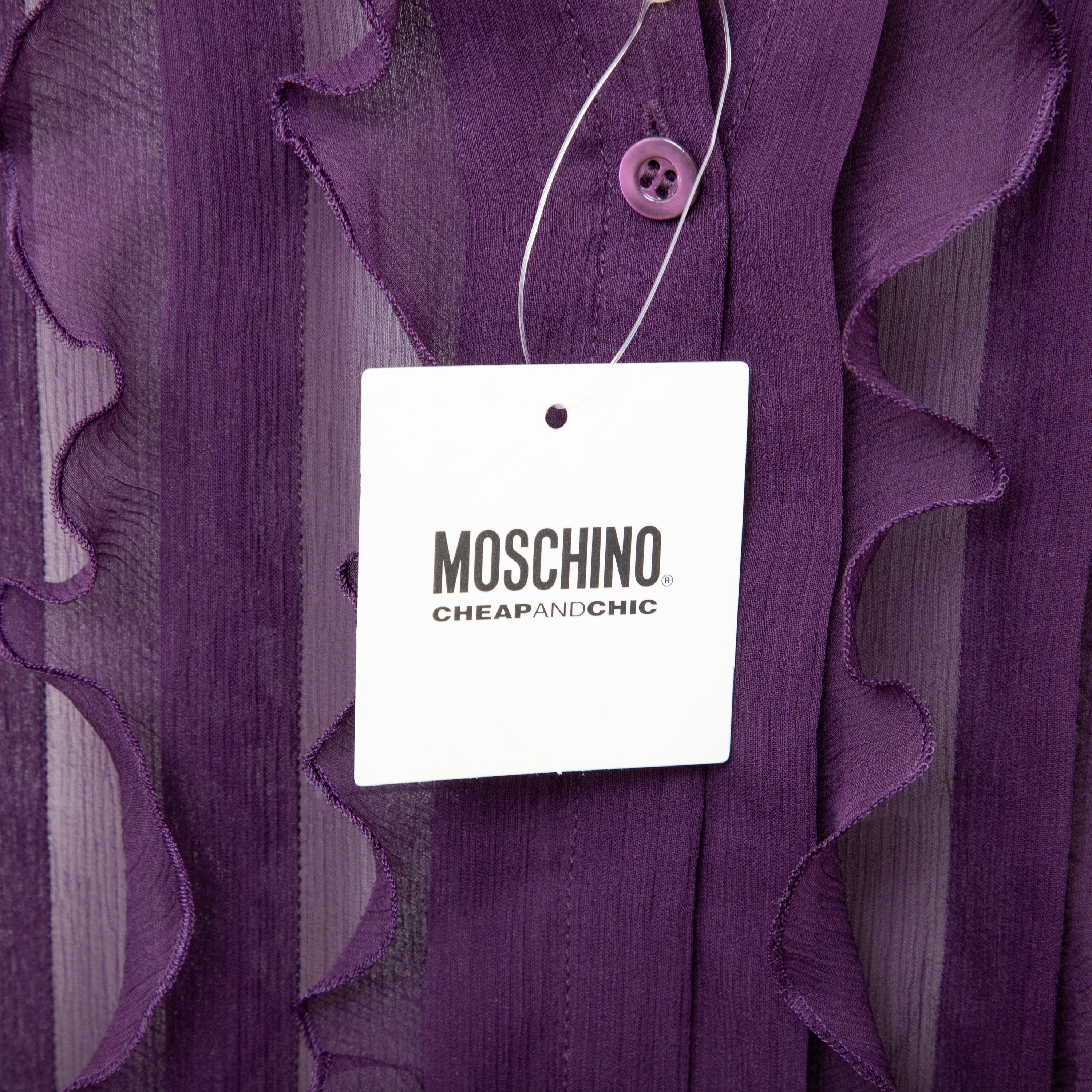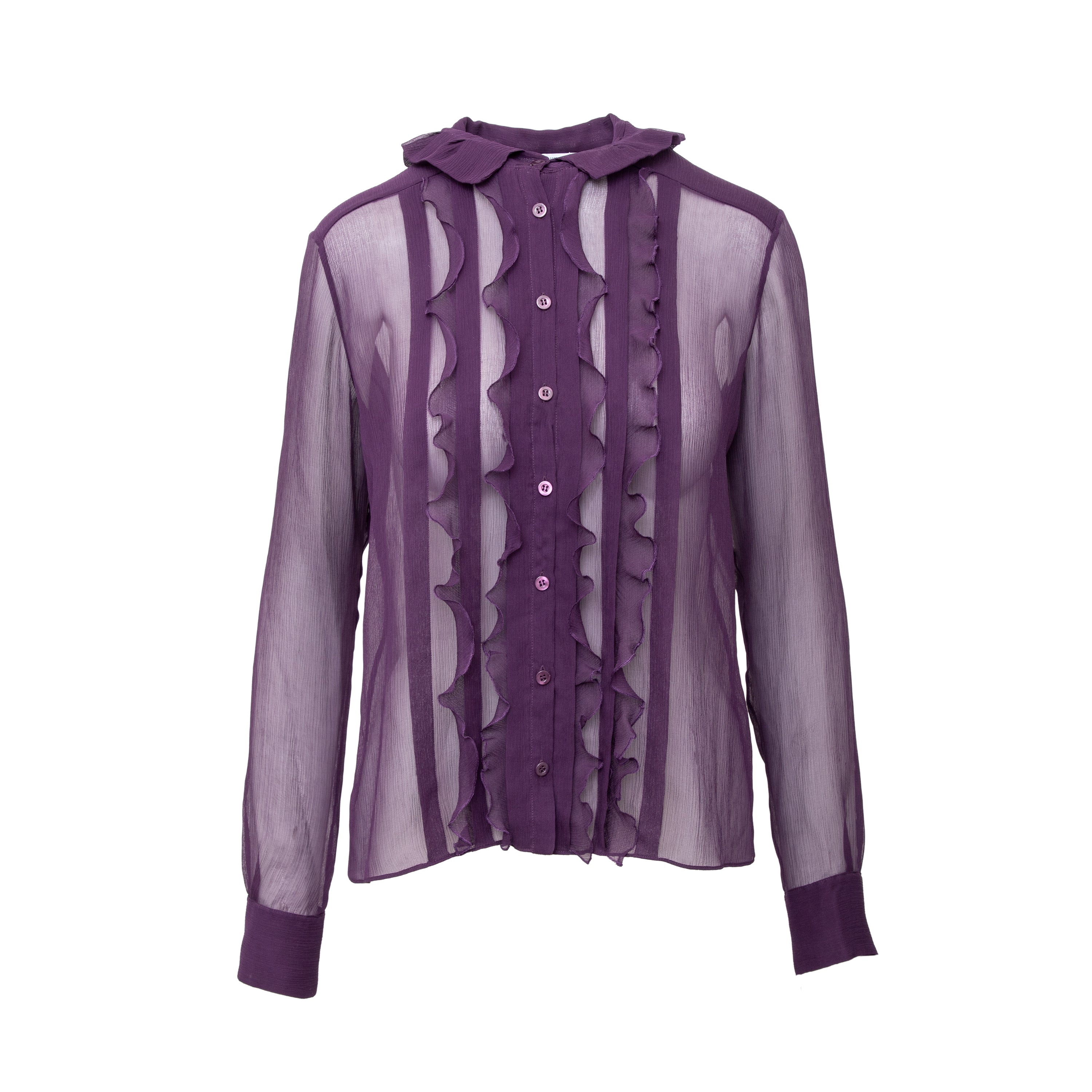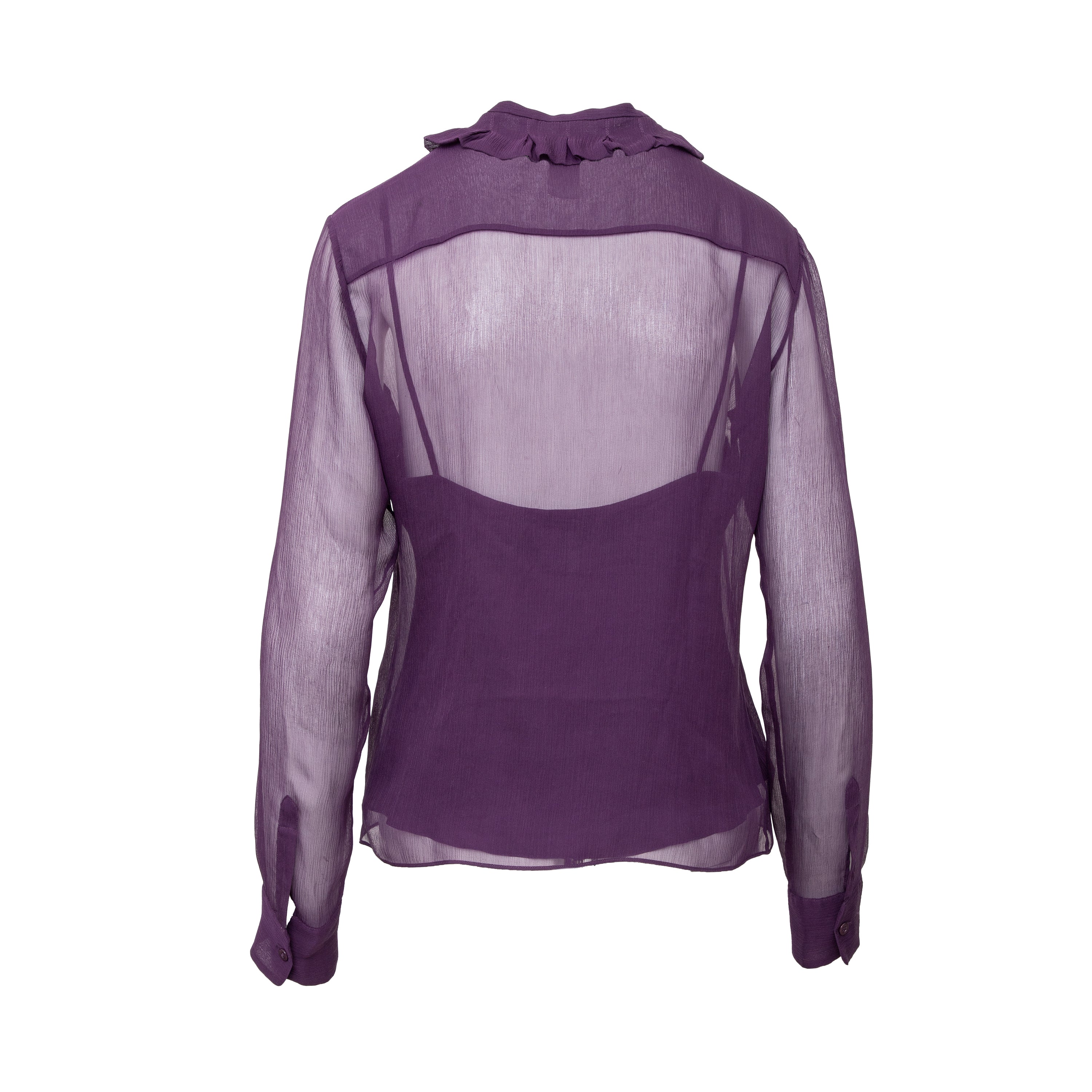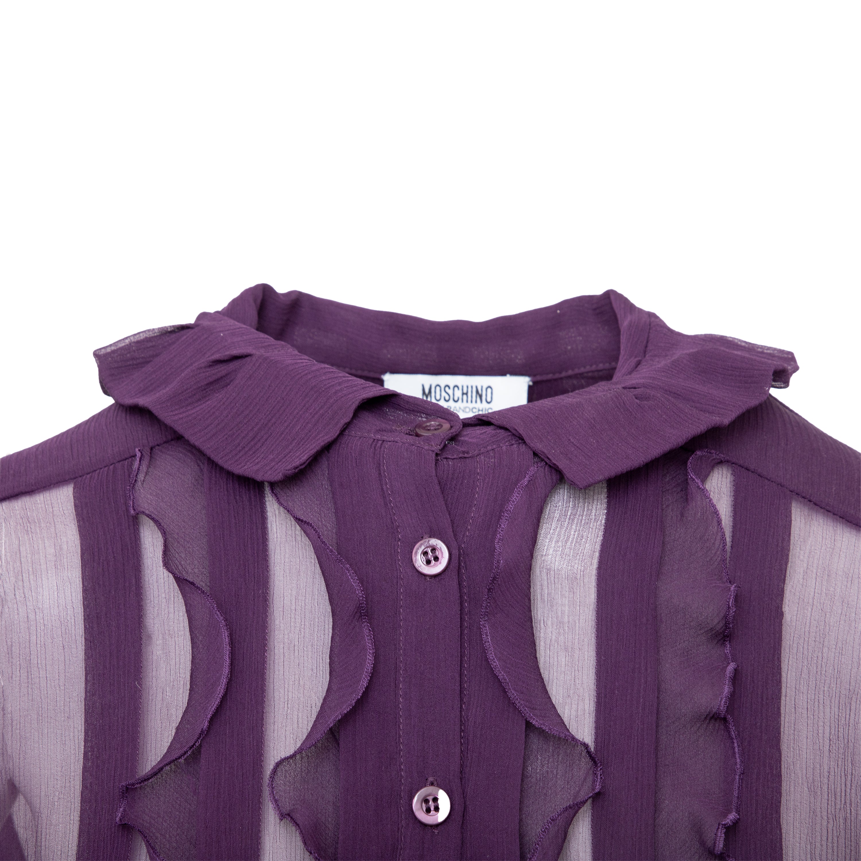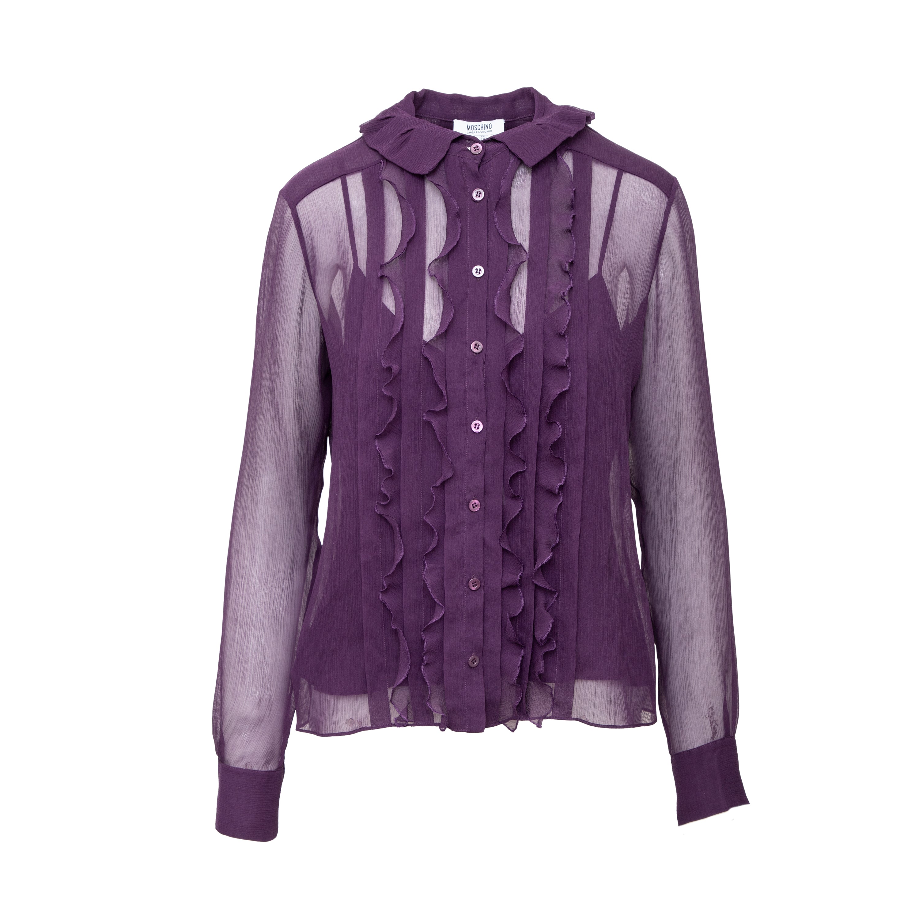 Effortlessly elevate your wardrobe with this luxurious Moschino shirt and camisole set. Crafted from pure silk in a rich deep plum purple color, this shirt is both stylish and versatile. The semi-sheer design, along with front ruffles and pleats, add a touch of femininity. Complete with a front button closure for easy wear.
