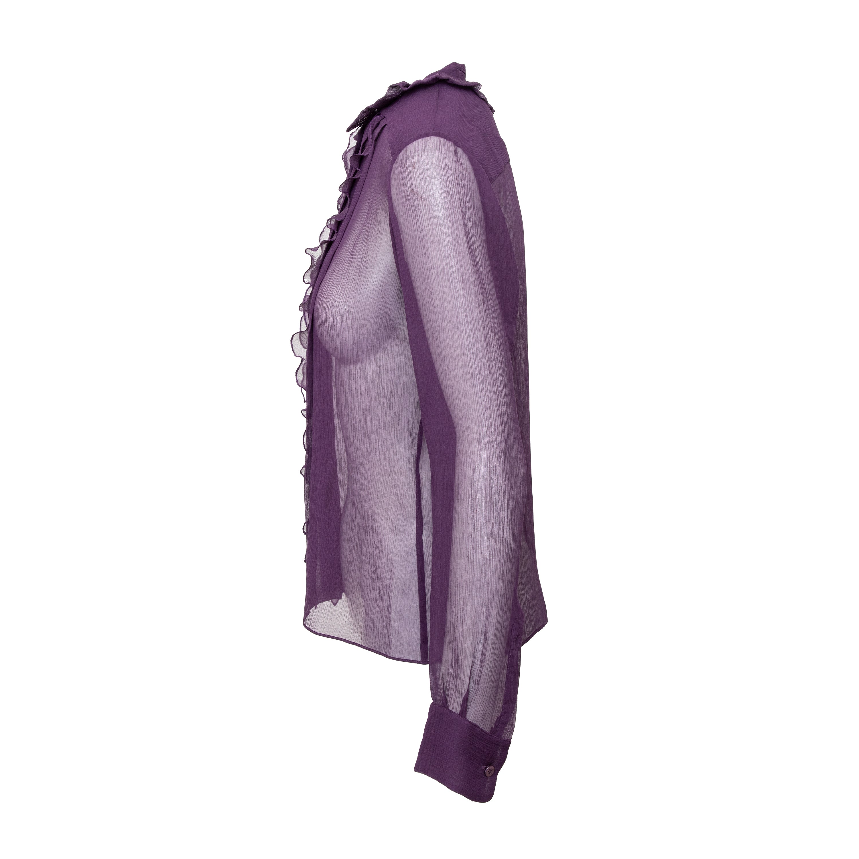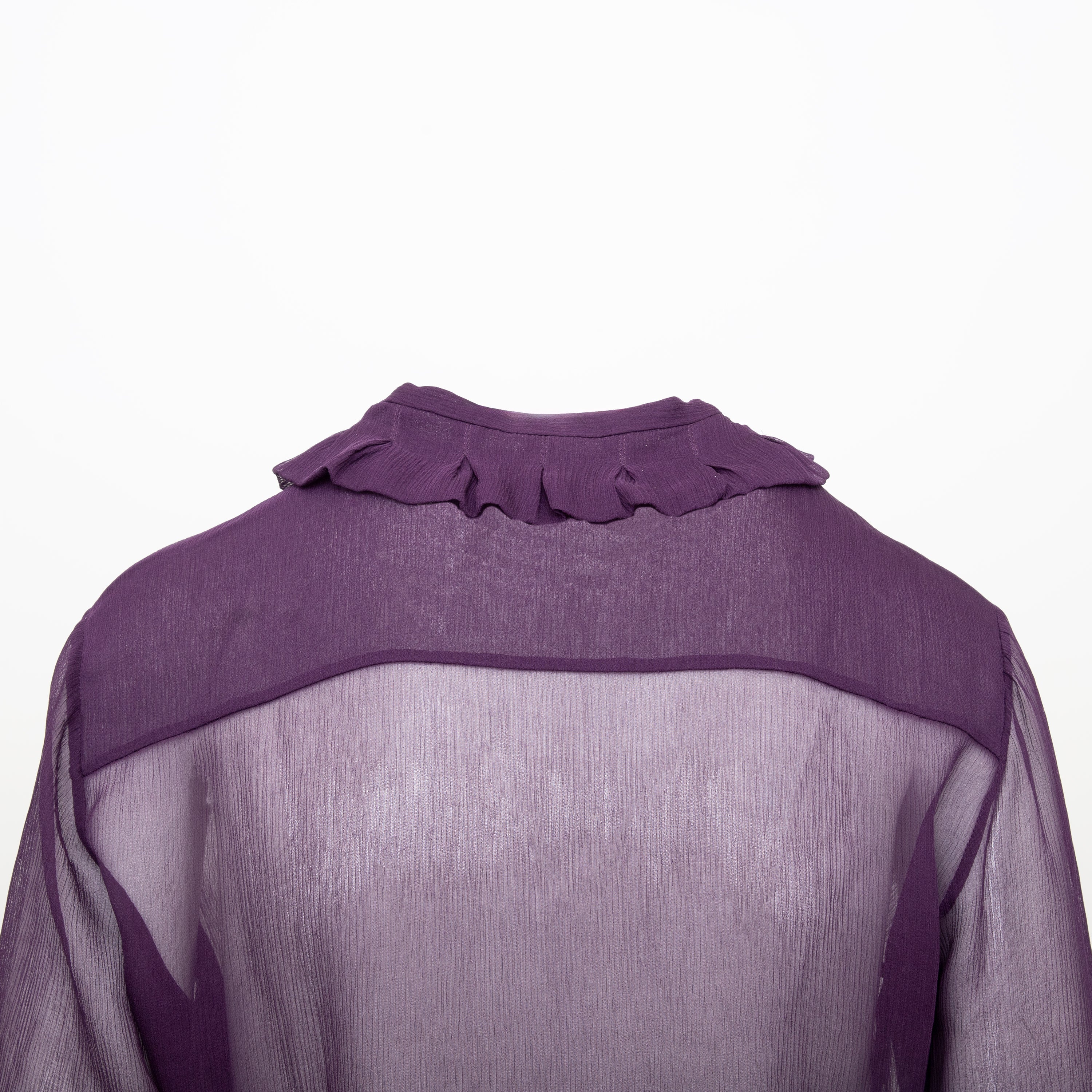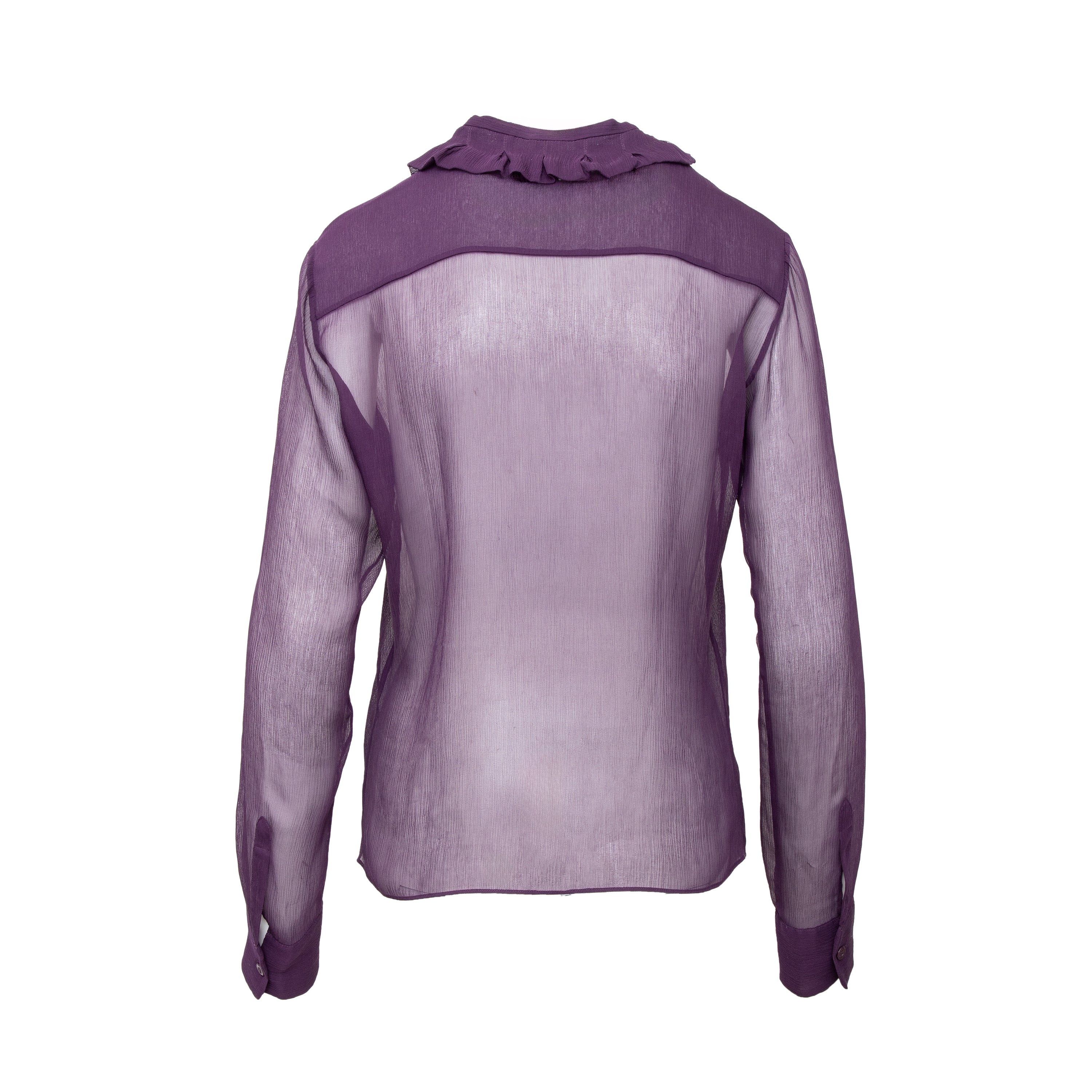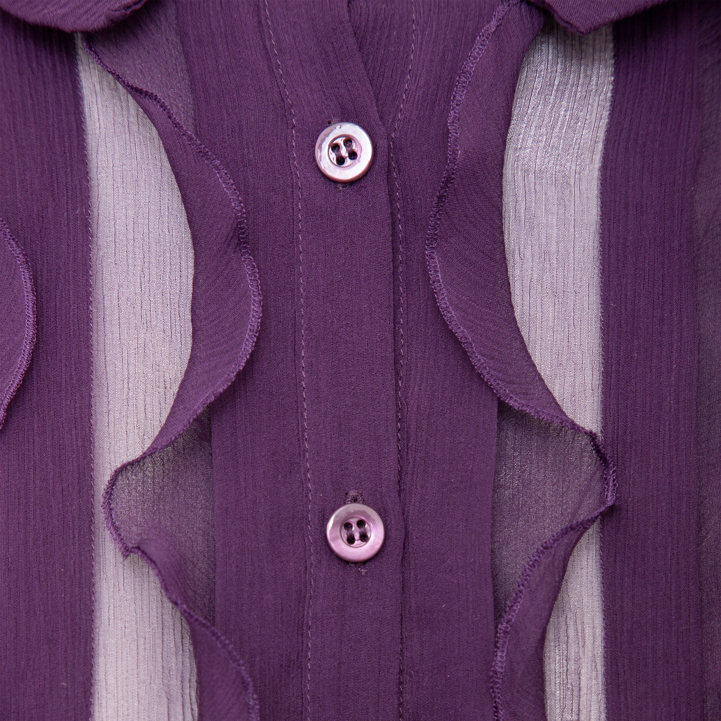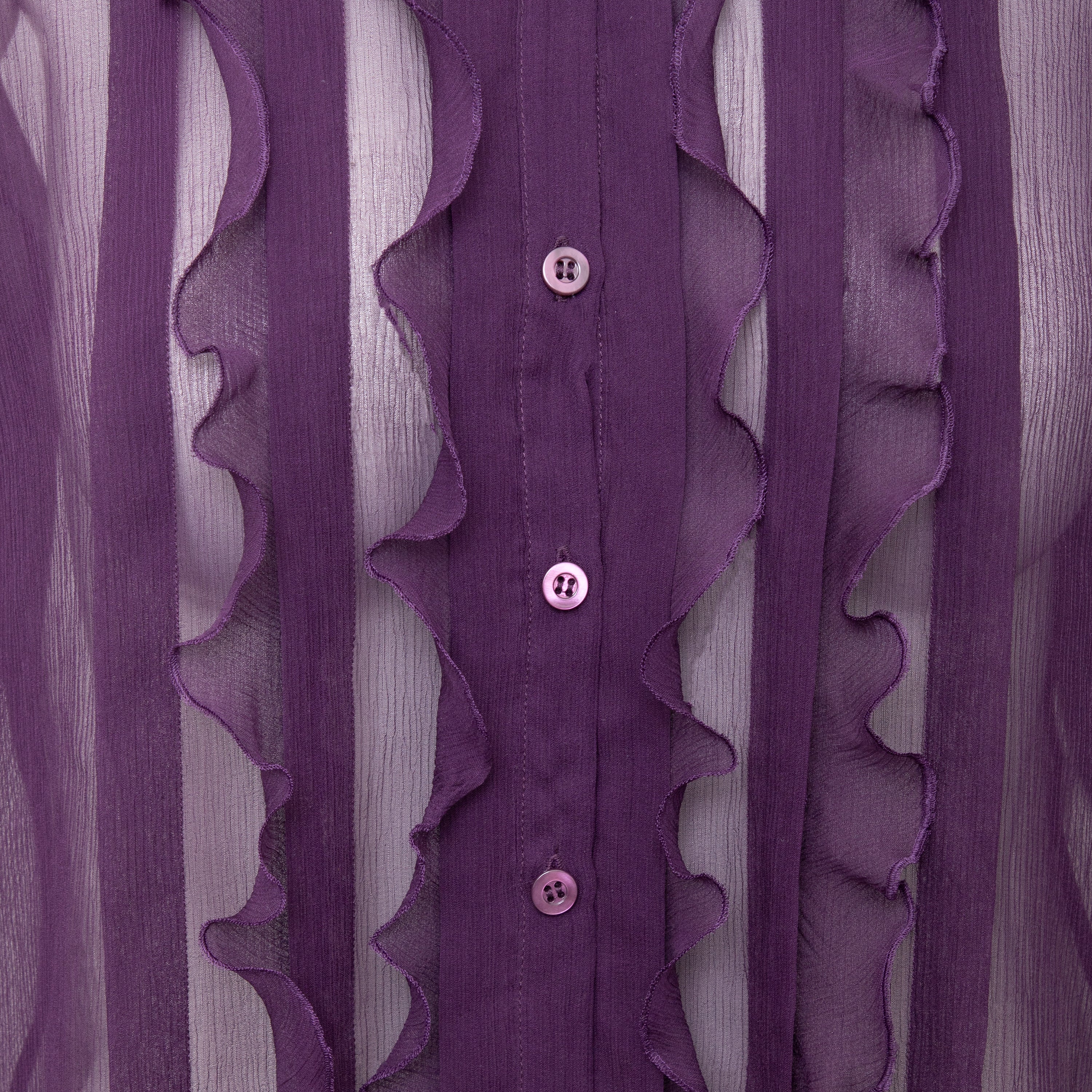 Effortlessly elevate your wardrobe with this luxurious Moschino shirt and camisole set. Crafted from pure silk in a rich deep plum purple color, this shirt is both stylish and versatile. The semi-sheer design, along with front ruffles and pleats, add a touch of femininity. Complete with a front button closure for easy wear.