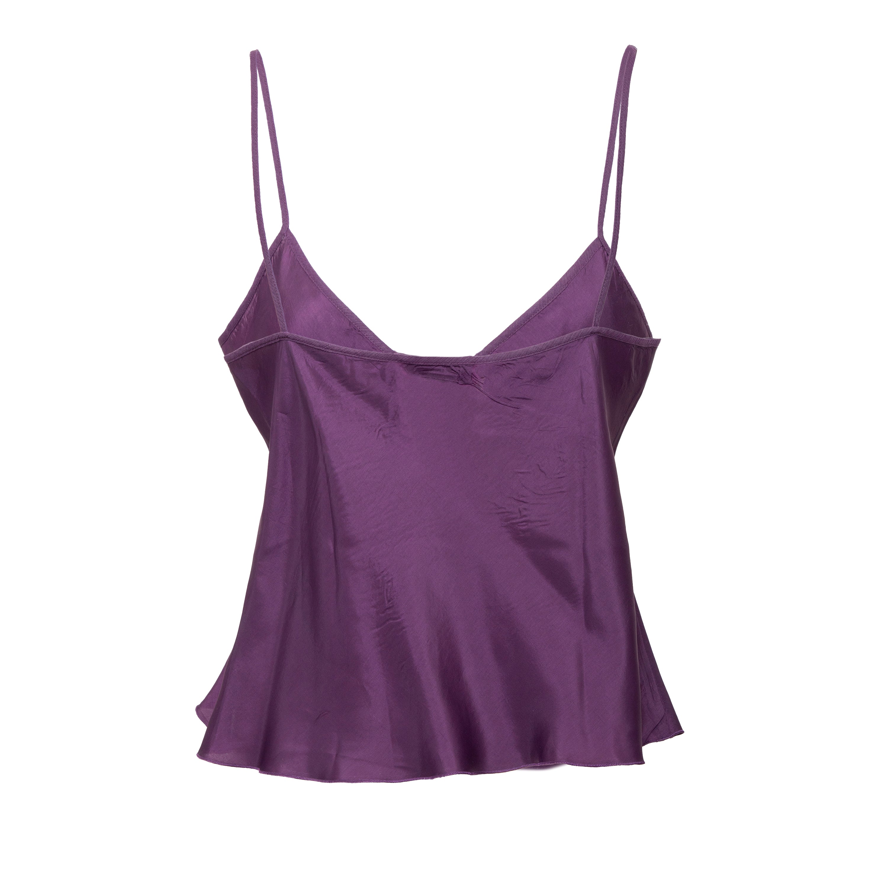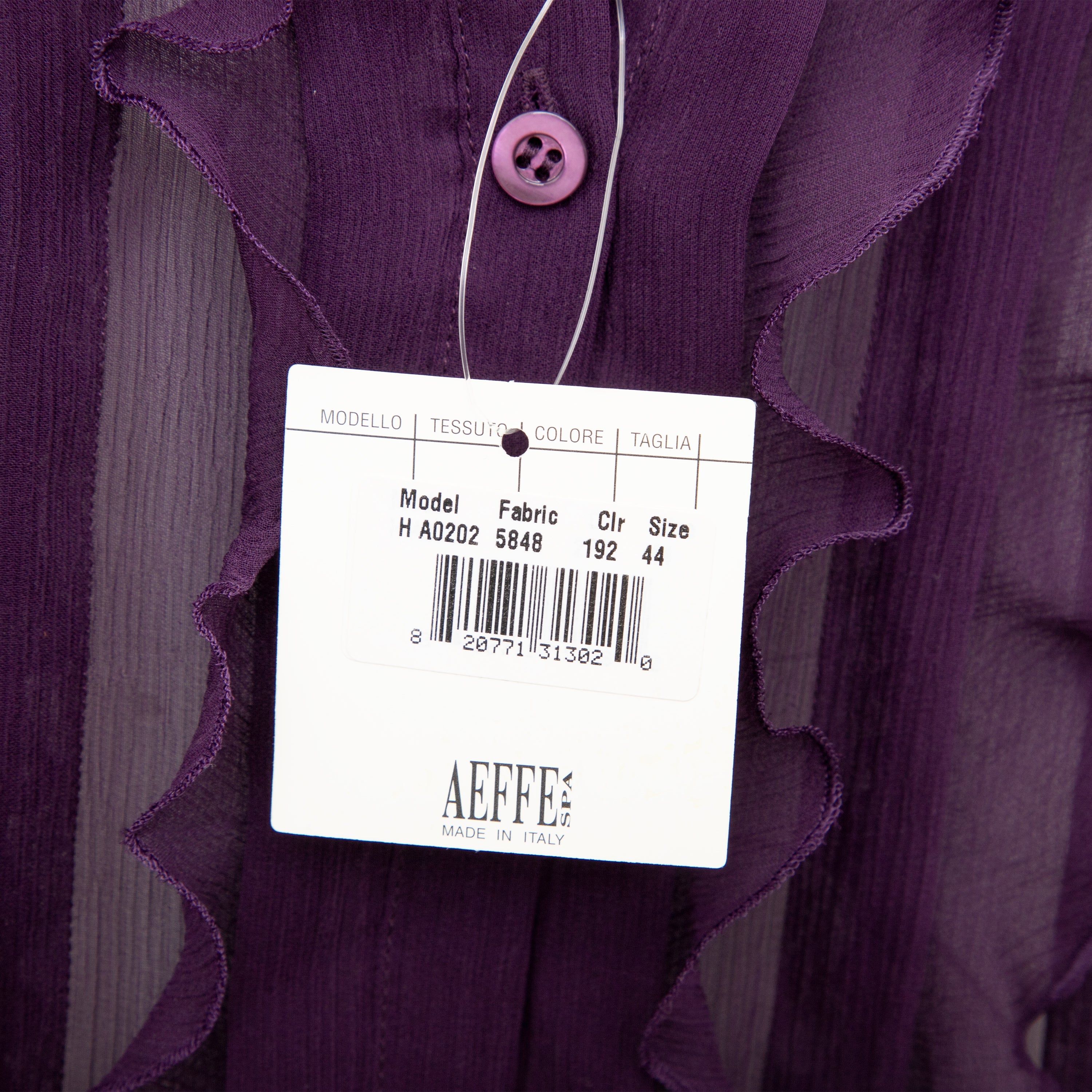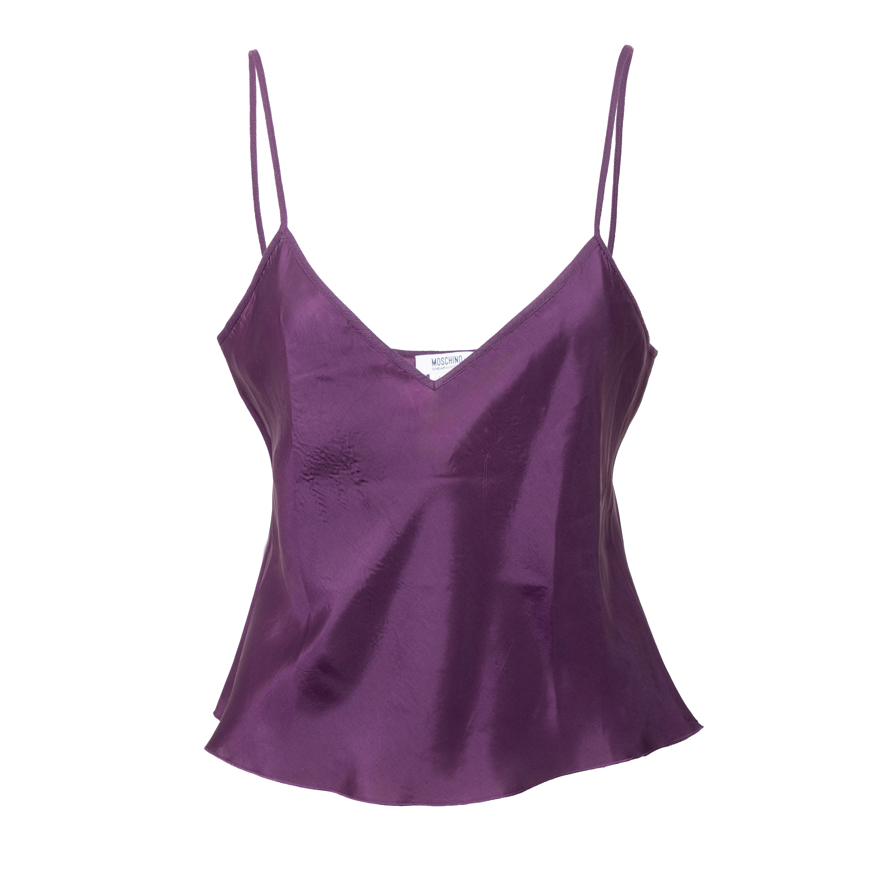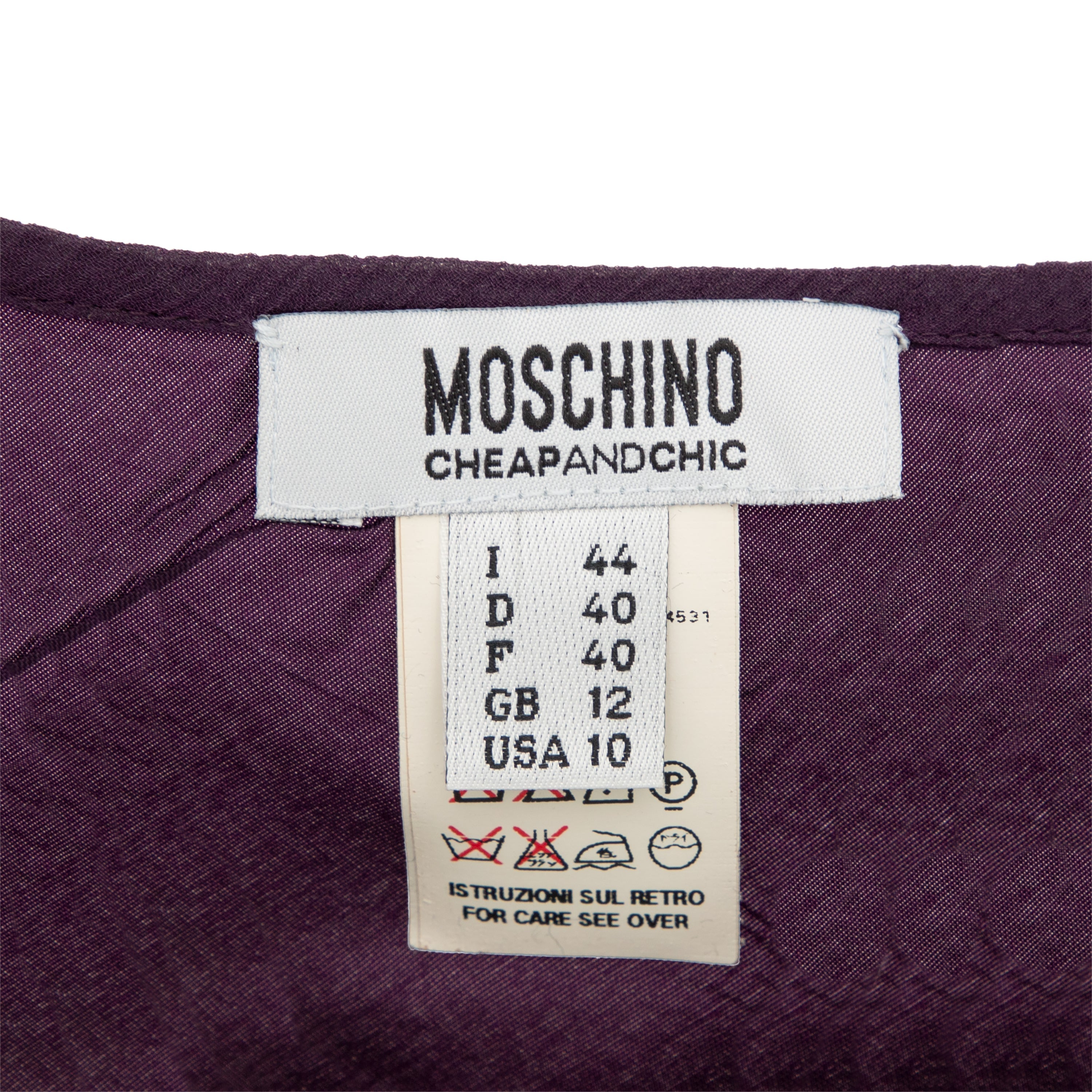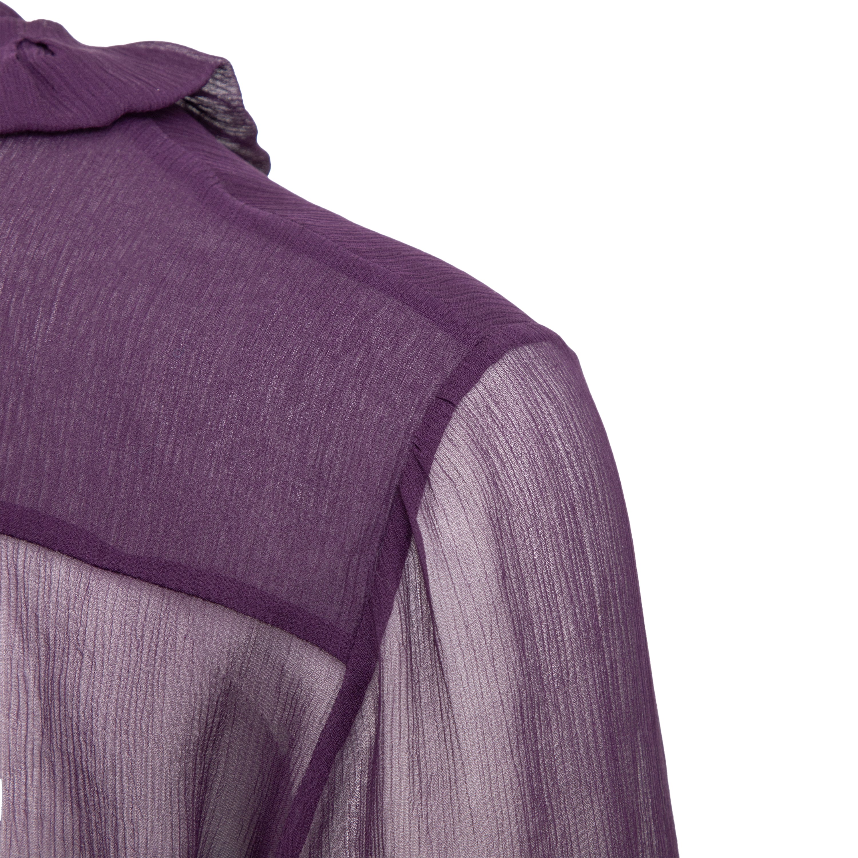 Effortlessly elevate your wardrobe with this luxurious Moschino shirt and camisole set. Crafted from pure silk in a rich deep plum purple color, this shirt is both stylish and versatile. The semi-sheer design, along with front ruffles and pleats, add a touch of femininity. Complete with a front button closure for easy wear.