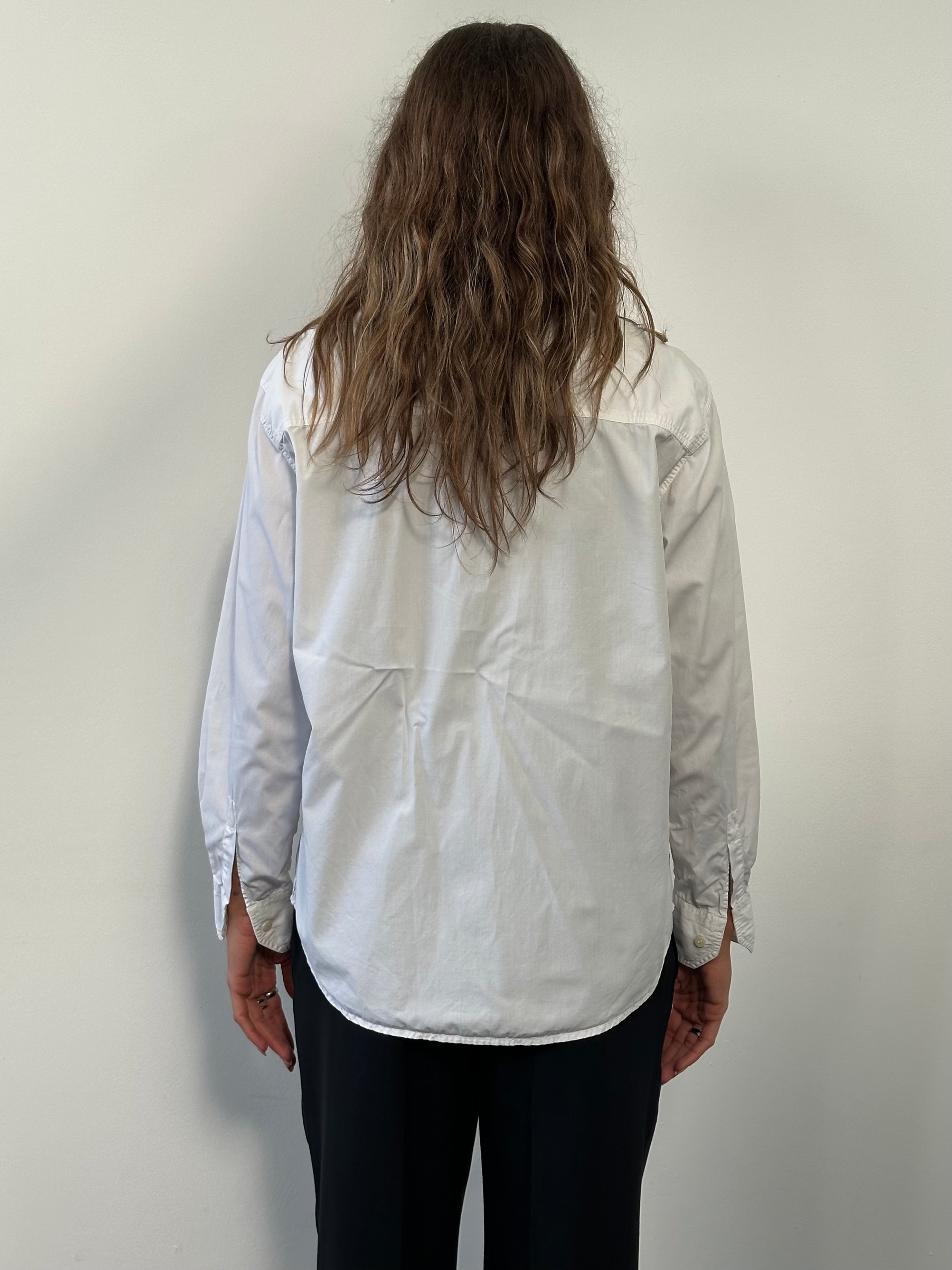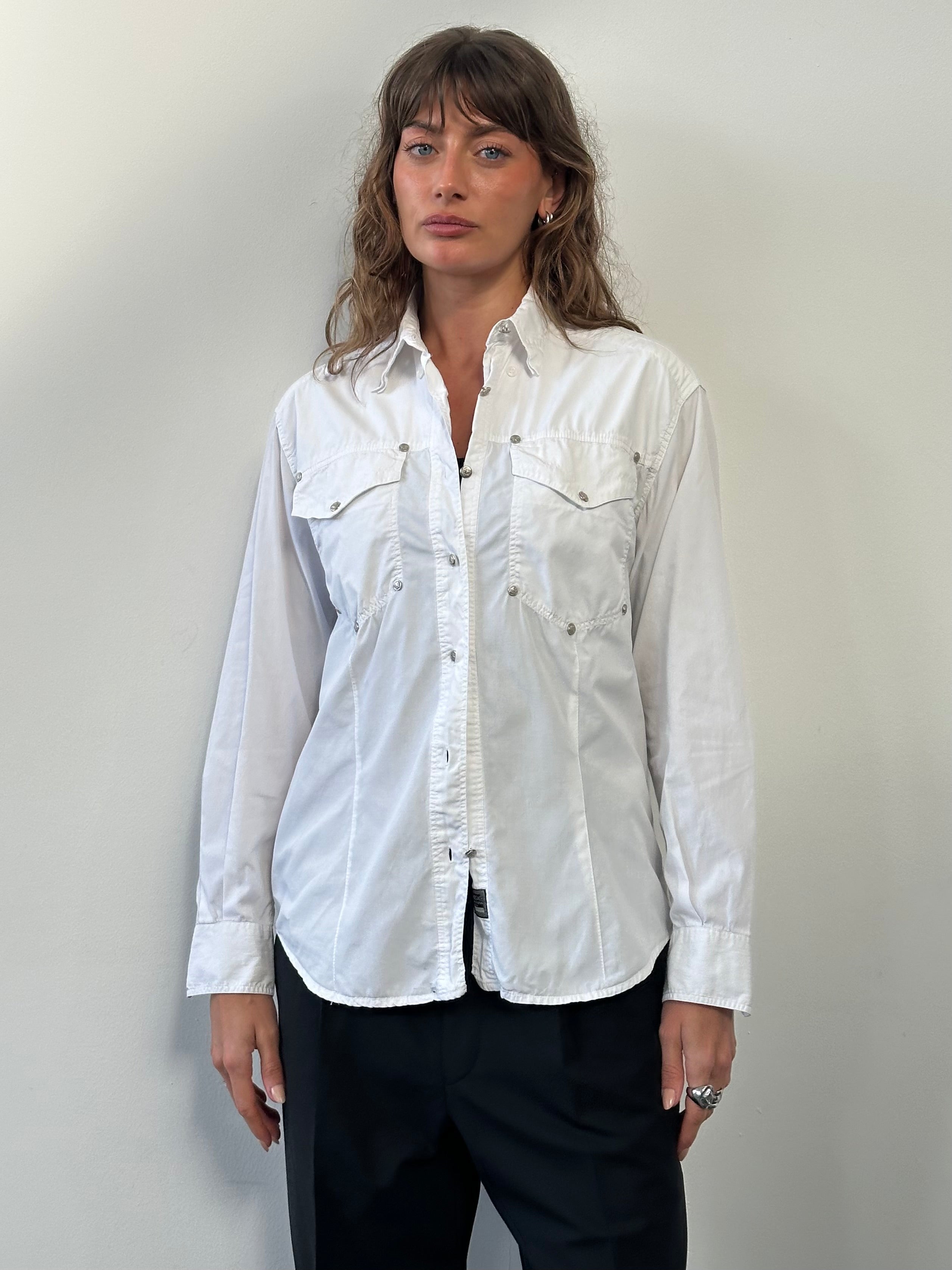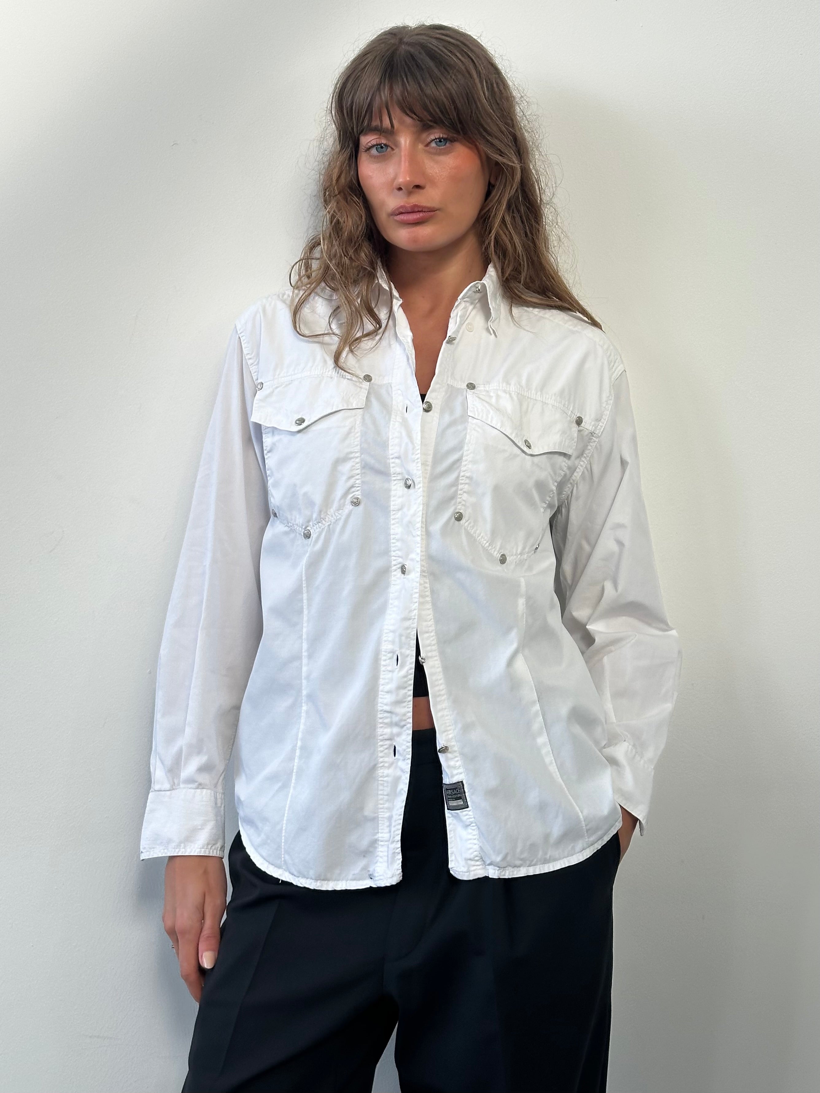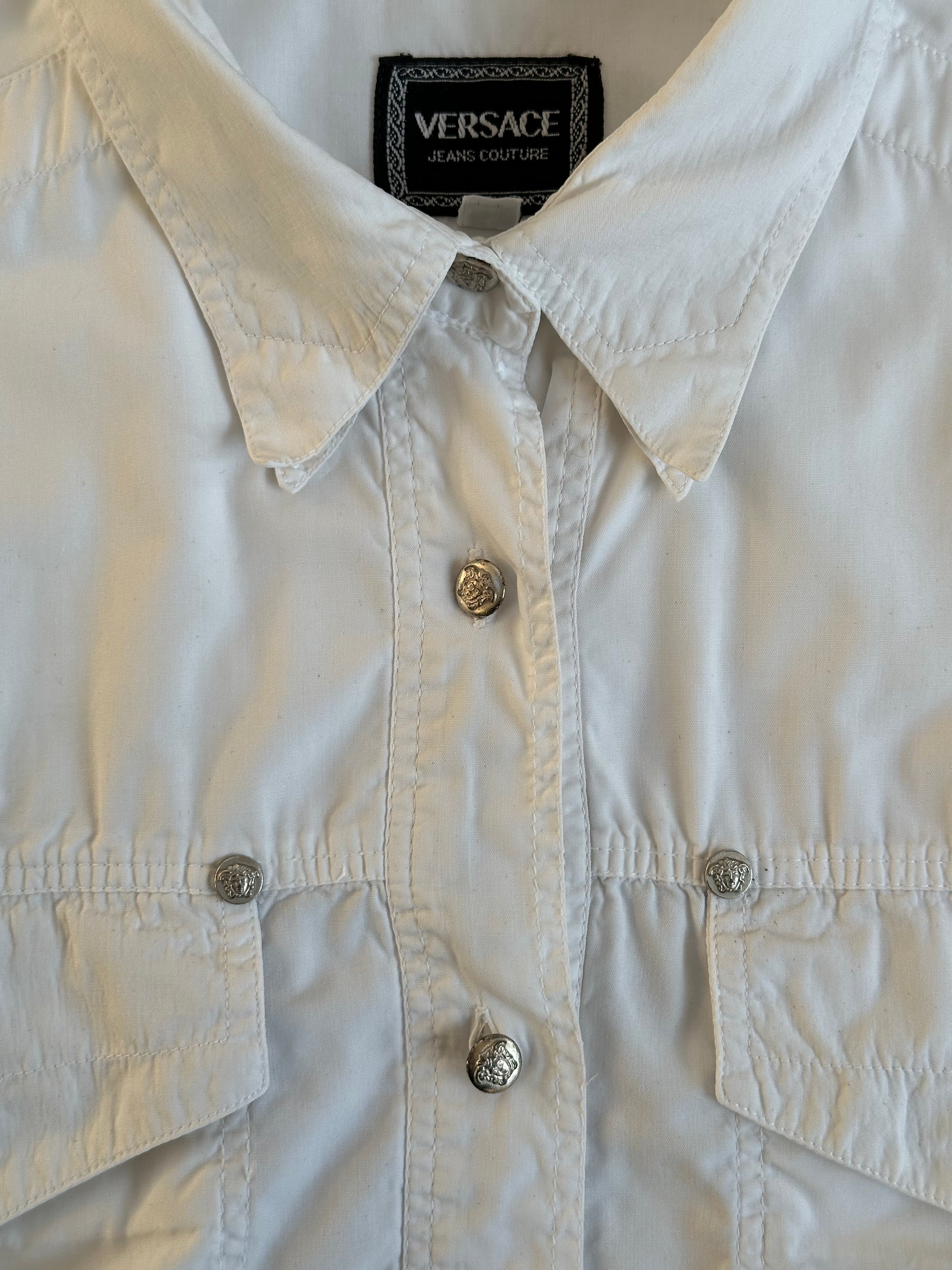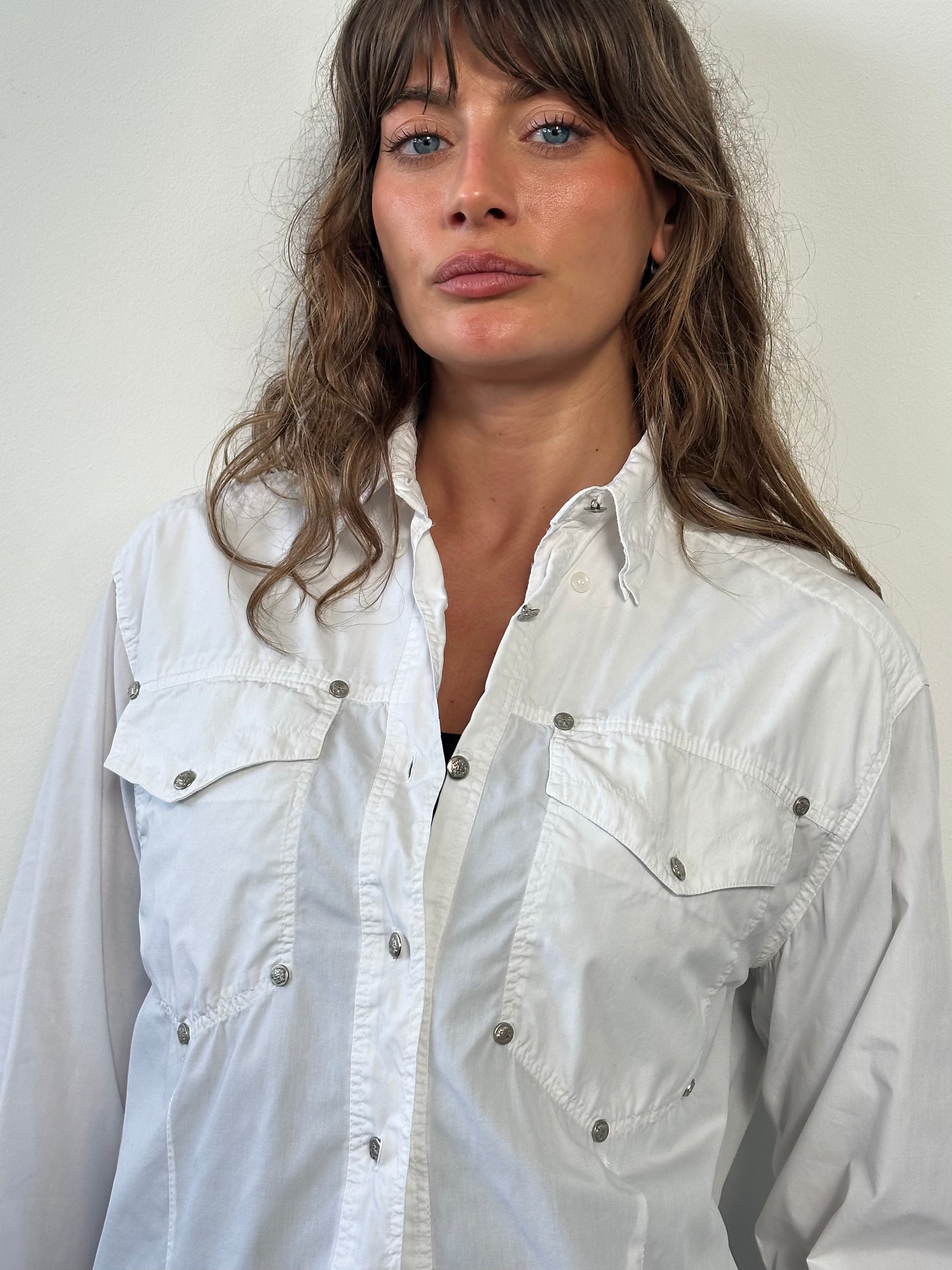 Vintage Versace Jeans Couture shirt in white cotton featuring a structured western-inspired silhouette. Designed with two chest pockets and multiple silver-tone Medusa head buttons across the front and pockets, reflecting the bold hardware styling typical of the Versace Jeans Couture line.