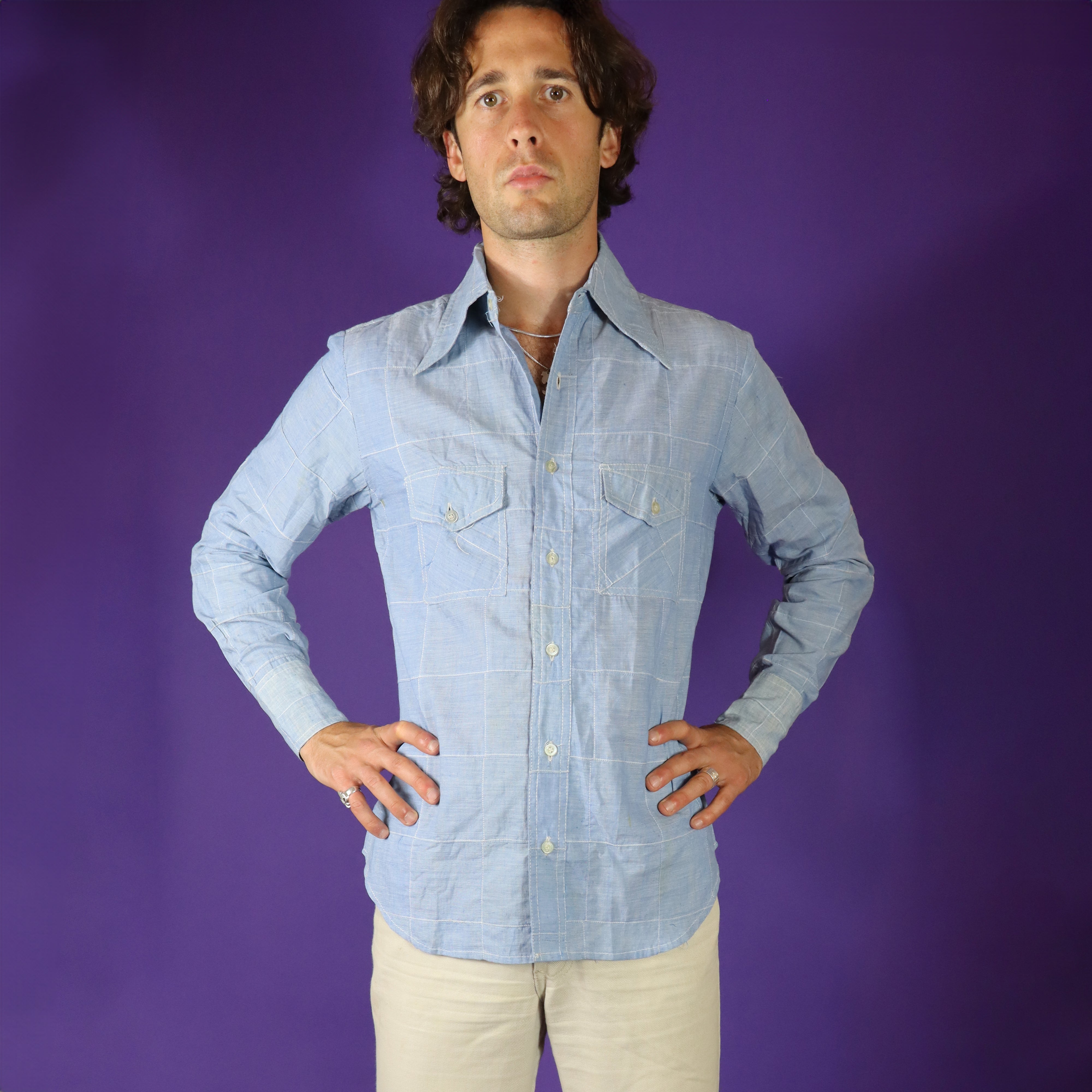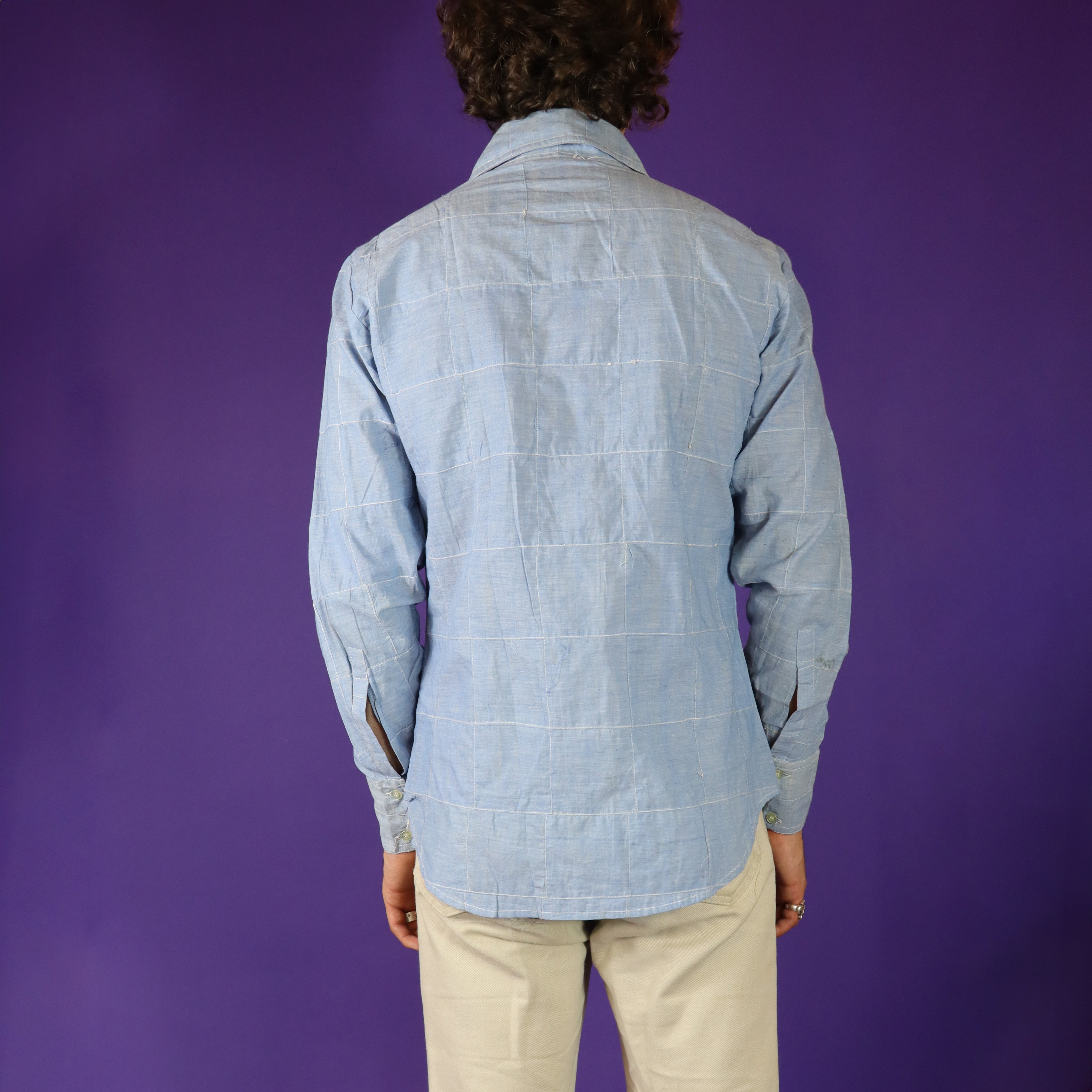 Deadstock vintage 1970s Indian cotton patchwork windowpane shirt by a Long Beach California based Import label. Super soft 100% cotton in chambray washed out pale blue colour. Cleverly cut with a flattering tight fit and classic 70s shirt style with curved hemline.Featuring a dramatic dagger collar. I love the American Western meets Indian design.