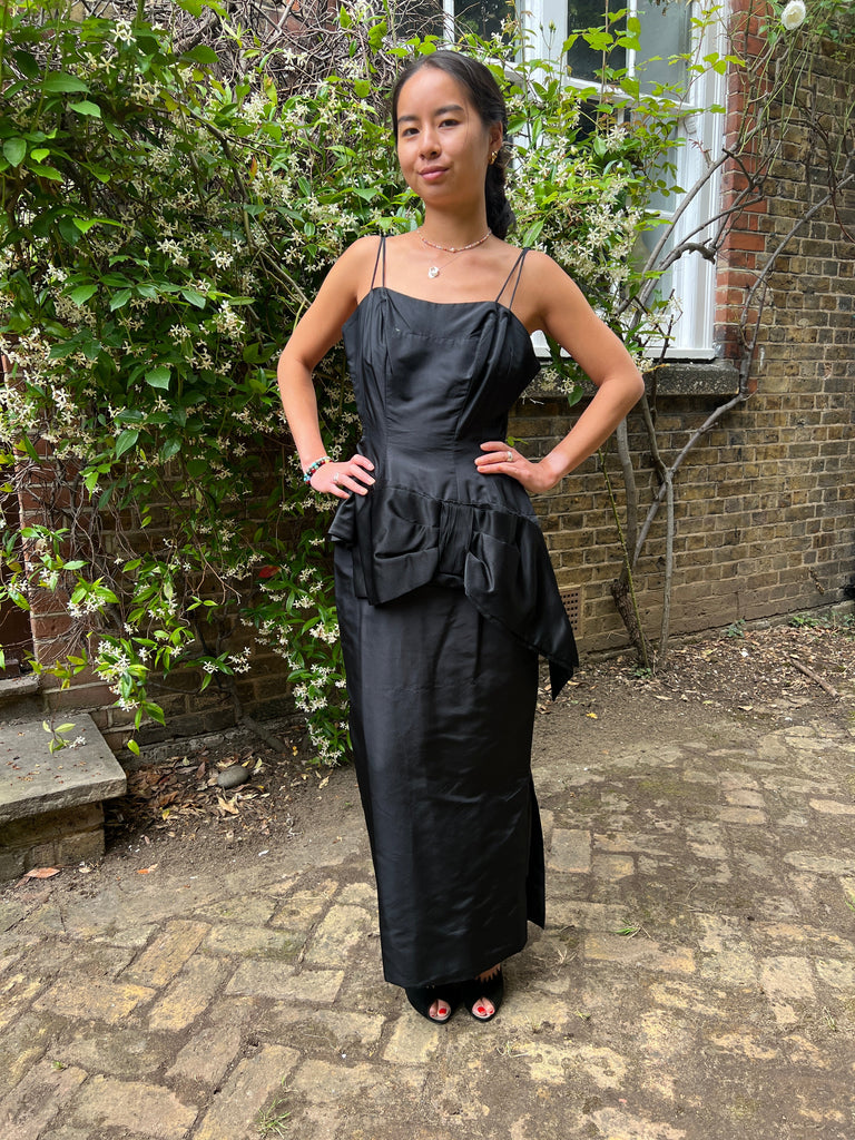 Fabulous 1950’s couture but unlabelled evening ensemble consisting of a black silk asymmetrical top with multiple spaghetti straps and a full-length pencil skirt. The top features a quirky oversized bow to the front and fastens at the back with a zip. The skirt, in the same black silk, is fitted and fastens at the back with hook and eyes. This is a very glamorous outfit creating an exaggerated feminine silhouette and is in excellent condition. Best fit for US size 2 - 4 or UK Size 8. Our model is a UK 6-8 and 5ft 4in. (163cm), this outfit fit her well, the top was slightly roomy on her bust.