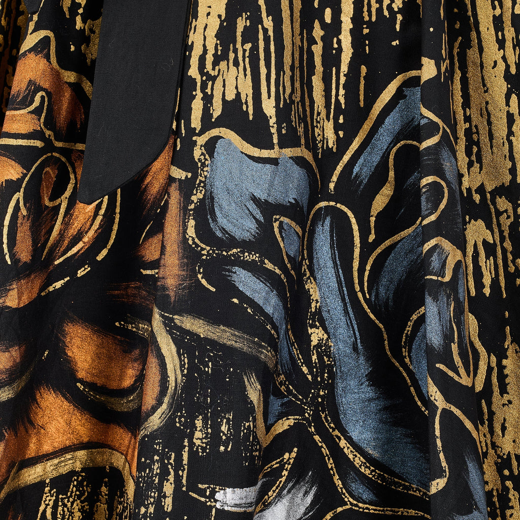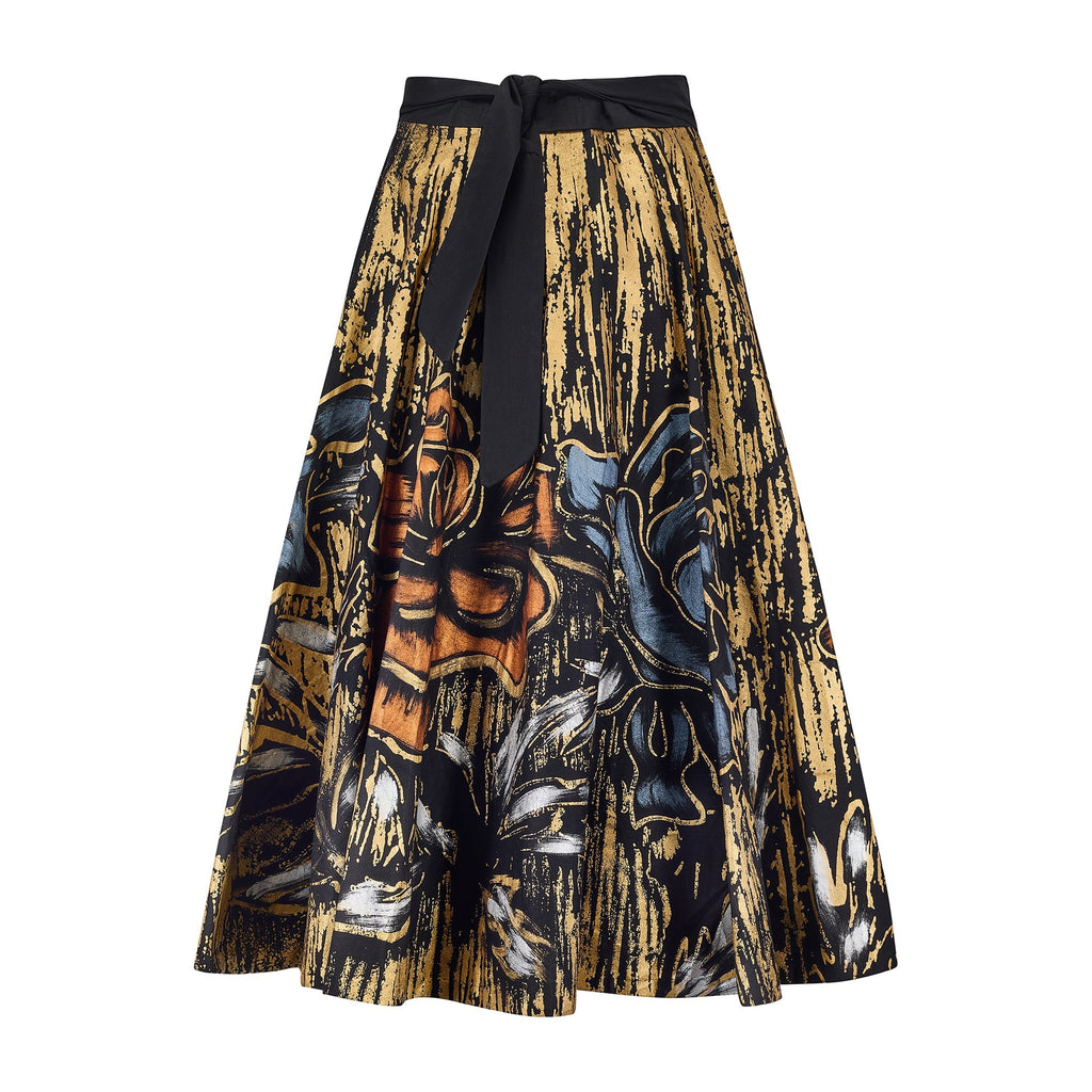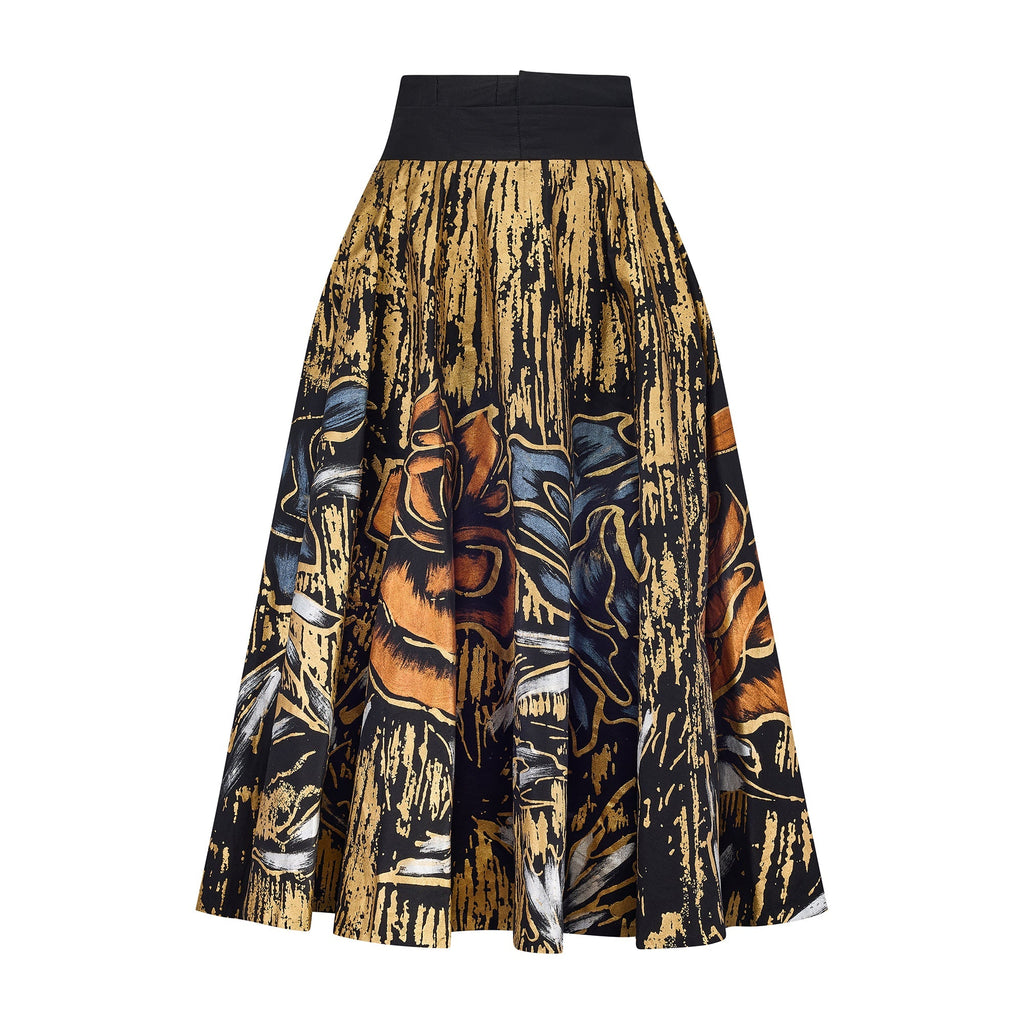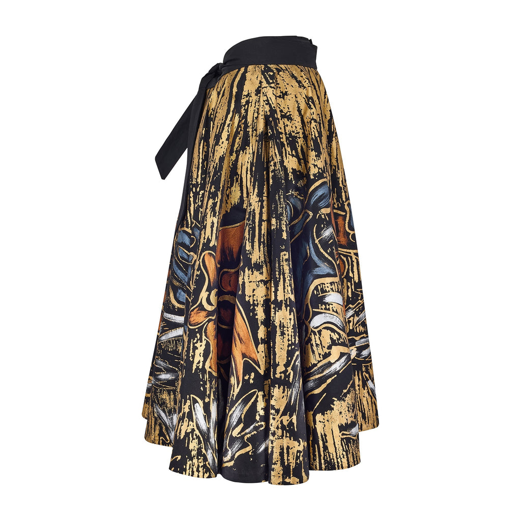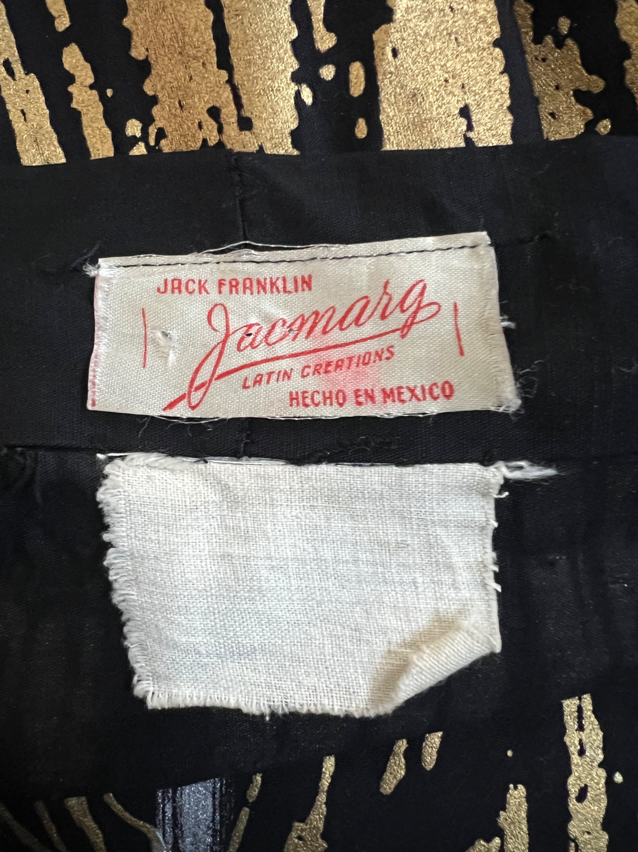 This striking original 1950s Mexican black cotton festival skirt is in superb vintage condition and is a wonderfully versatile piece. It features a hand painted, abstract gold motif with blown-up flowers in blue and bronze encircling it. The cut is a below the knee, full circle '360' style giving this piece a voluminous, playful aesthetic. It has a wrap-around black cotton tie at the waist which is secured by hidden hook-and-eye clasps. This skirt can be effortlessly transformed from day time to evening wear with the right accessories and the addition of a petticoat. This skirt is unlined. It is labelled “Jacmarq, Jack Franklin, Latin Creations, Hecho En Mexico”. In truly excellent vintage condition with no issues of any note. It has no composition or size label so please double check our measurements below as vintage sizes vary hugely. The fabric has no stretch; however, the skirt can be adapted at the waist to make it smaller or bigger with some easy tailoring adjustments. Good right now for all sizes up to a UK 12 or US 8.