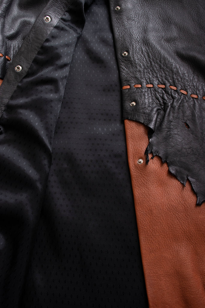 Everyone in the shop has fallen in love with this stunning custom leather skirt. Sourced from a designer's storage, this unworn piece was once part of a Los Angeles boutique owner's collection. The luxurious material is unbelievably soft and she is a perfect fit. Easy snap closures down the front allow for versatile styling, and the asymmetrical design and raw edges add a touch of rustic charm. There is no damage to the skirt, but we are offering up close shots of natural imperfections.