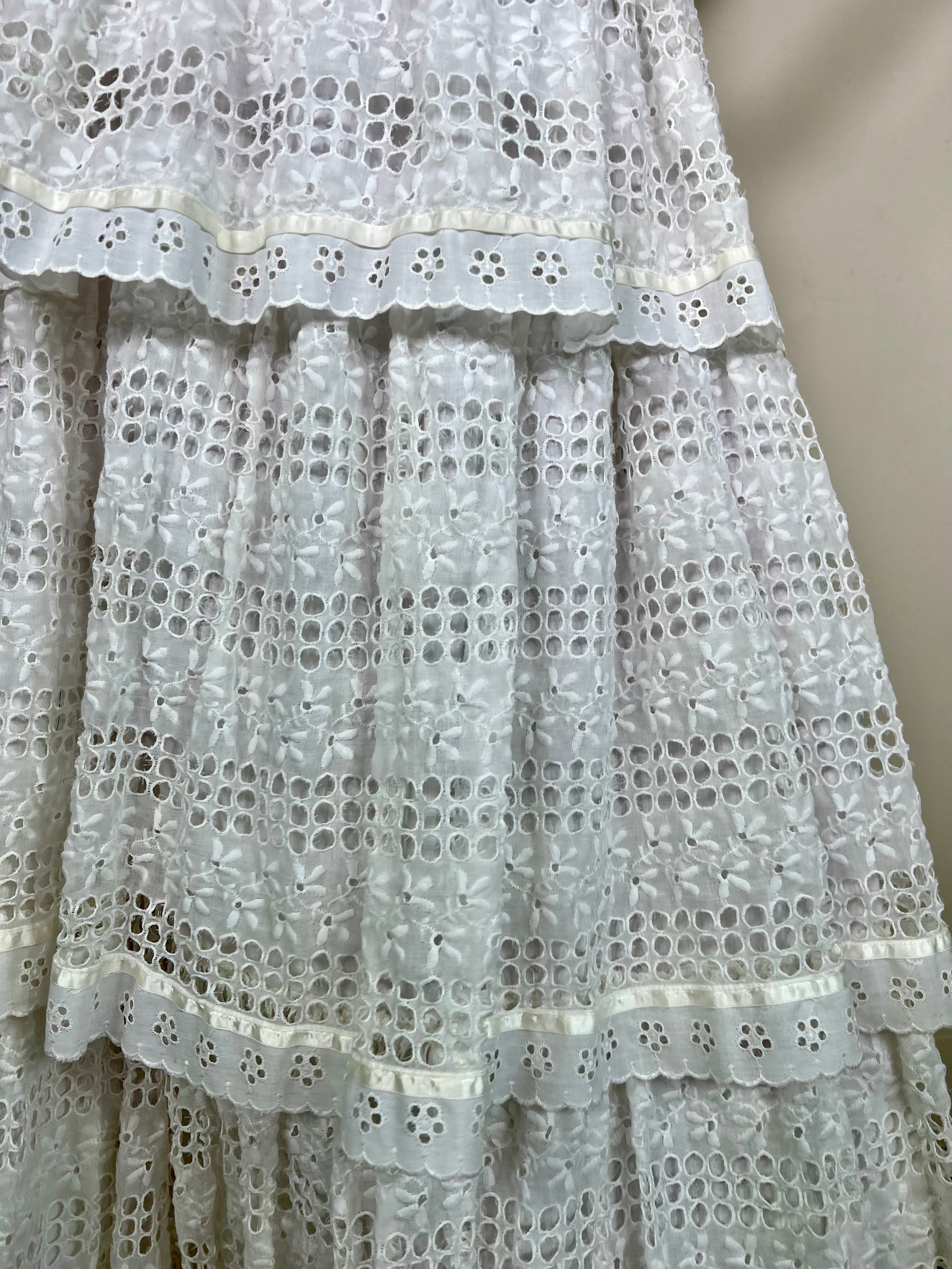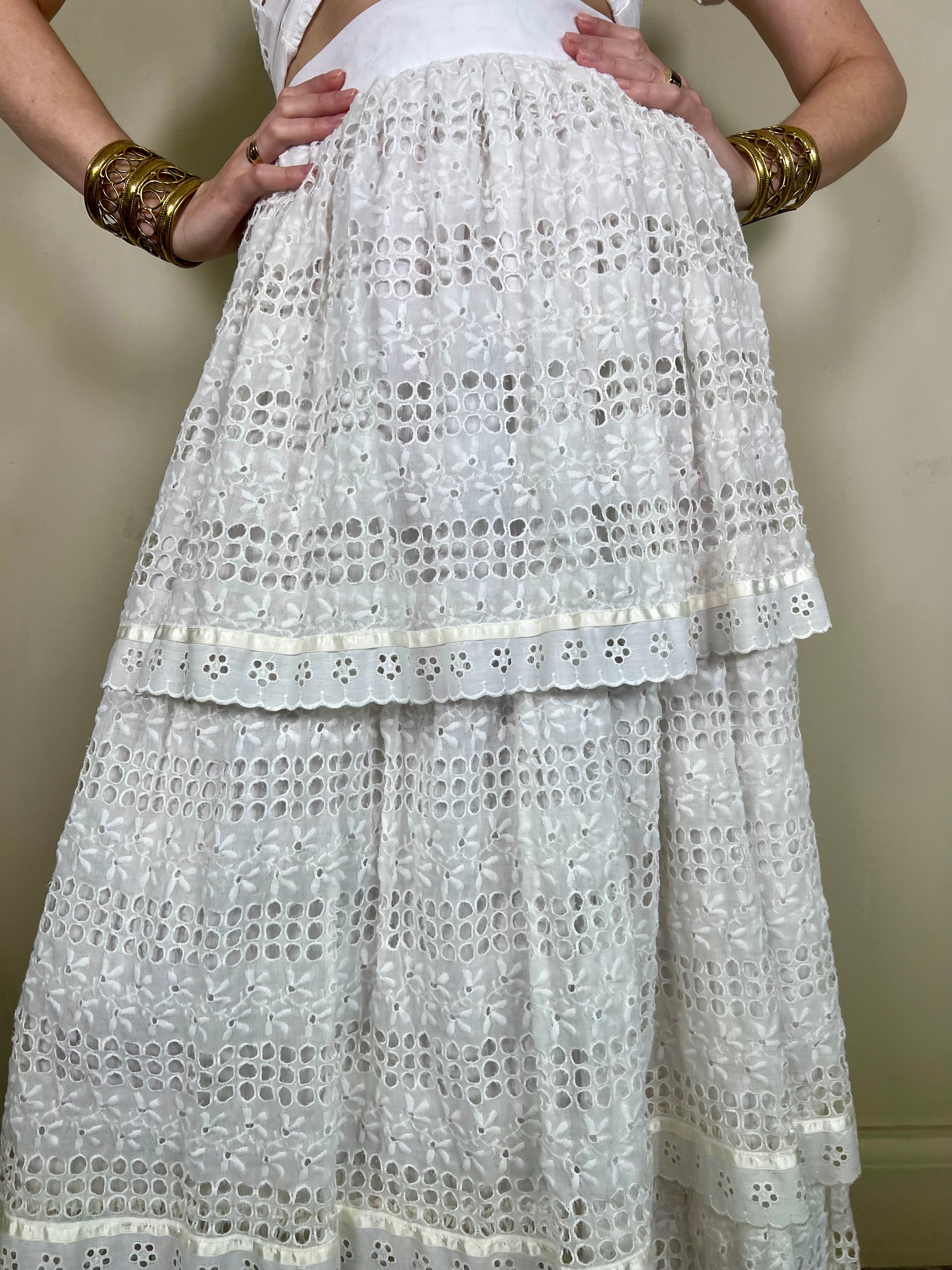 Fabulous vintage skirt made from 3 tiers of French eyelet cotton. Has a 2 inch waistband that fastens on the back. The fit is slightly A line down to the floor. Looks fab paired with a white crisp shirt or simple white t-shirt.