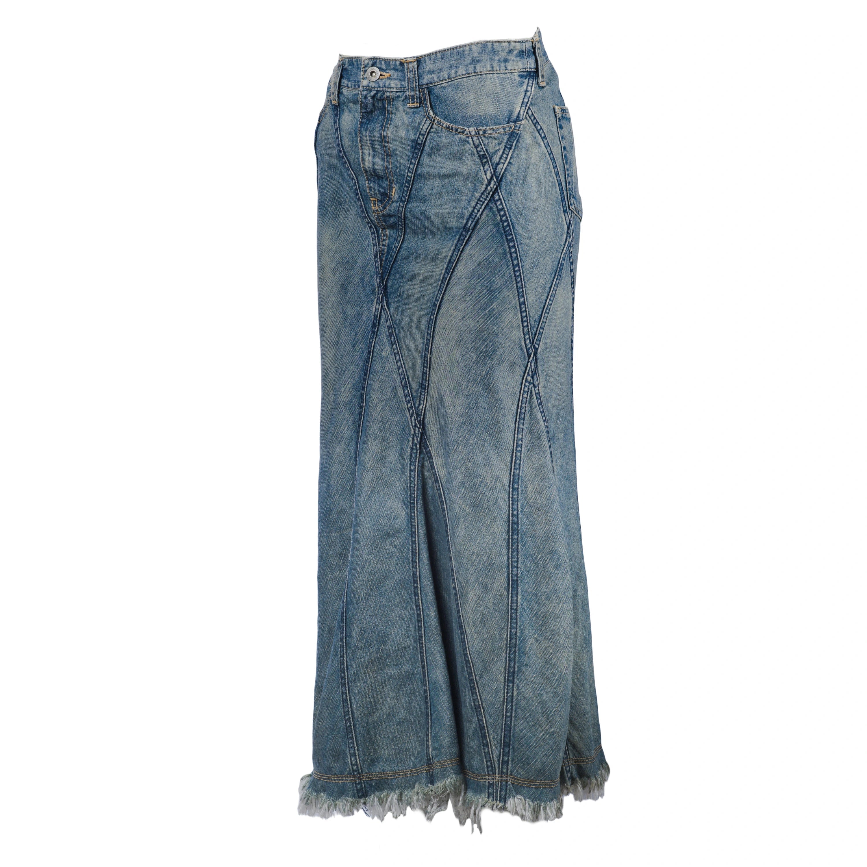 Denim panelled mermaid skirt from the Pink Man line by Comme des Garçons by Junya Watanabe Man. The panelled construction creates a fitted silhouette at the hips, gently flaring out towards the hem, resulting in a structured yet fluid movement.