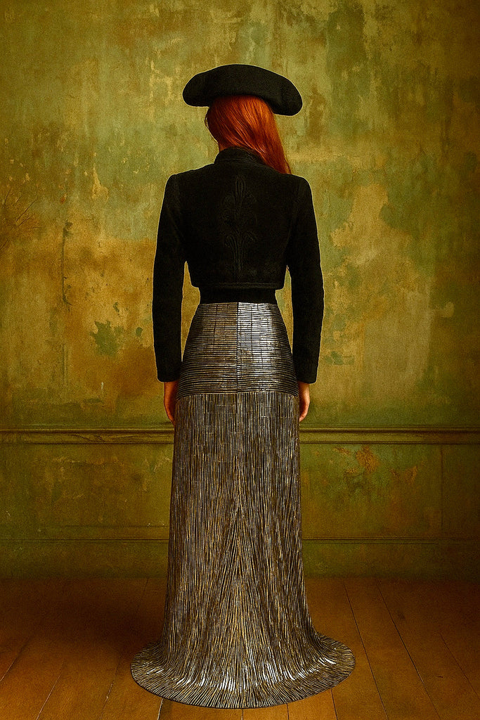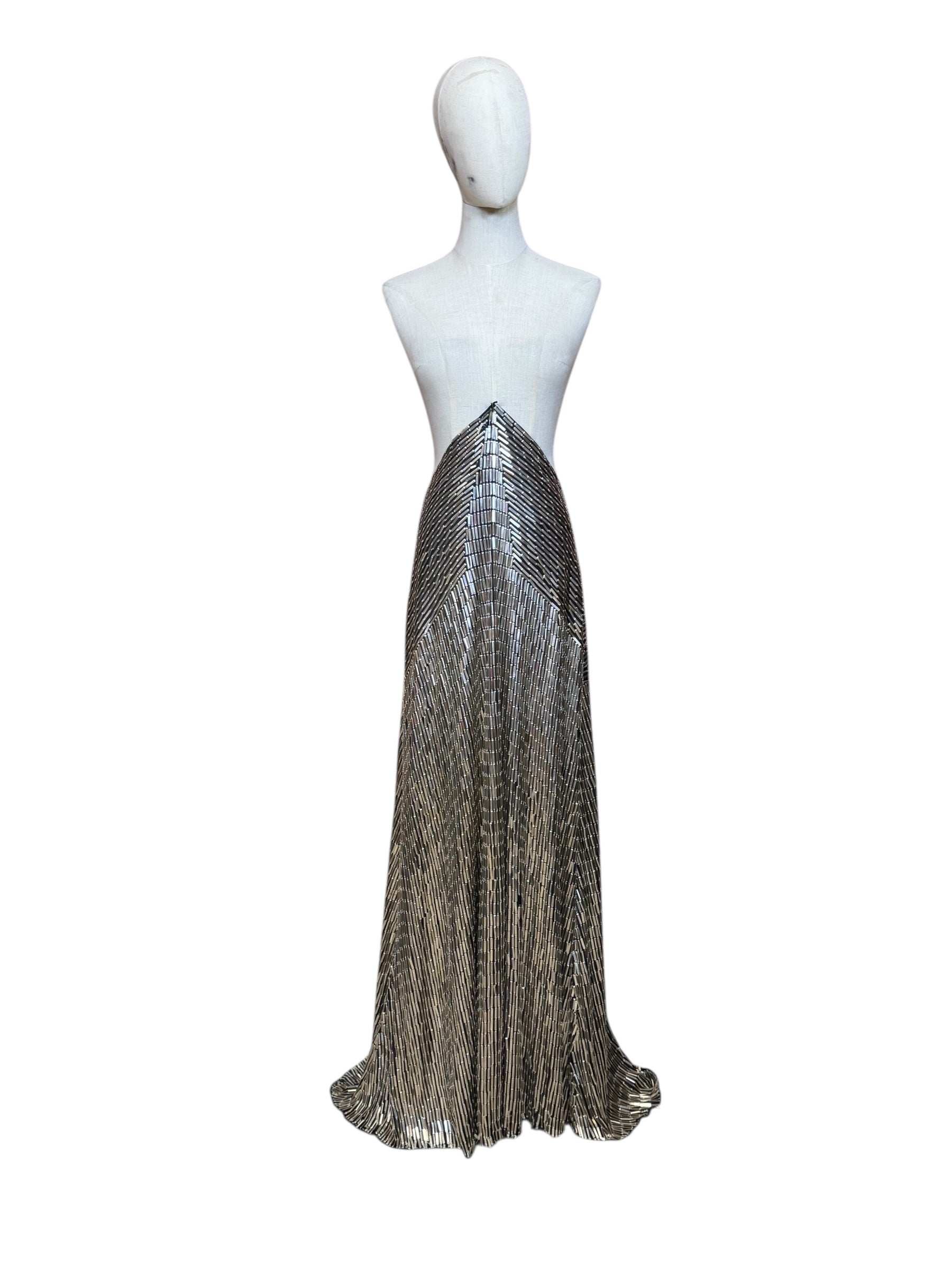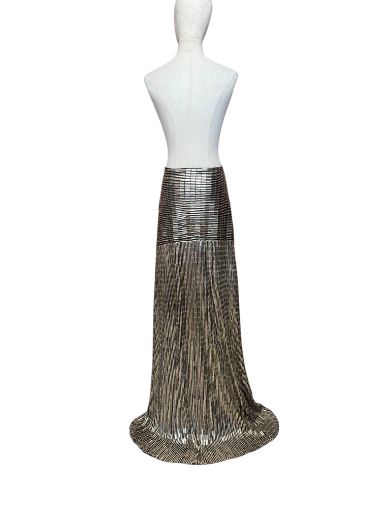 One off vintage couture skirt that will make a statement in any event. This one of a kind piece features a stunning long silver rectangle sequence and a pointed waist design, creating an elegant A line silhouette. With a back zip and full lining, it's the perfect combination of style and craftsmanship.