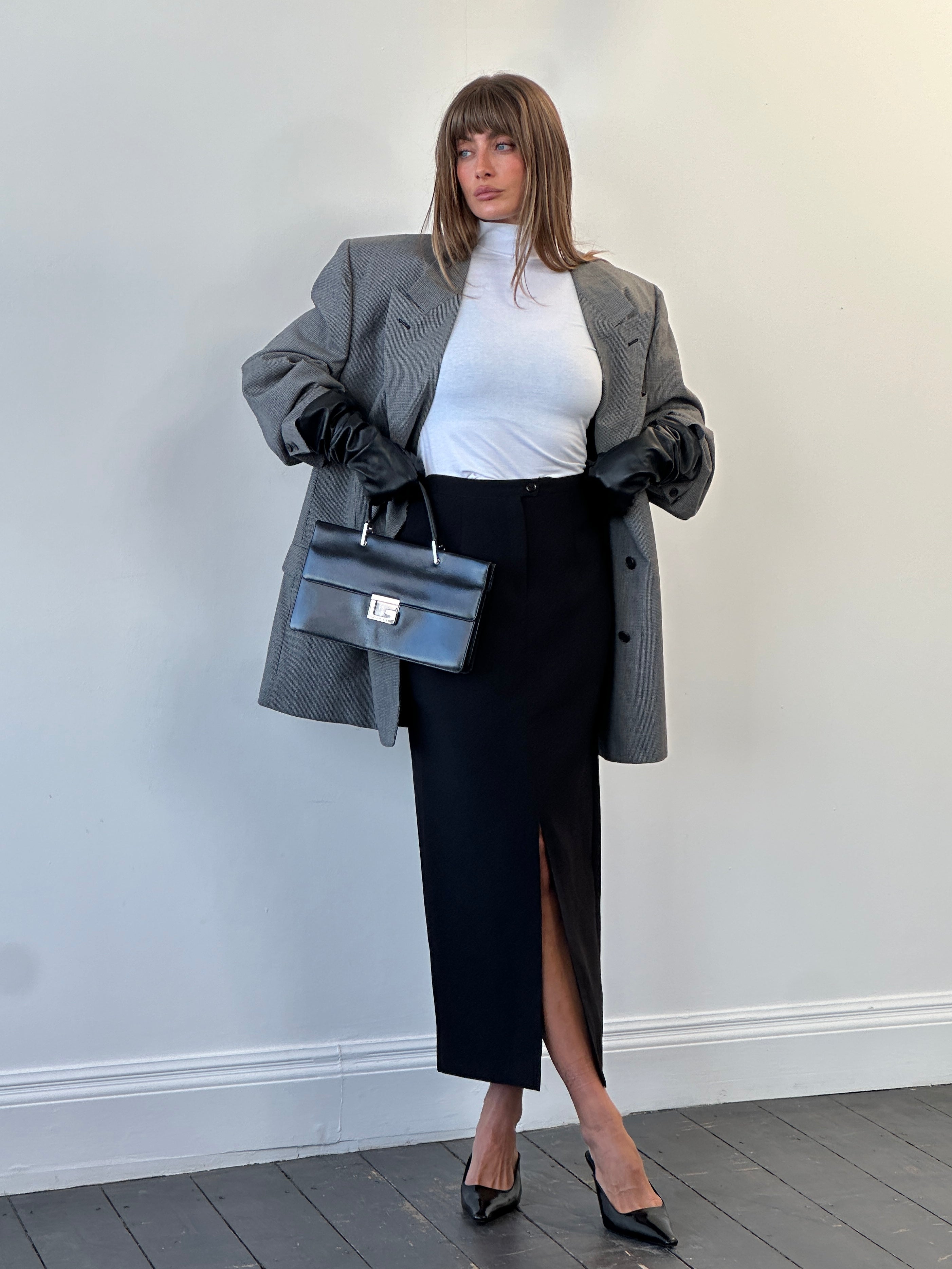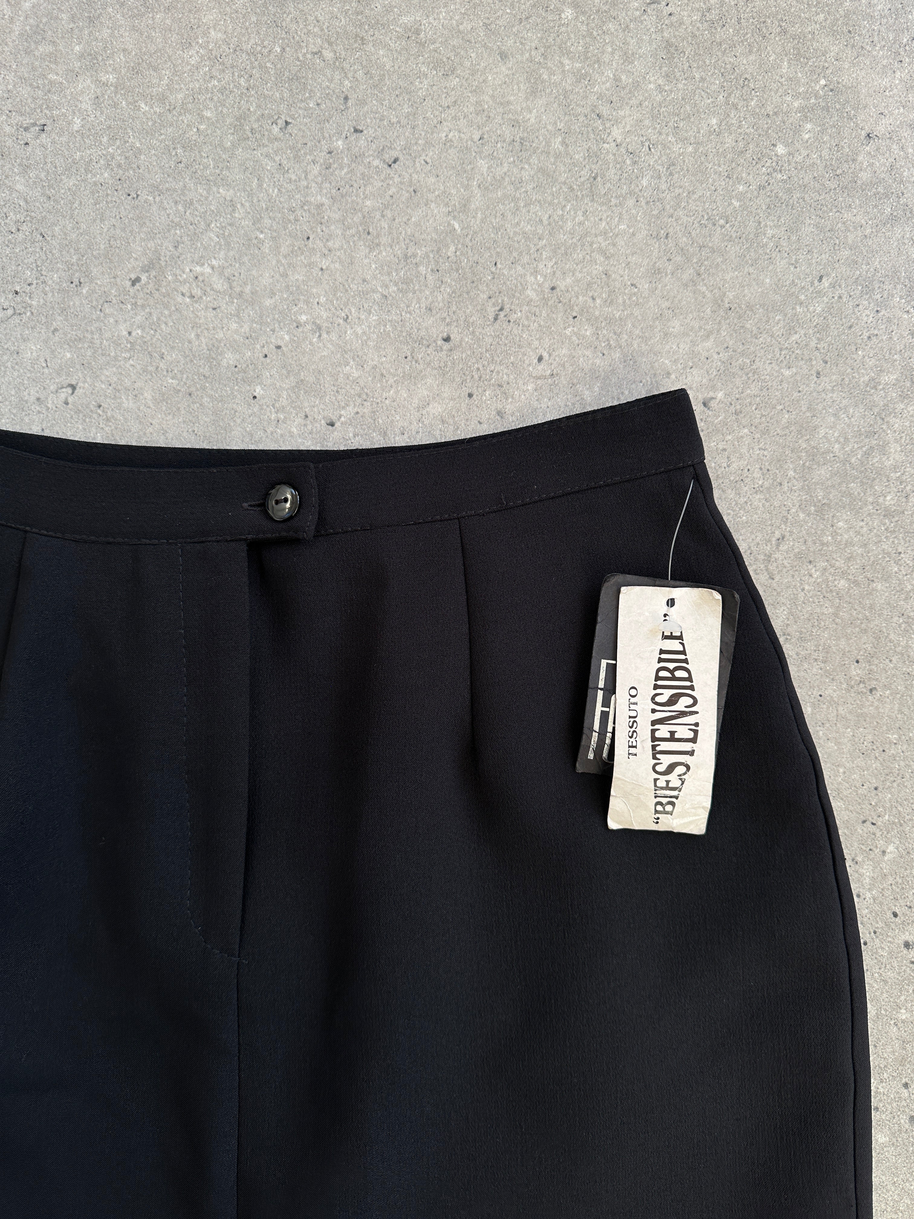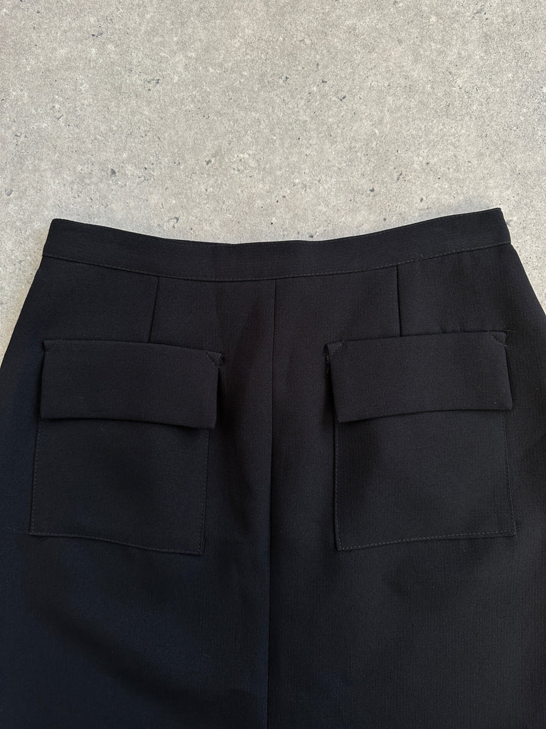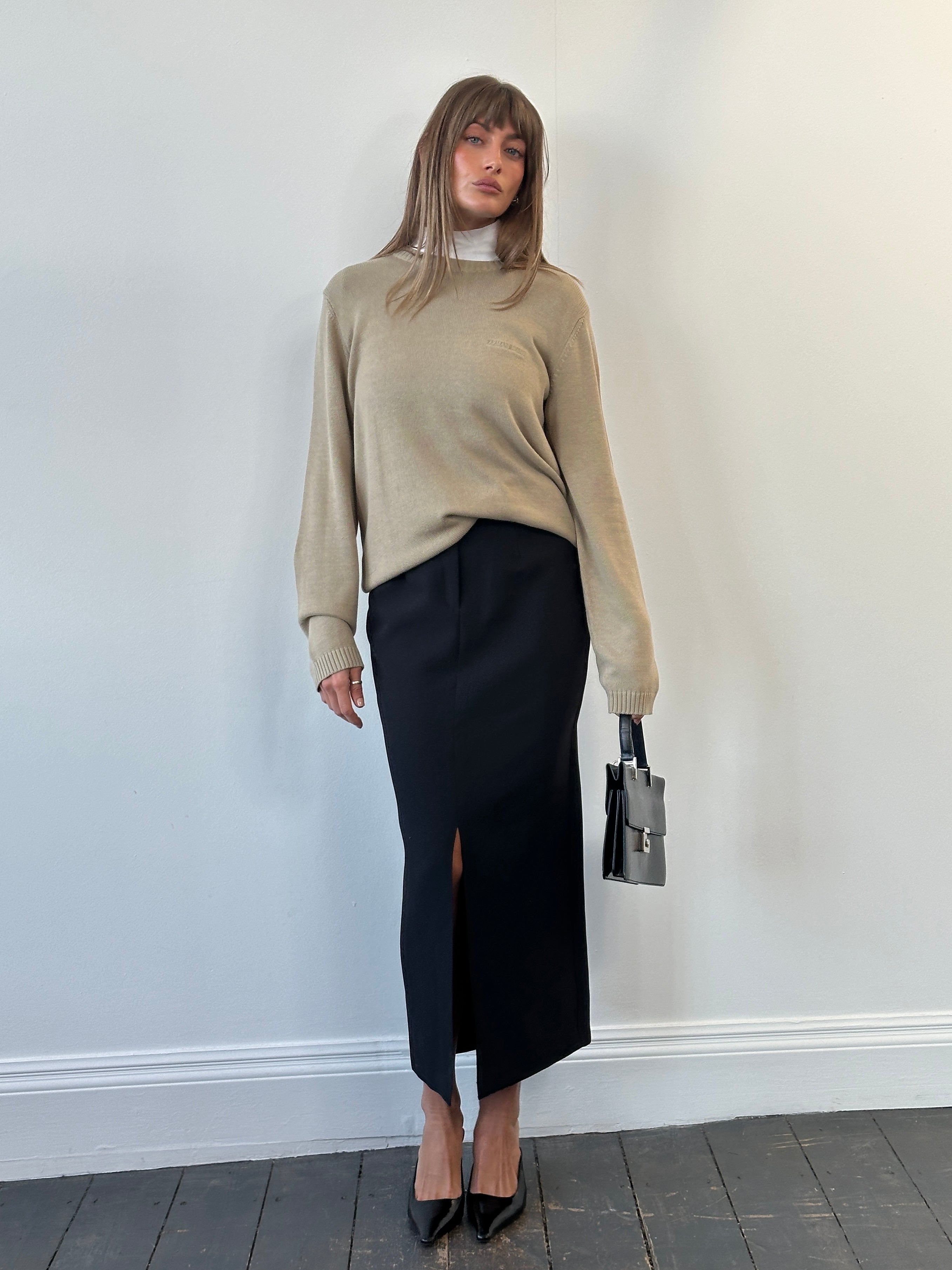 Vintage black Fodera 1990s Italian-made maxi skirt with a clean front split and a structured, minimal silhouette. New with original tags attached.
