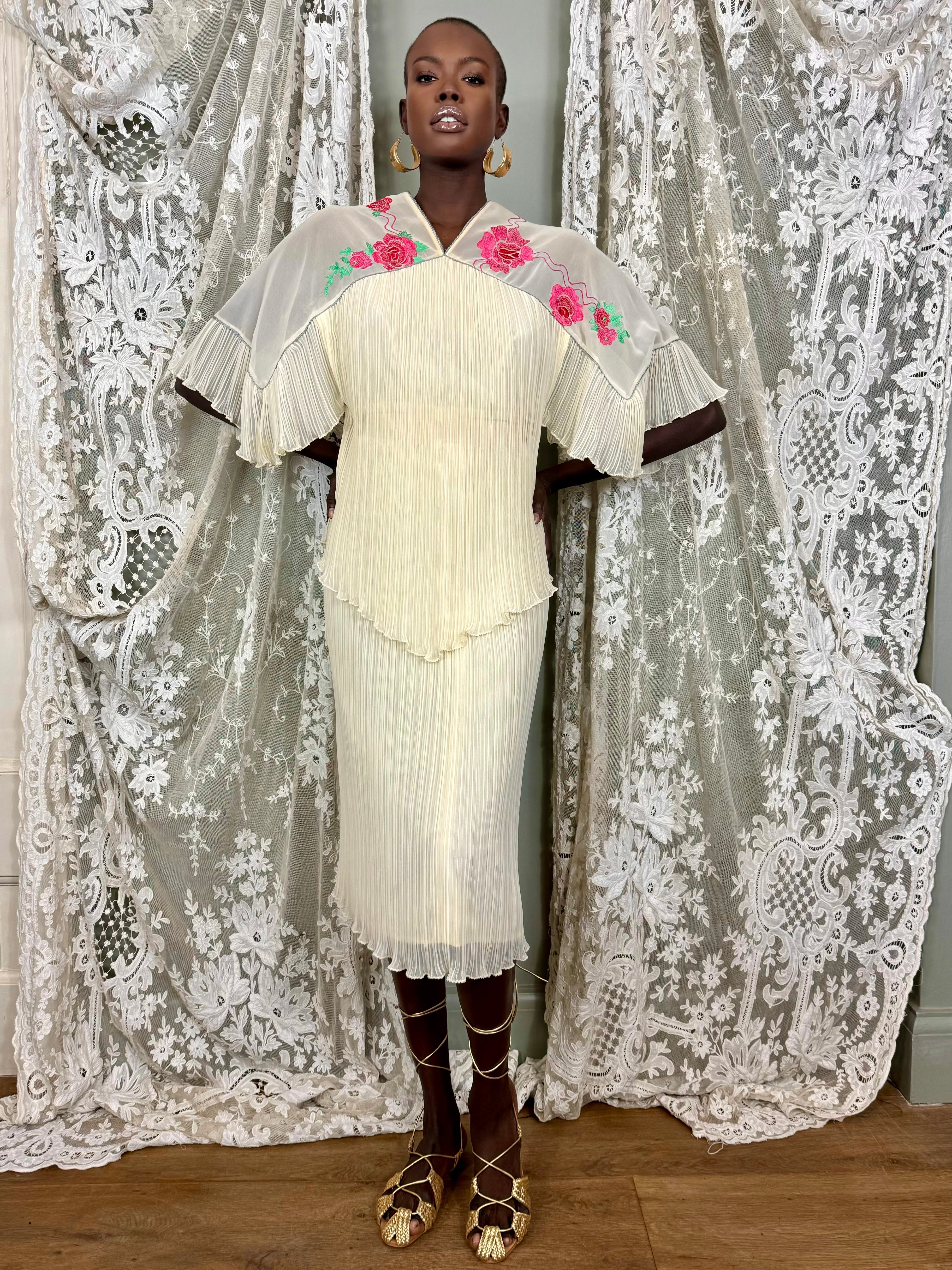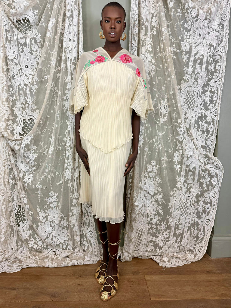 Collectable and rare Janice Wainwright 70s floral embroidered blouse and skirt set. The short wide sleeve blouse features intricate floral embroidery and a micro pleated and handkerchief design, while the midi skirt comes lined for added comfort.