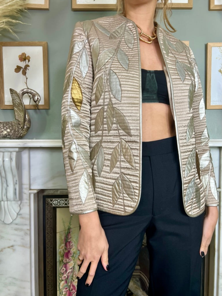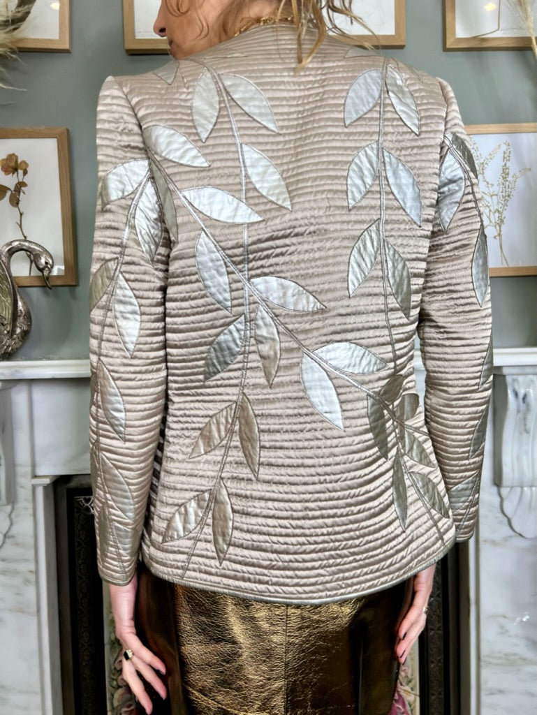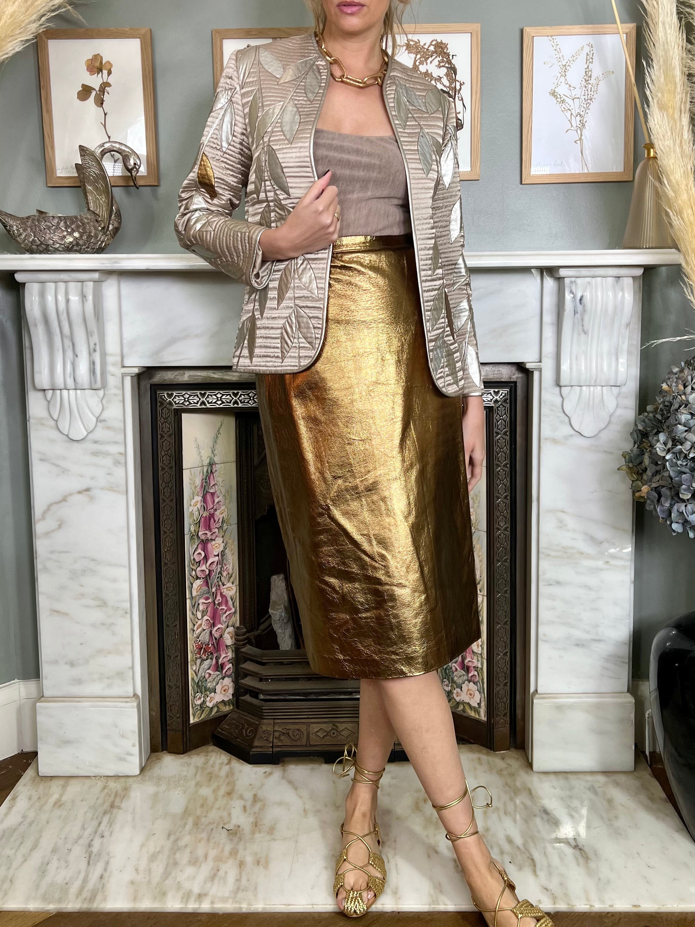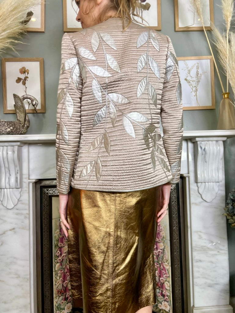 Gorgeous and unique, thinly quilted, collarless jacket with silver and bronze appliqué by Lisandro Sarasola. Has long sleeves and a straight cut. Has a single hook and eye in the centre but looks fab left open too. Comes with. pencil skirt in bronze leather. The skirt has a side leg slit and a zip and button fastening. Both can be worn as separates as photographed here.