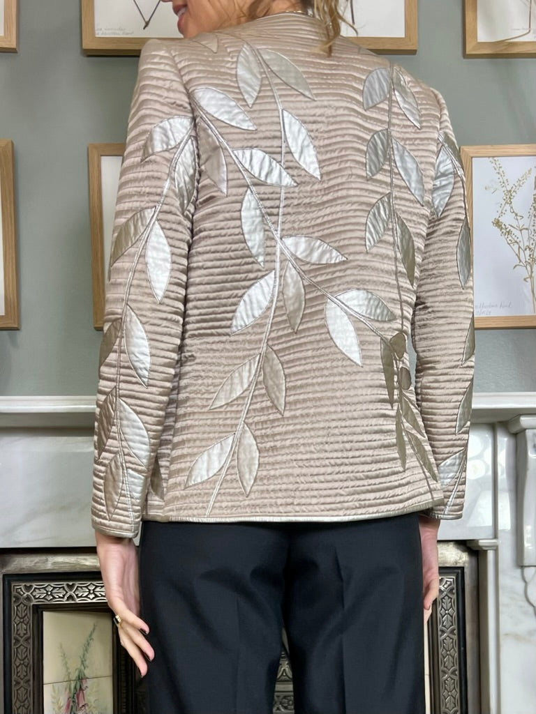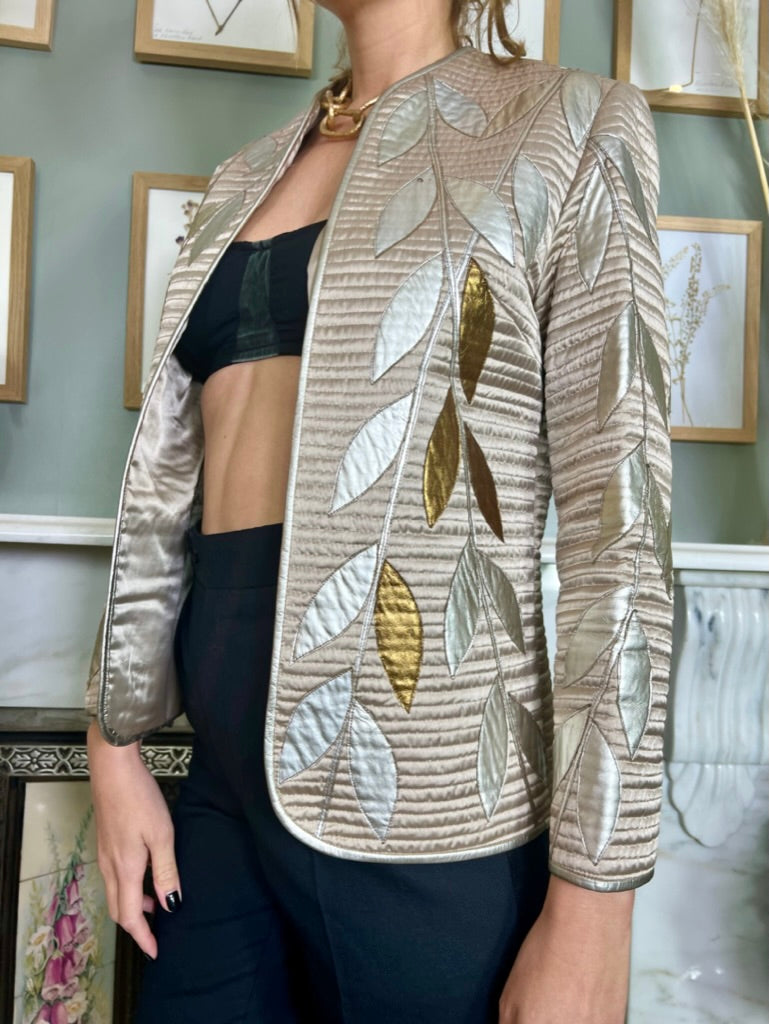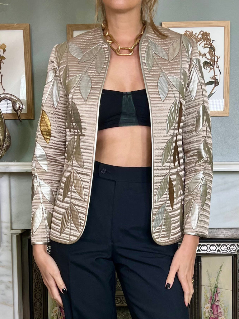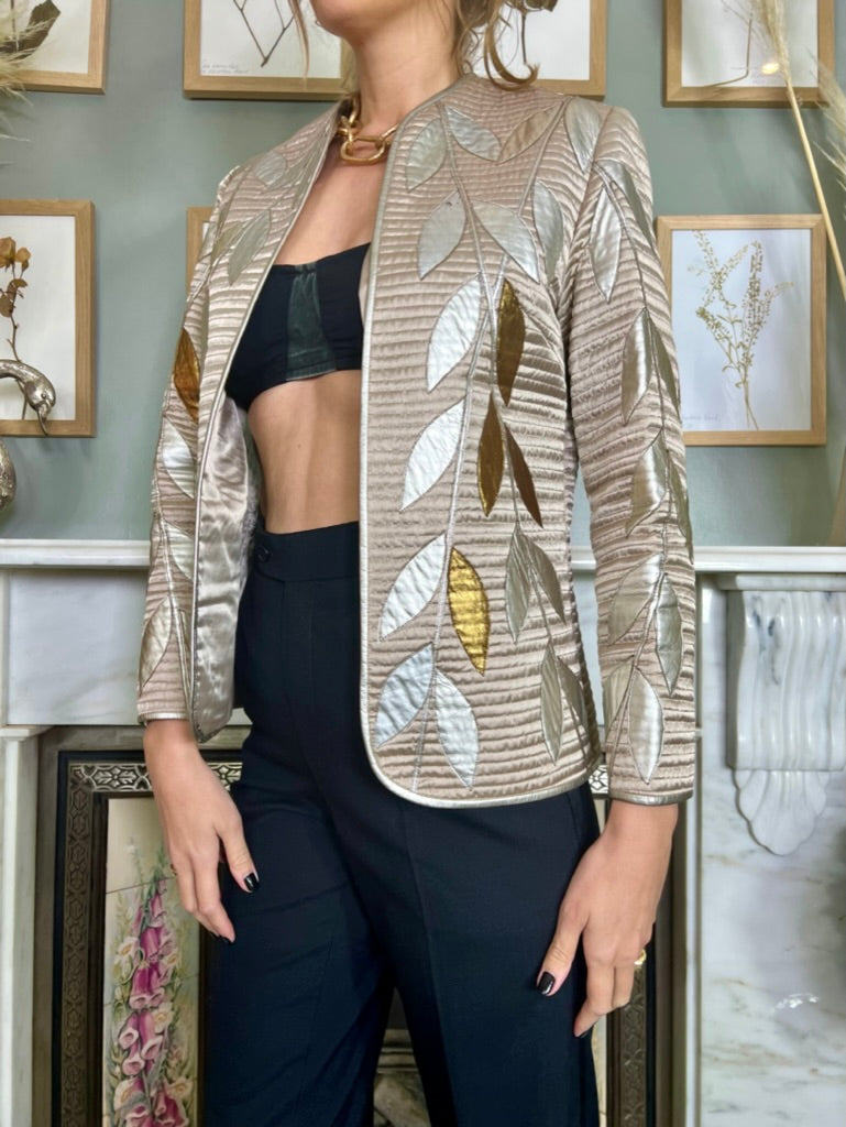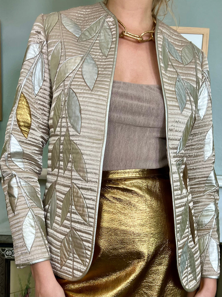 Gorgeous and unique, thinly quilted, collarless jacket with silver and bronze appliqué by Lisandro Sarasola. Has long sleeves and a straight cut. Has a single hook and eye in the centre but looks fab left open too. Comes with. pencil skirt in bronze leather. The skirt has a side leg slit and a zip and button fastening. Both can be worn as separates as photographed here.