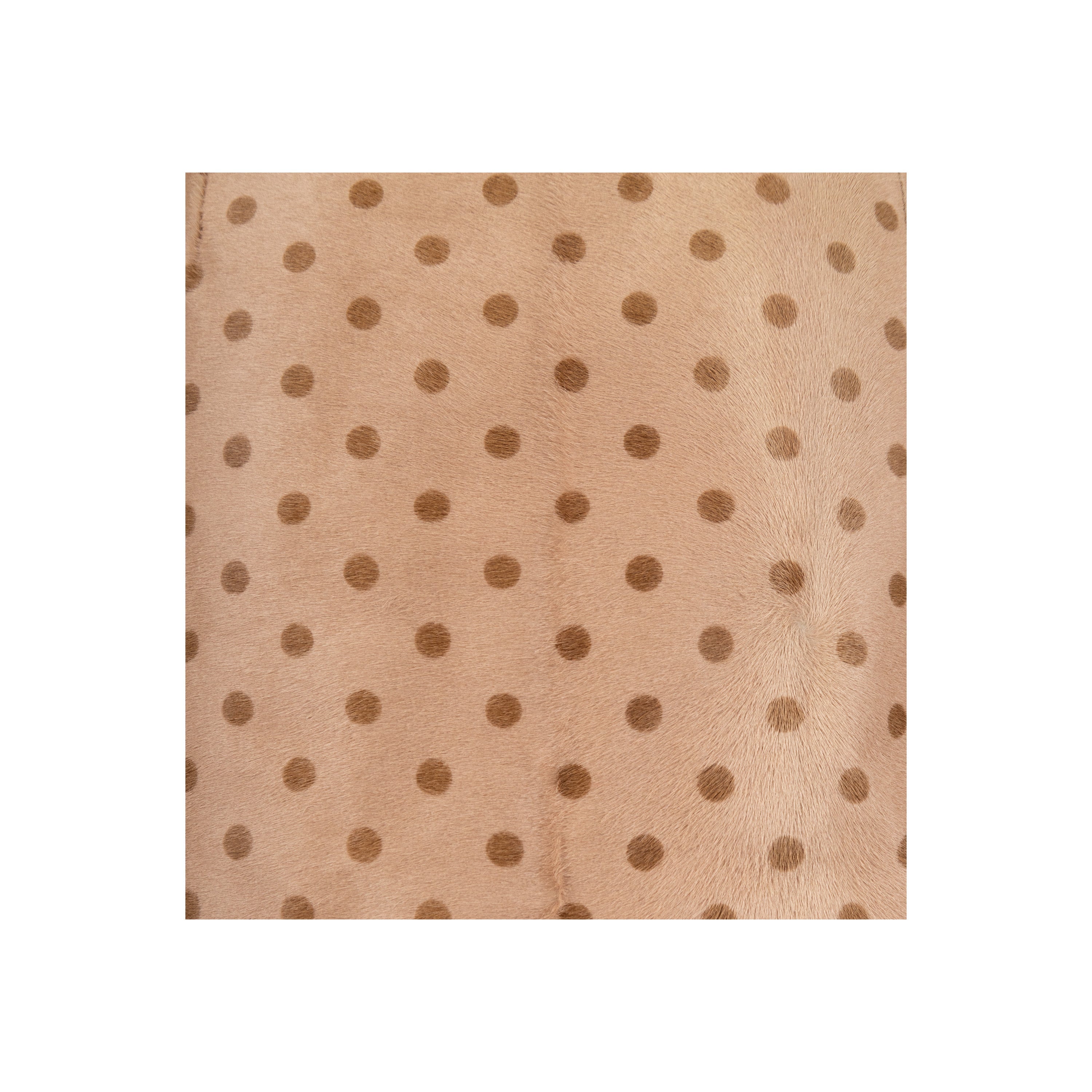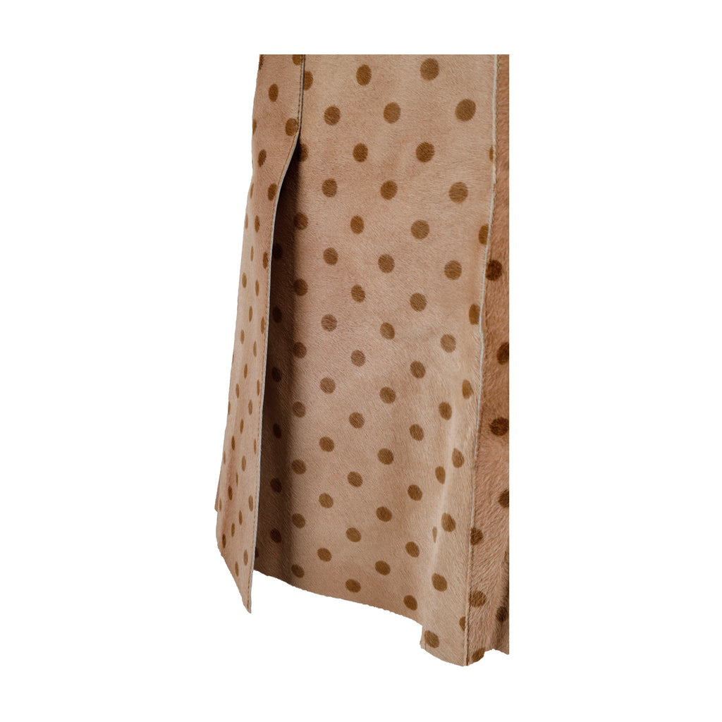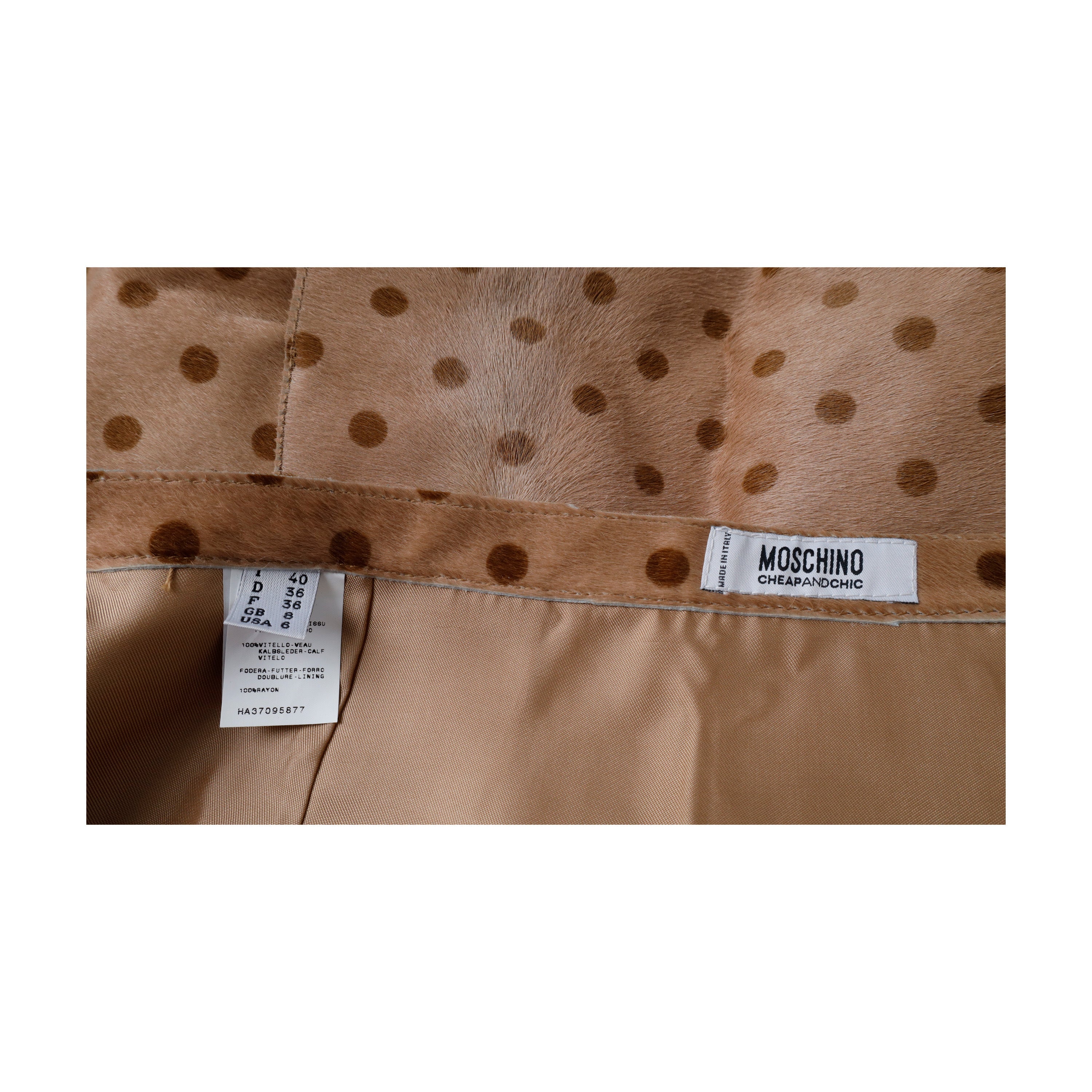 Expertly crafted from luxurious calfskin, the Moschino Cheap and Chic skirt adds a touch of vintage charm to any outfit. With its playful polka dot print and structured silhouette, this knee-length skirt is a must-have for any fashion-forward wardrobe. The pleated detail and side slit offer both style and practicality, while the rayon lining ensures a comfortable fit.