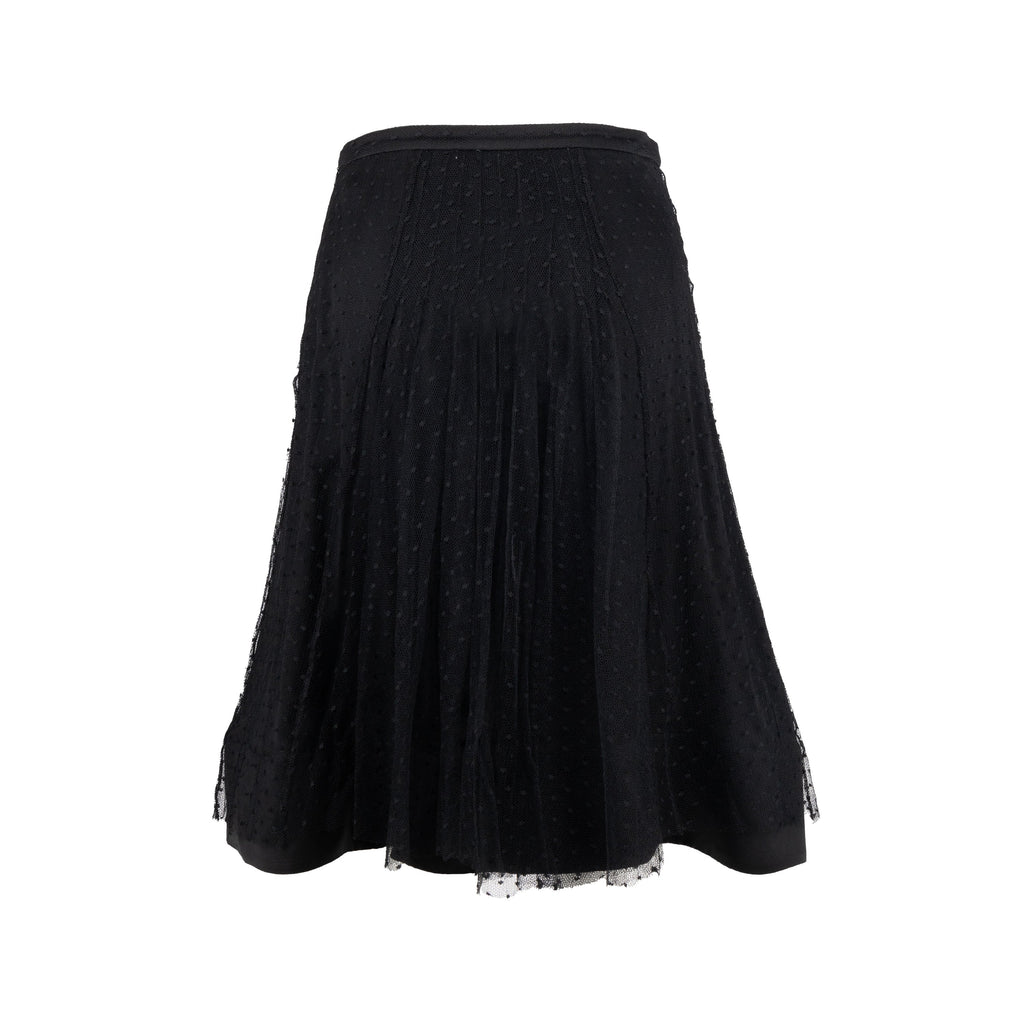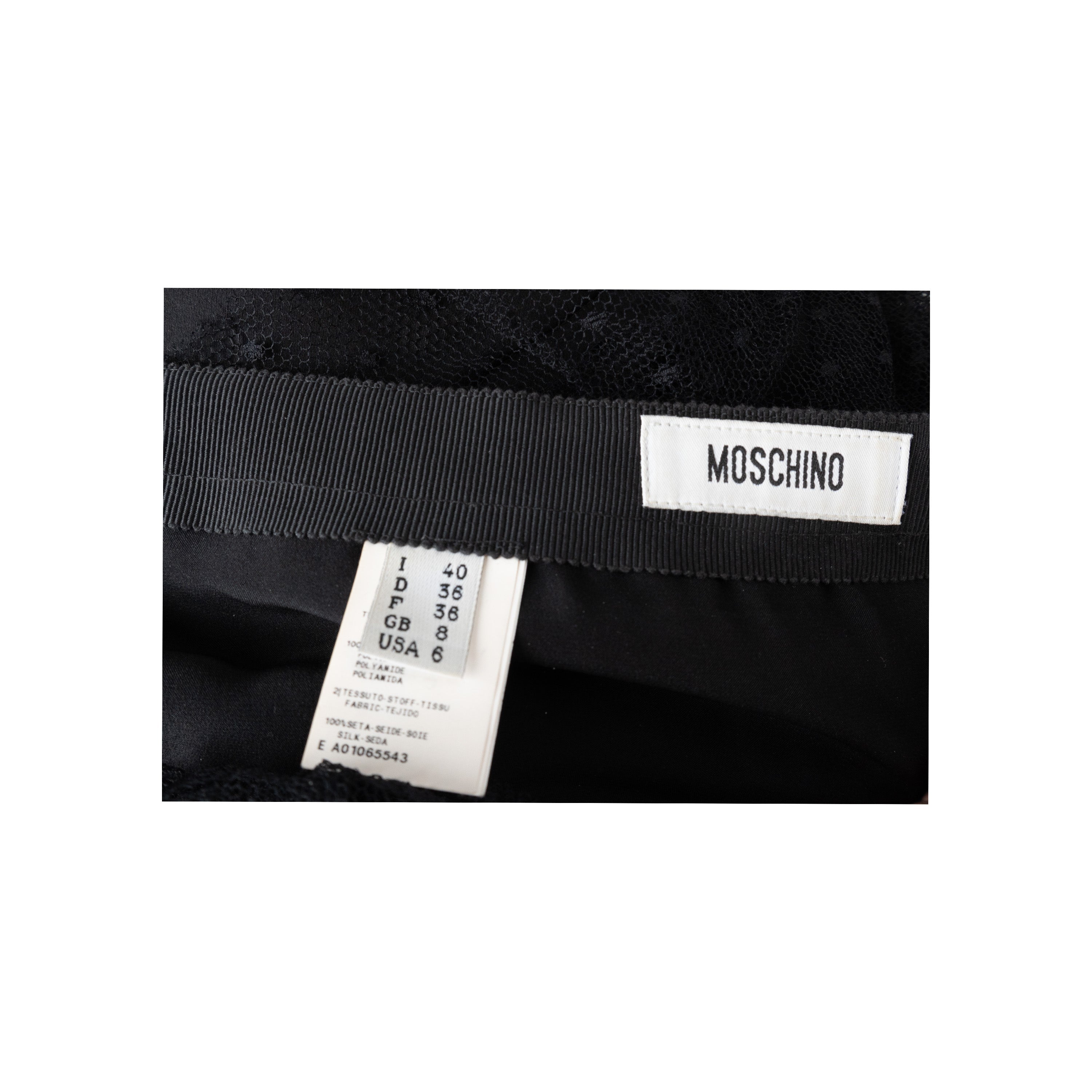 This Moschino skirt features a silk lining with overlay of a dotted mesh lace fabric. The pleats in the middle create dimensional flair for this knee-length skirt. Perfect for adding a touch of sophistication to any outfit.