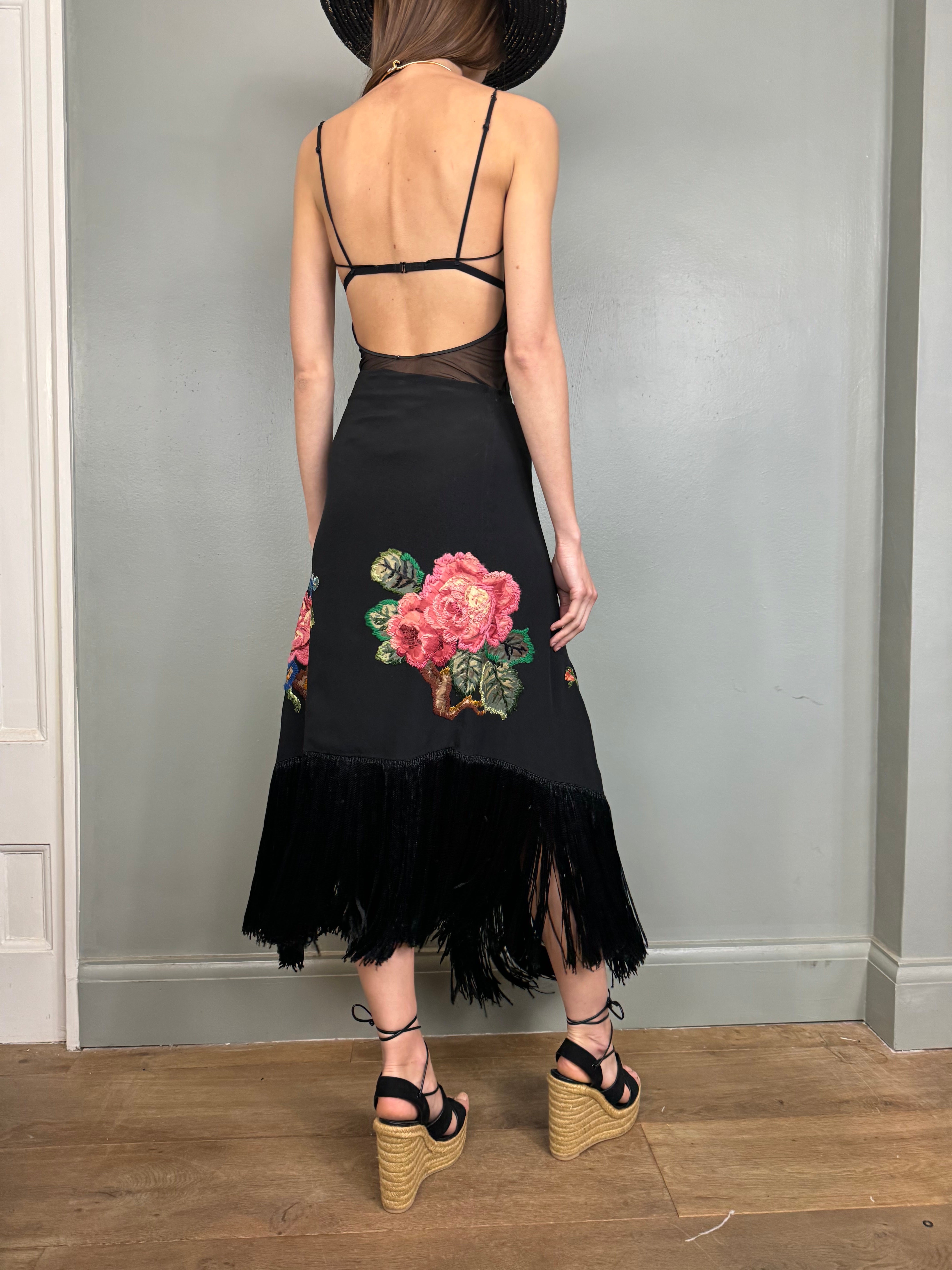 Crafted from a reworked 20s shawl, this piece is adorned with intricate, hand embroidered floral details. The silk fringe adds a playful touch, while the black silk lining ensures comfort. Finished with a front button closure, this skirt is a unique and elegant addition to any wardrobe.
