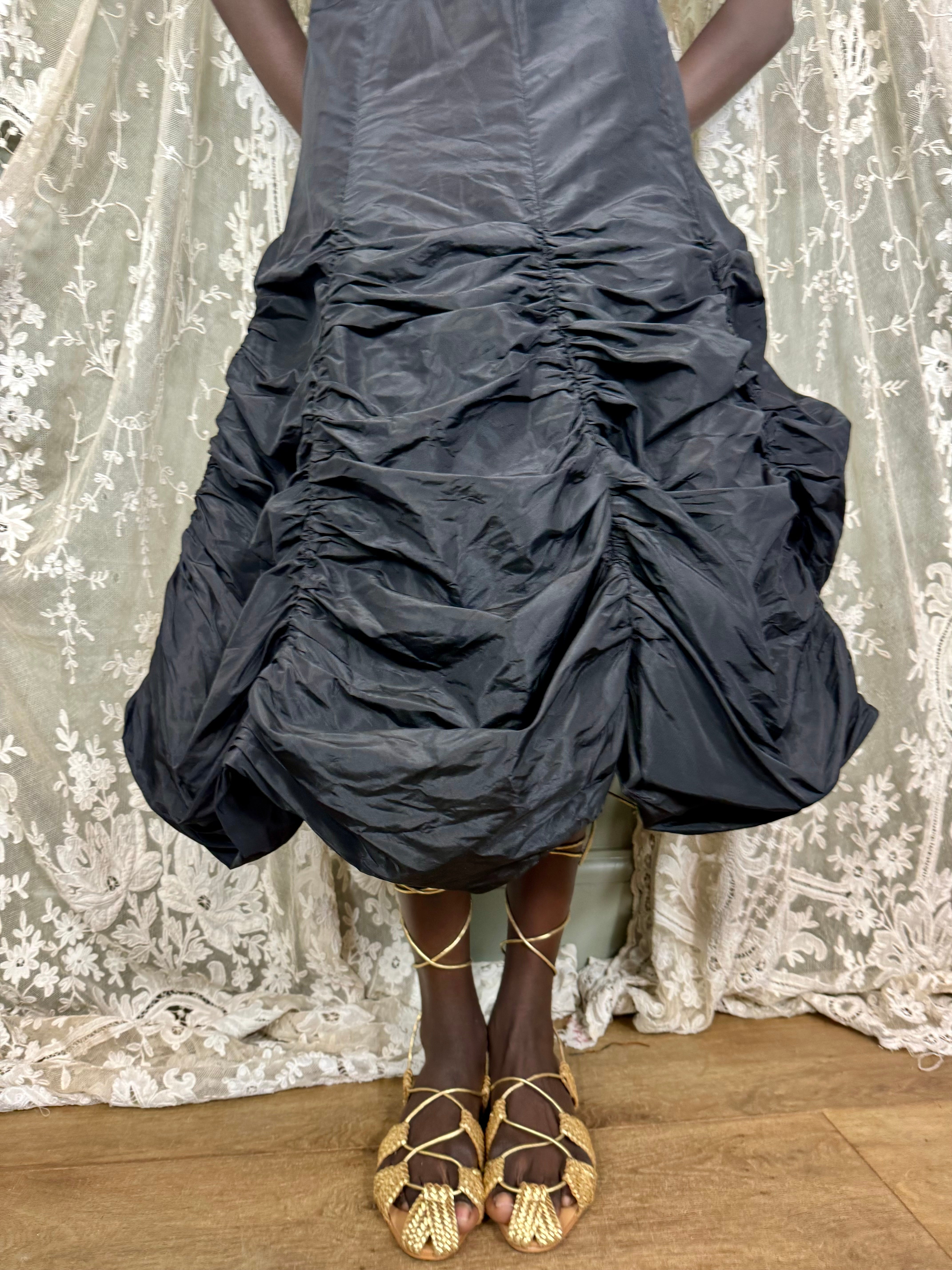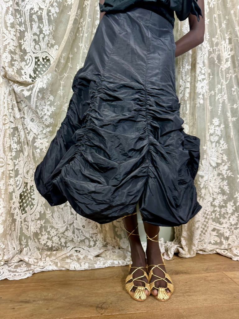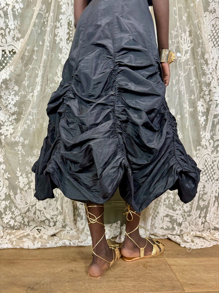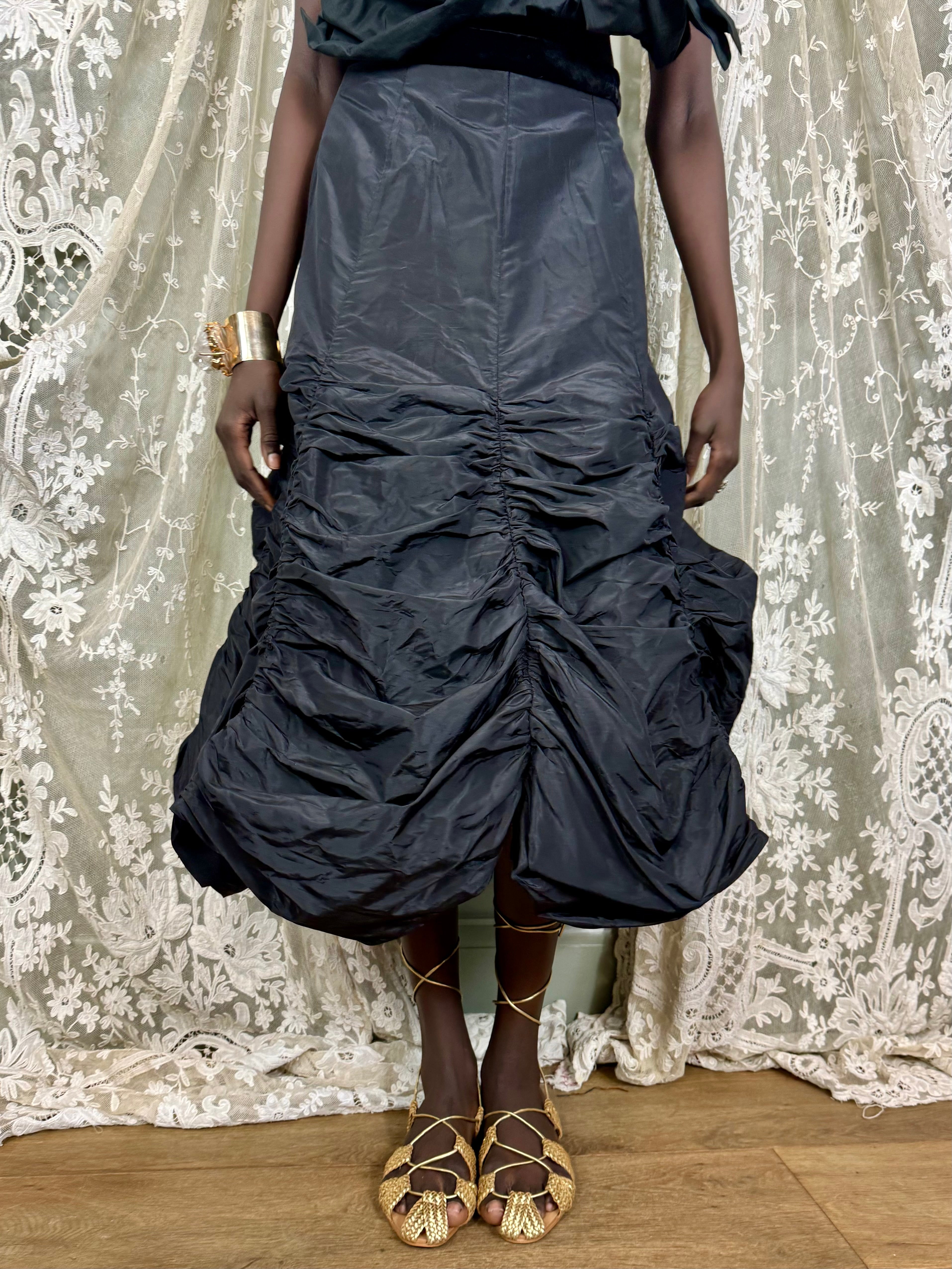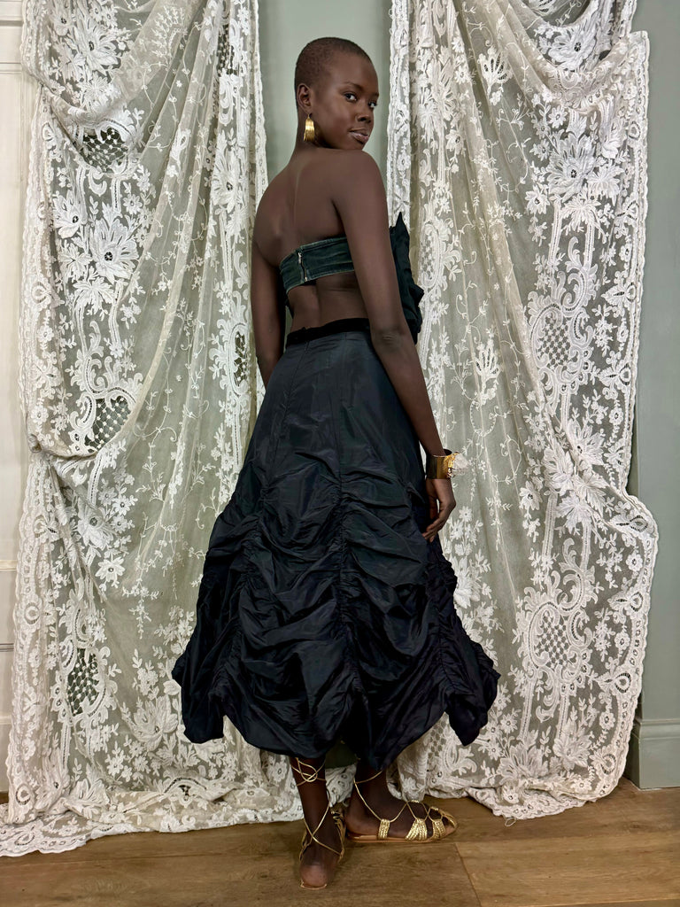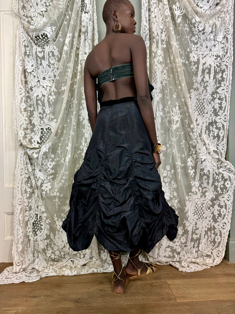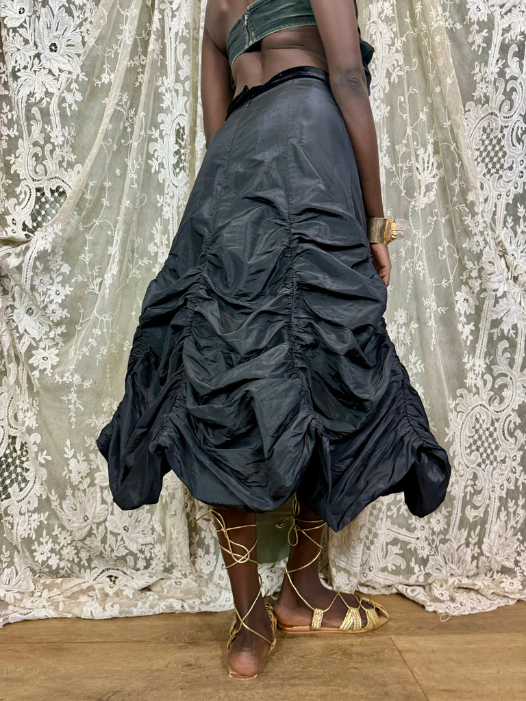 Discover this stunning 80s black parachute draped taffeta skirt, perfect for any occasion. Featuring a velvet waistband and button fastening, this A-line skirt boasts a luxurious draped design for a flattering fit.