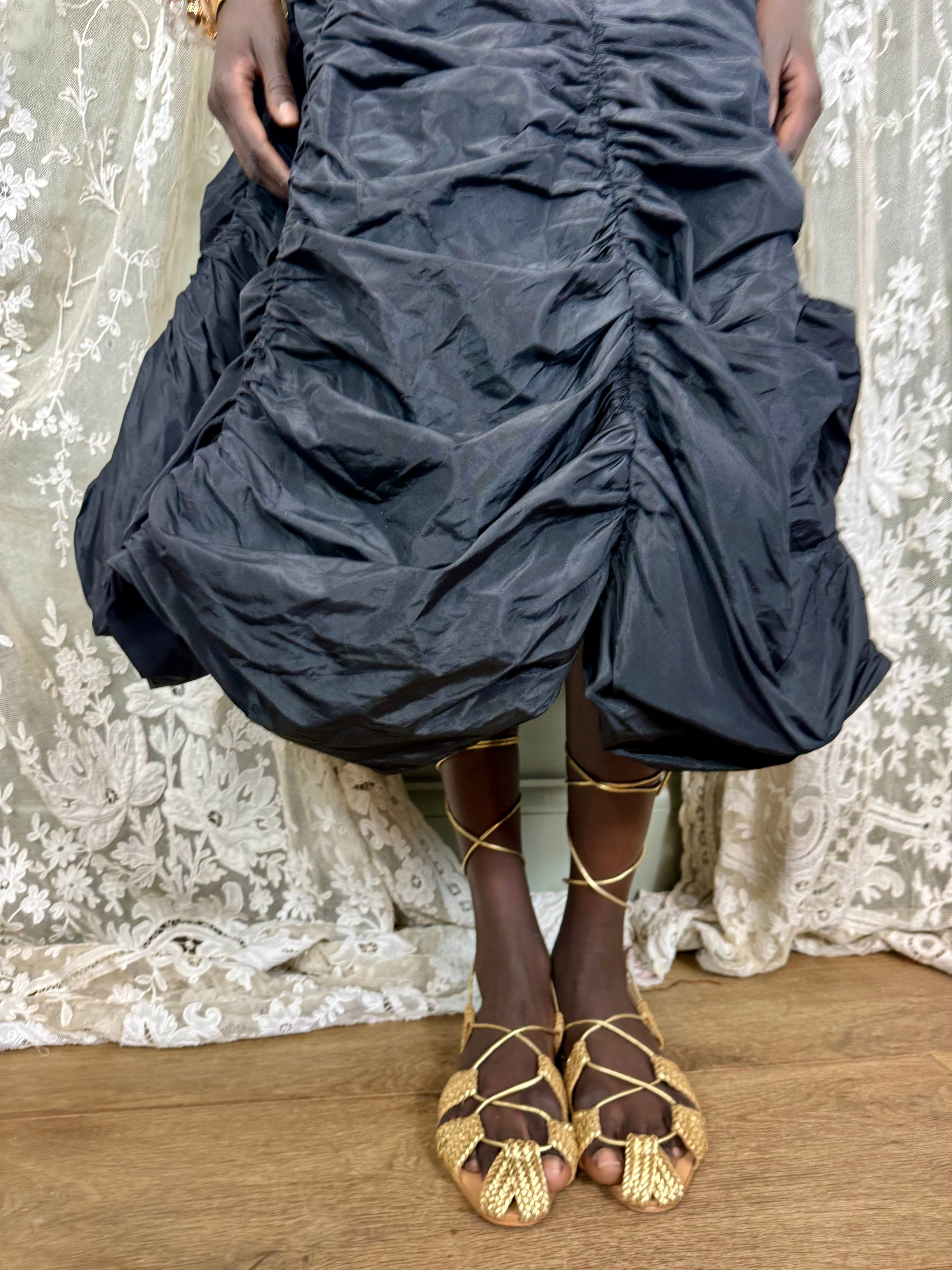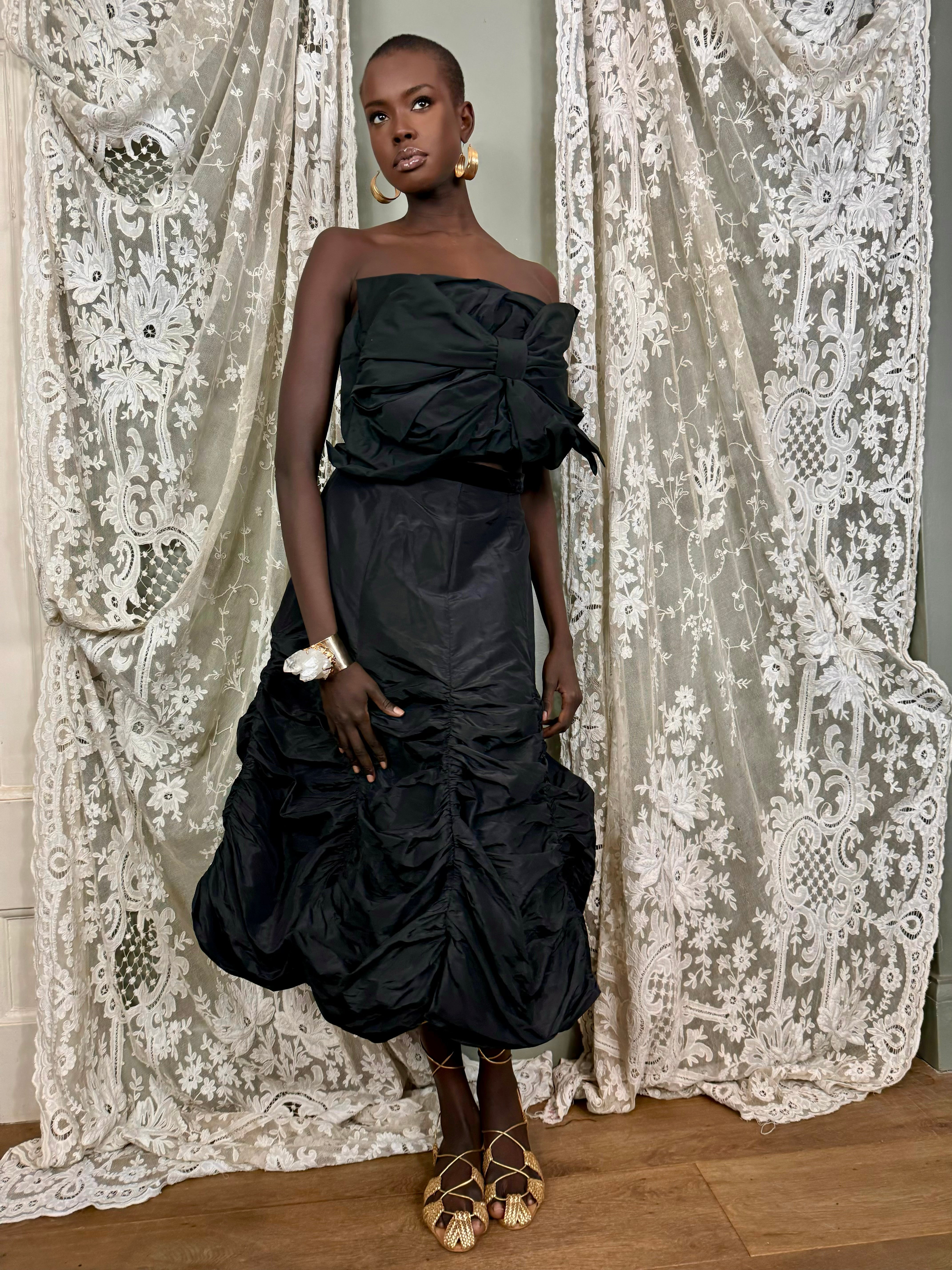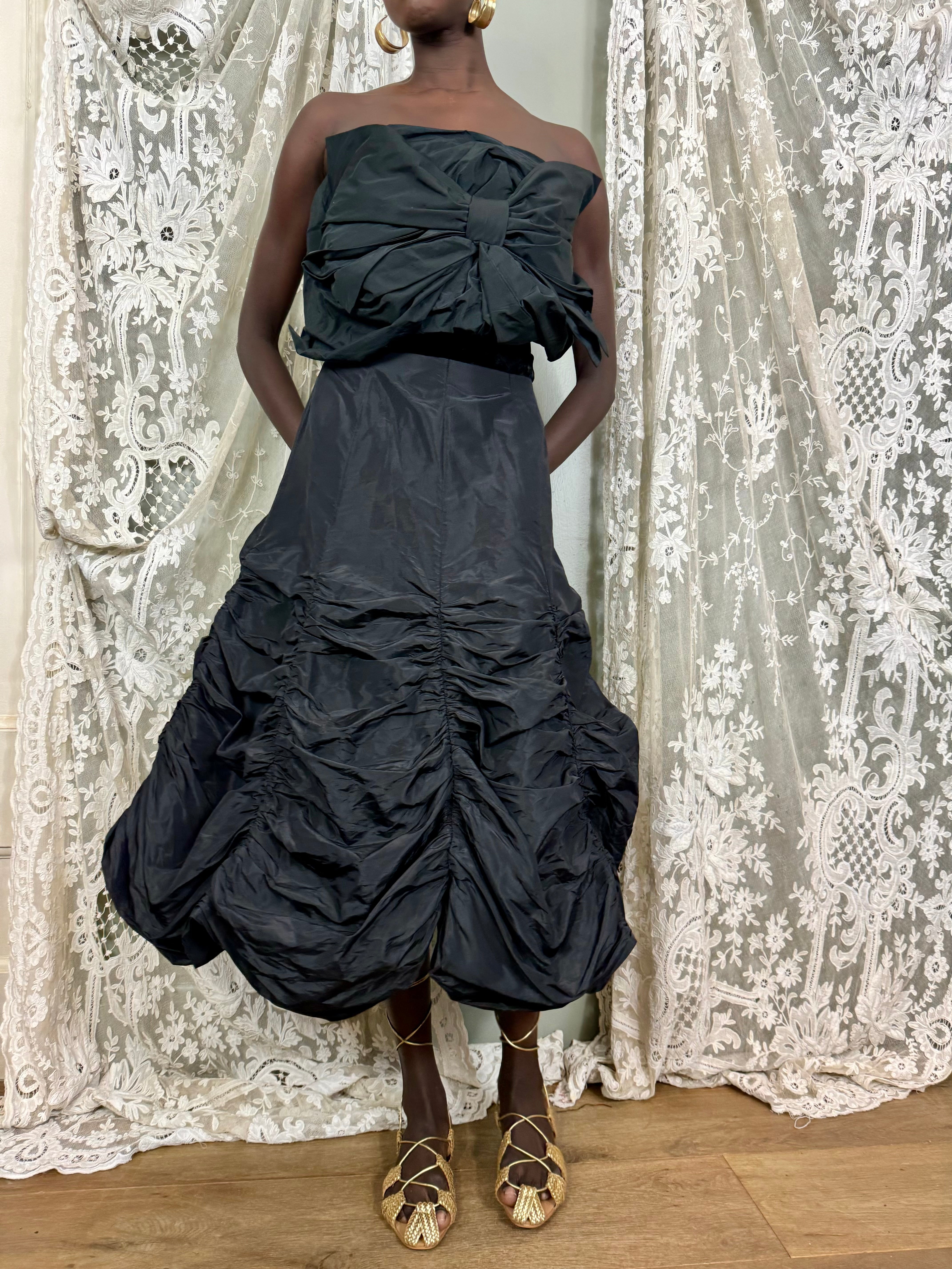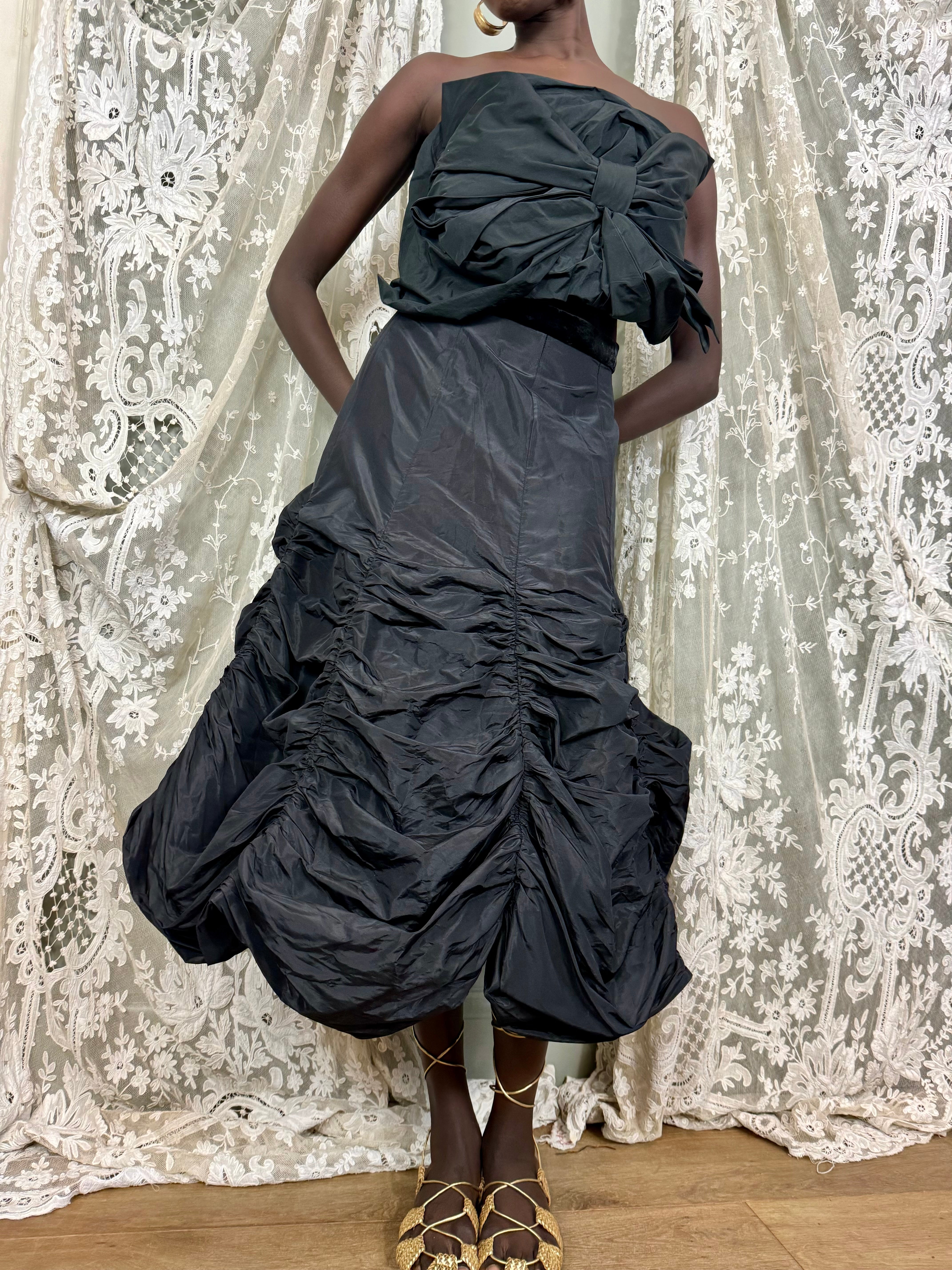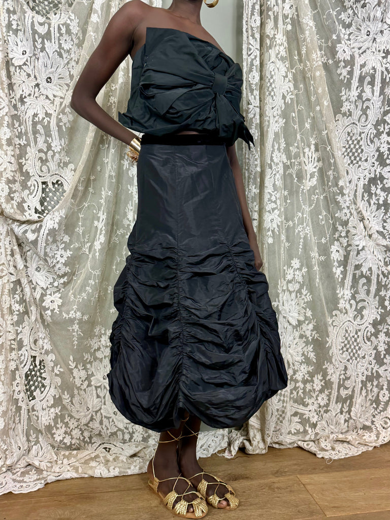 Discover this stunning 80s black parachute draped taffeta skirt, perfect for any occasion. Featuring a velvet waistband and button fastening, this A-line skirt boasts a luxurious draped design for a flattering fit.
