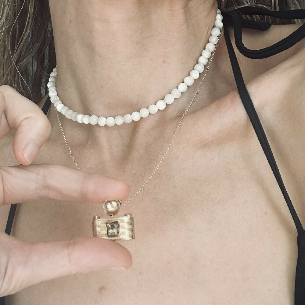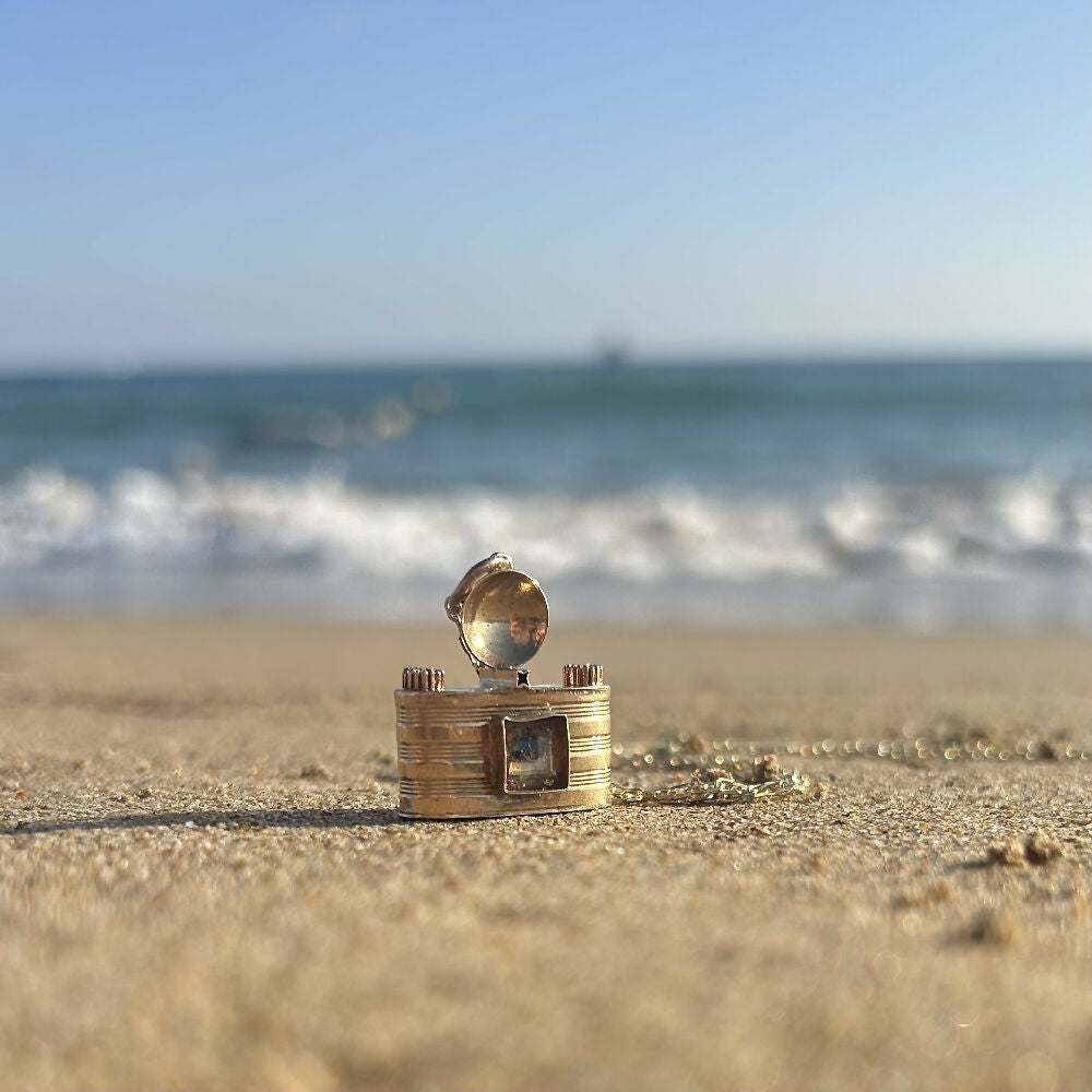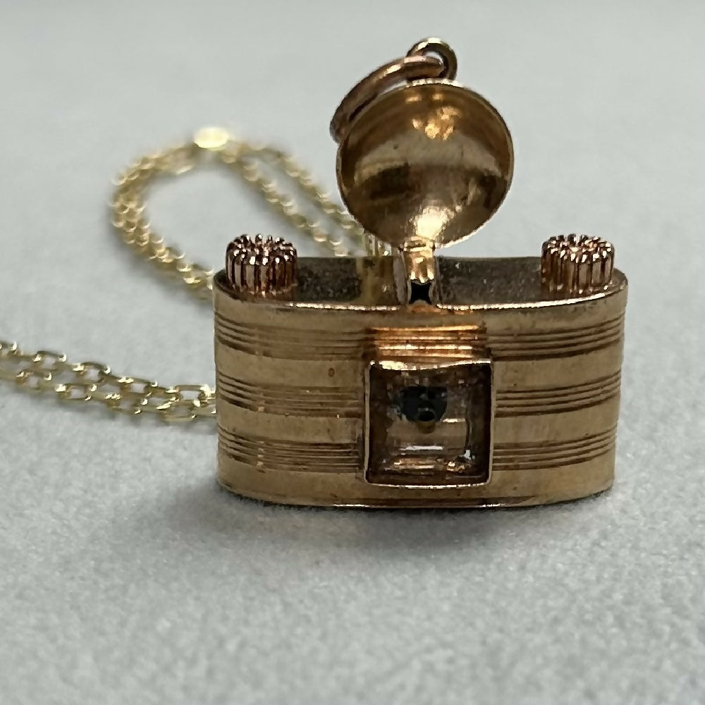 This charming Vintage Gold Camera is crafted in solid 9ct gold with full hallmark and finished with a sparkling cut glass lens detail. It’s beautifully detailed and suspends from a diamond cut square belcher chain - a unique and ever so cute necklace.