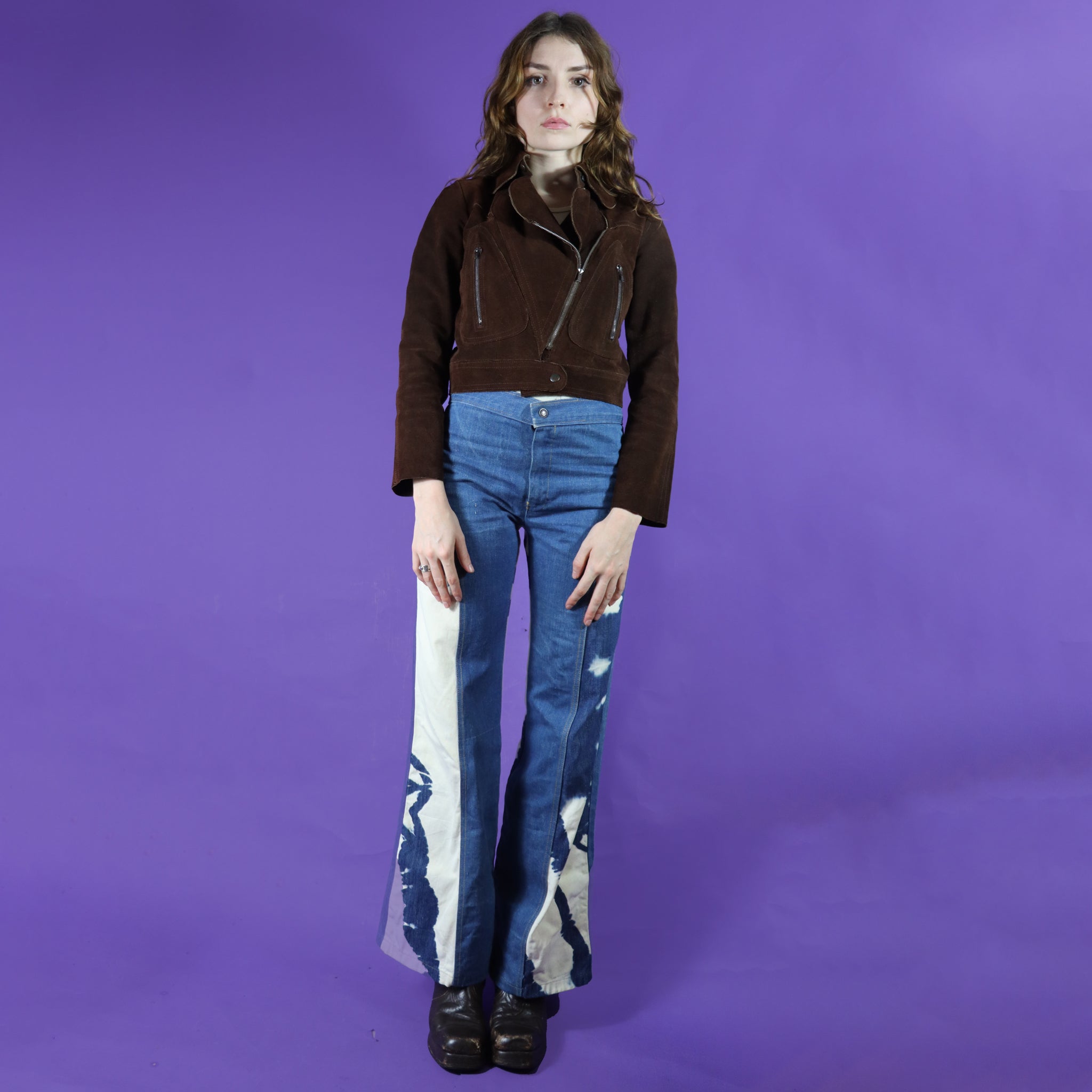 beautiful vintage 1970s chocolate brown suede jacket. Super western cowboy in styling with beautiful panelling. Cropped length and rounded collar with angular zipper. The suede used is of very high quality. Pair with high waisted flares!