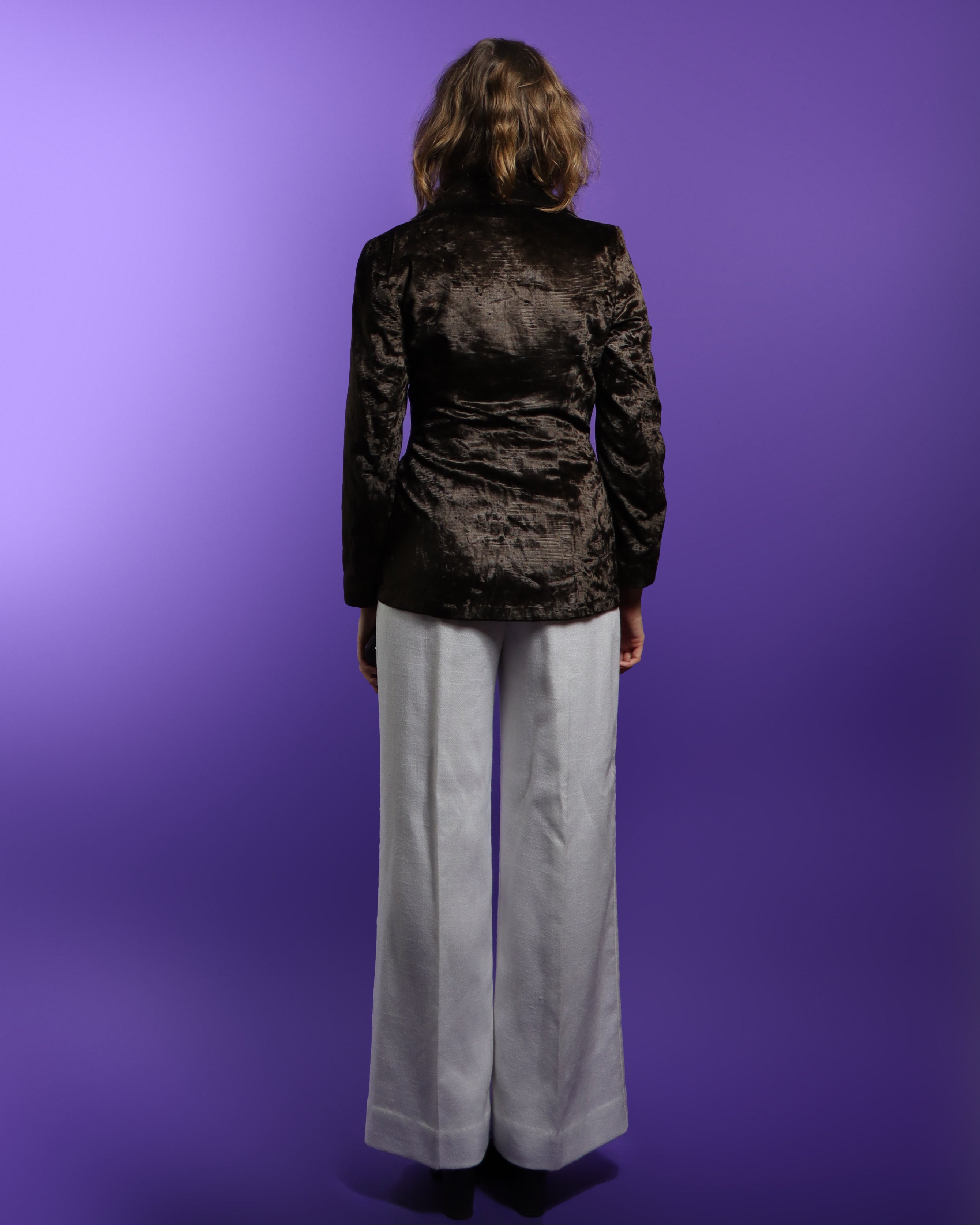 Fabulous vintage 1970s chocolate brown crushed velvet blazer. Appears to be handmade with so much care & by a fantastic cutter- features dramatic wide notched lapel, patch pockets and covered buttons. Such a magical, lustrous fabric! Fully lined and features matching ribbon buttons.