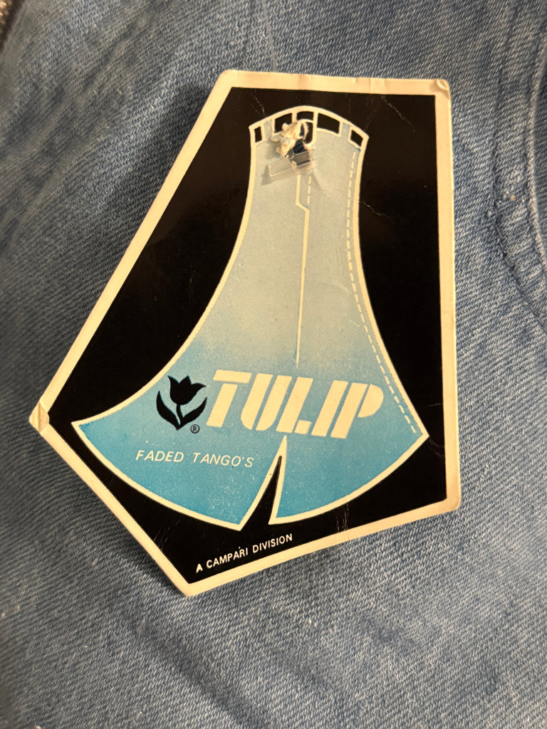 Incredible vintage 1970s deadstock denim jeans by 'Black Tulip'( features a fabulous logo label!). Mega wide leg flares that drop from the hip, with a flattering high waistband and arrow panel detail on the back. Mid wash denim and a mid weight too- super comfortable! Ultra flattering and hard to come by cut.