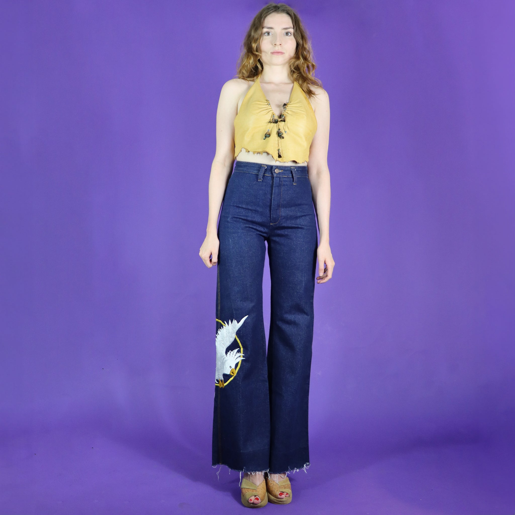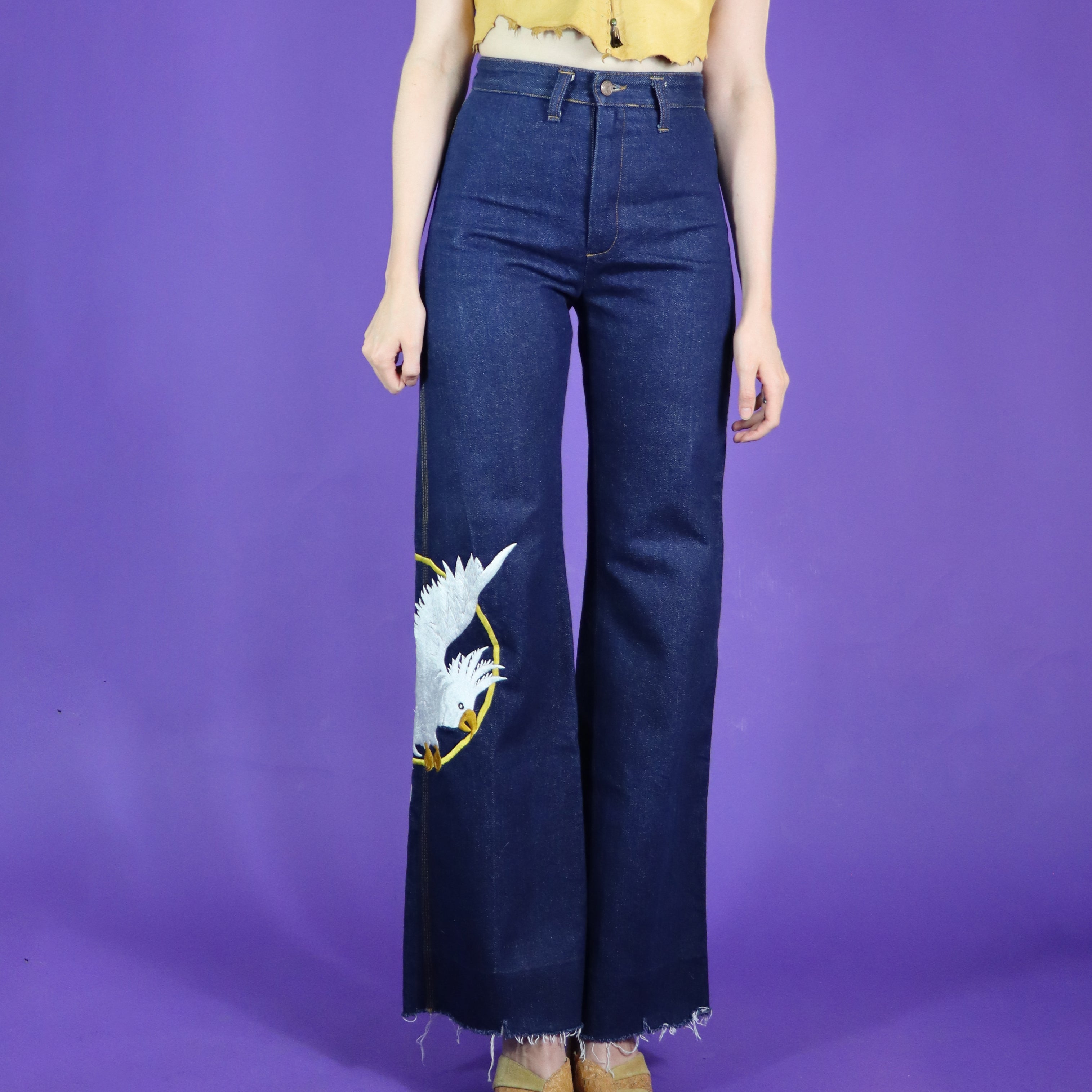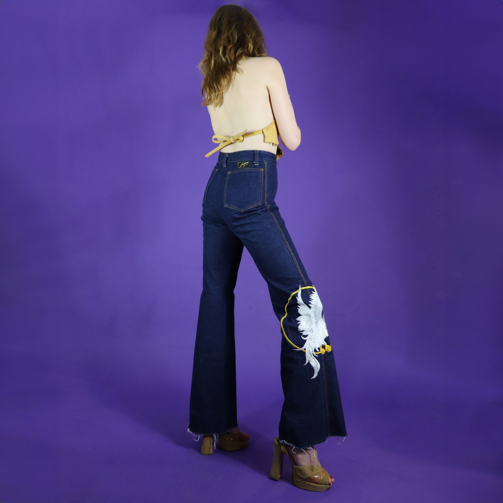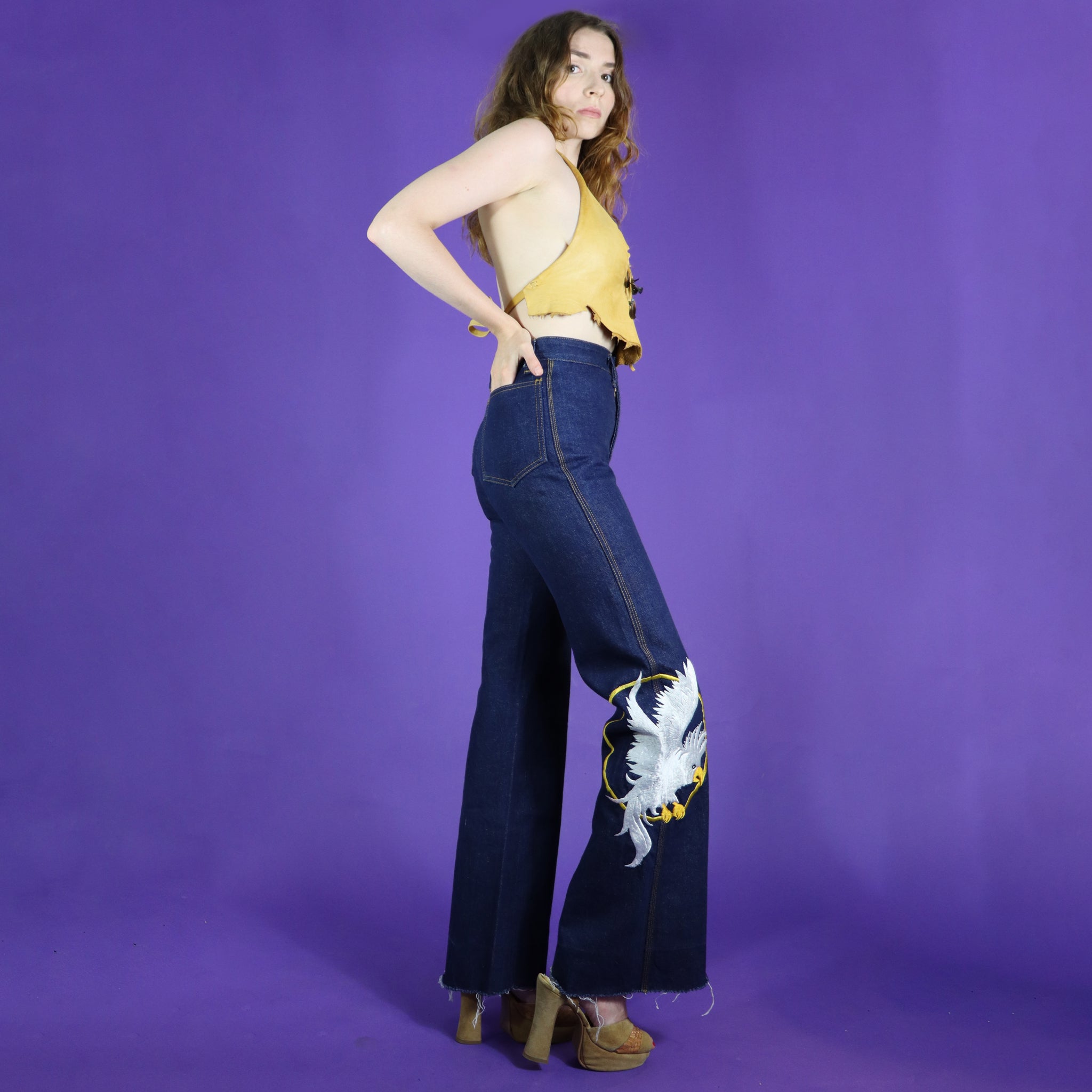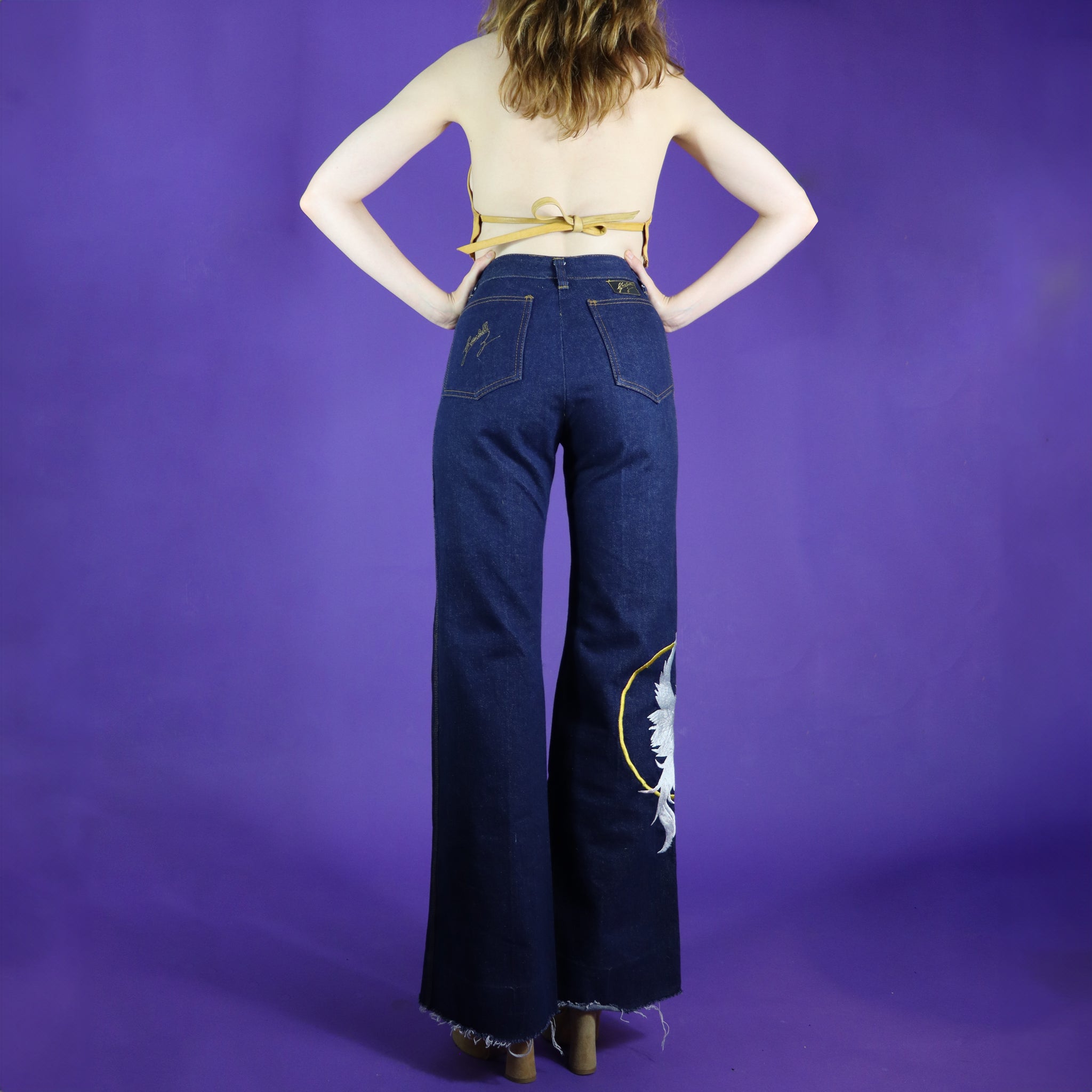 Vintage 1970s jeans by G Guebelli. High quality deep indigo denim with beautiful bird embroidery on one leg. Featuring a high waistband, flattering high set back patch pockets, classic flare cut, raw cut hem, embroidered signature style branding and golden double stitching throughout. The embroidery is so stunning; I love the gold circular framing of the bird. Such a special piece in fantastic, possibly unworn condition.