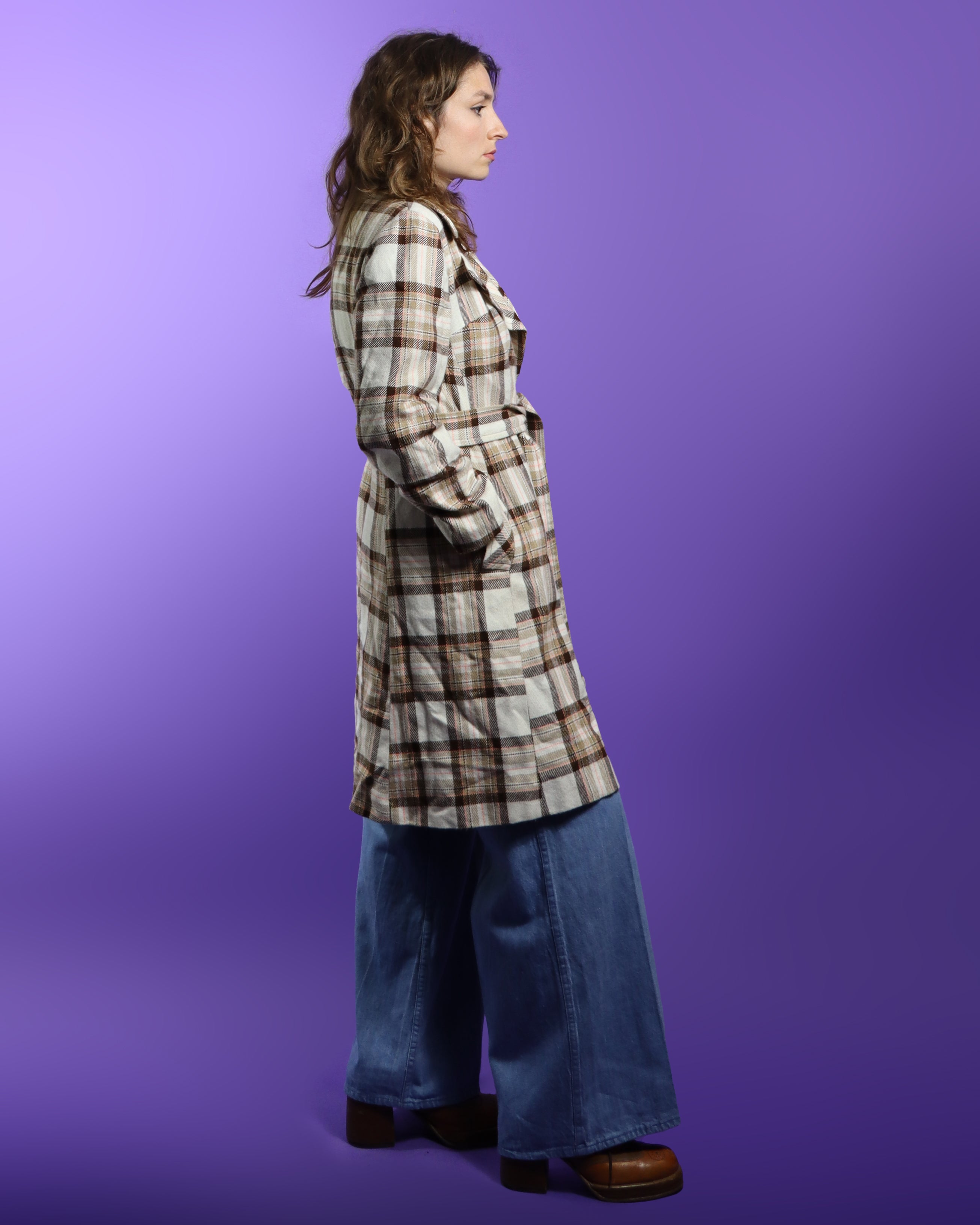 Fabulous vintage 1970s plaid woollen trench coat. Made from a lightweight soft weave in hues of cream, brown and psychedelic pink. Features a rounded wide lapel, matching tie waistband, side pockets and practical above the knee length. Full lining.