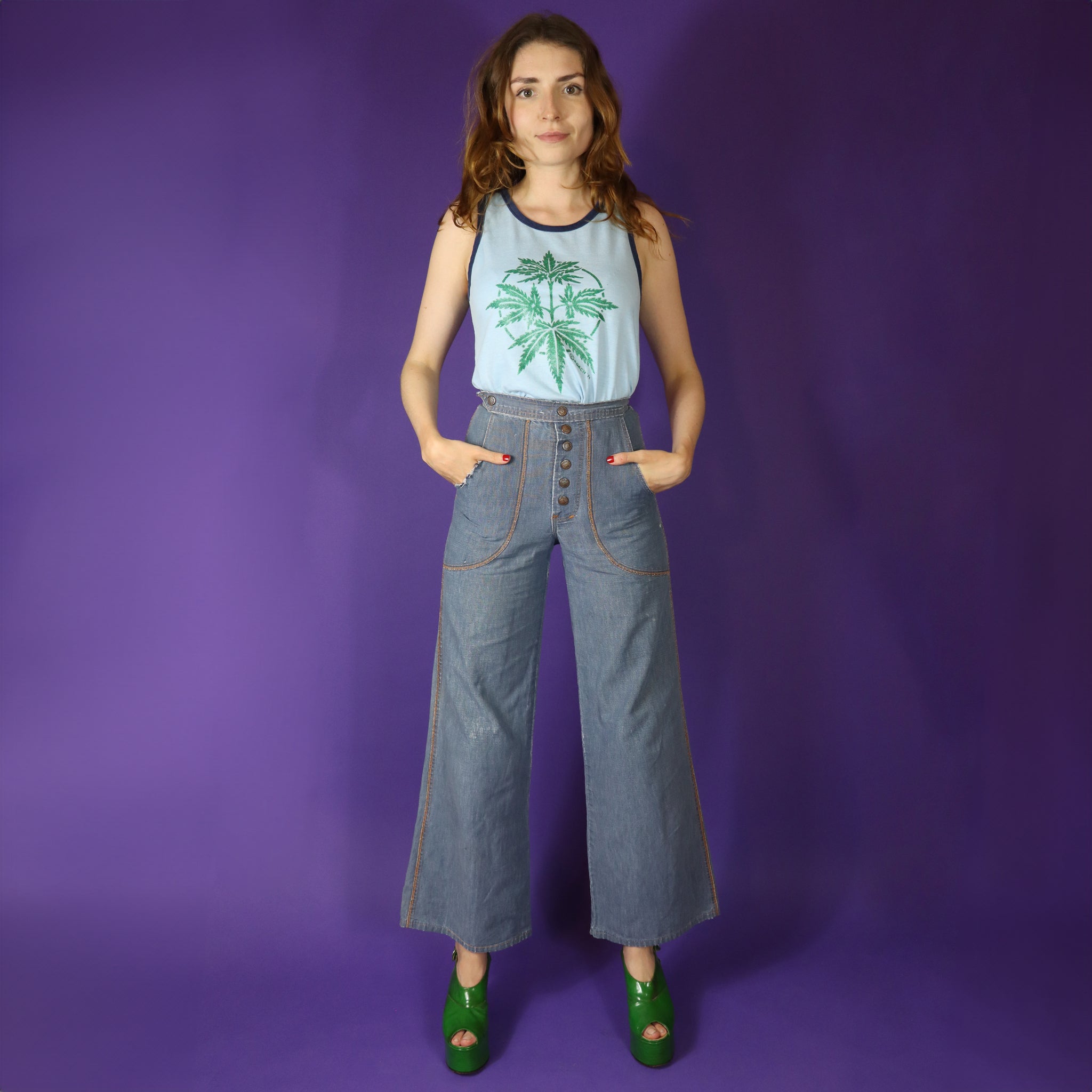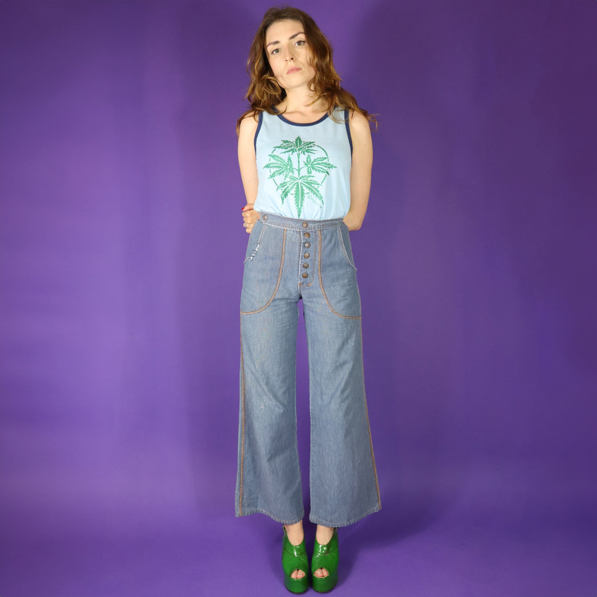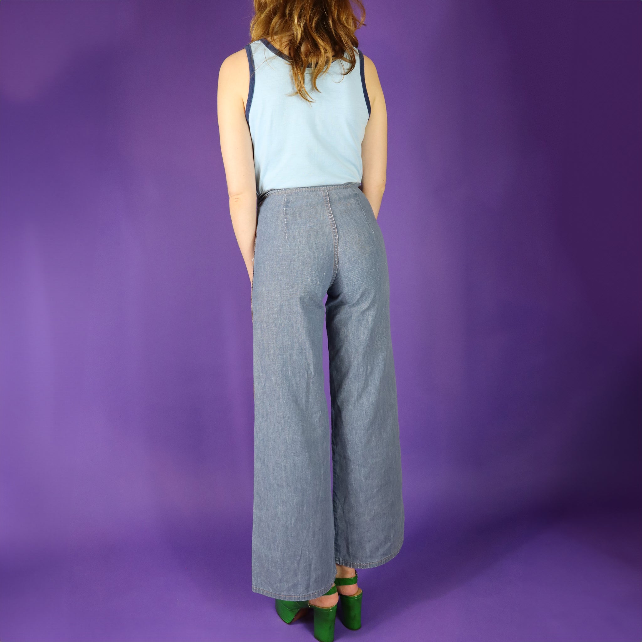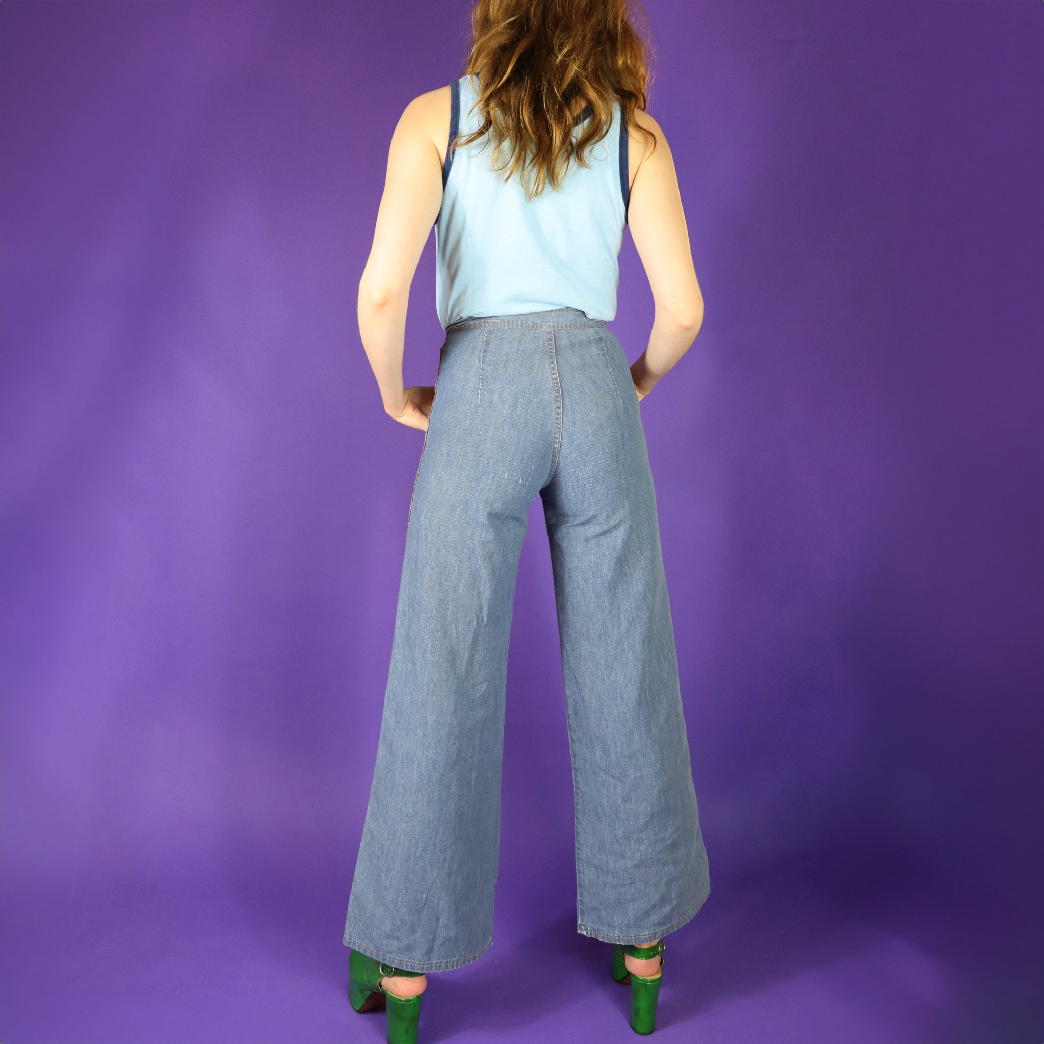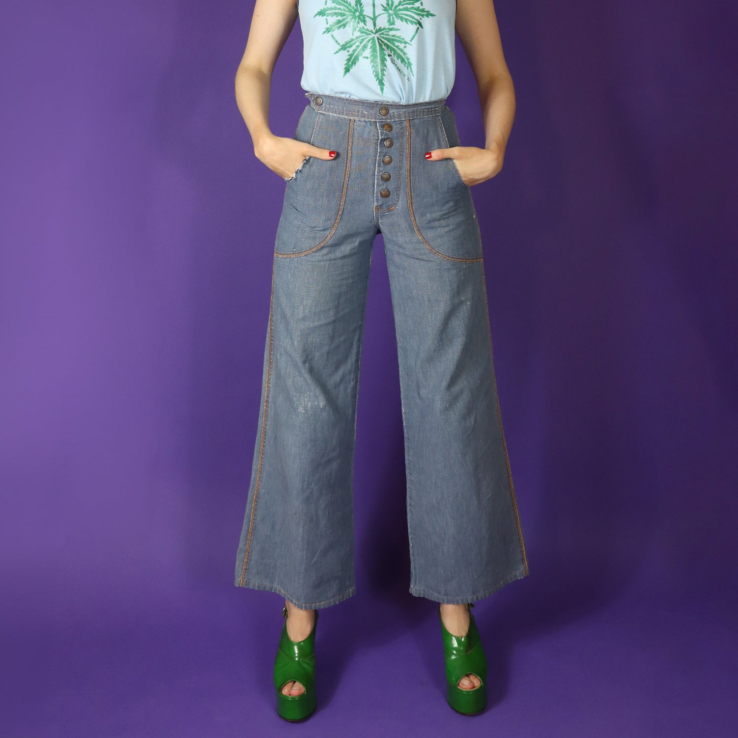 Super cool vintage 1970s denim flares. Designed with an inside out effect- interlock stitch detailing around the pockets and down the side of the legs. Super high waistband with wide leg flare and snapper fastenings up the front. In a cool grey toned denim. Nice & lightweight and perfect for the summertime.