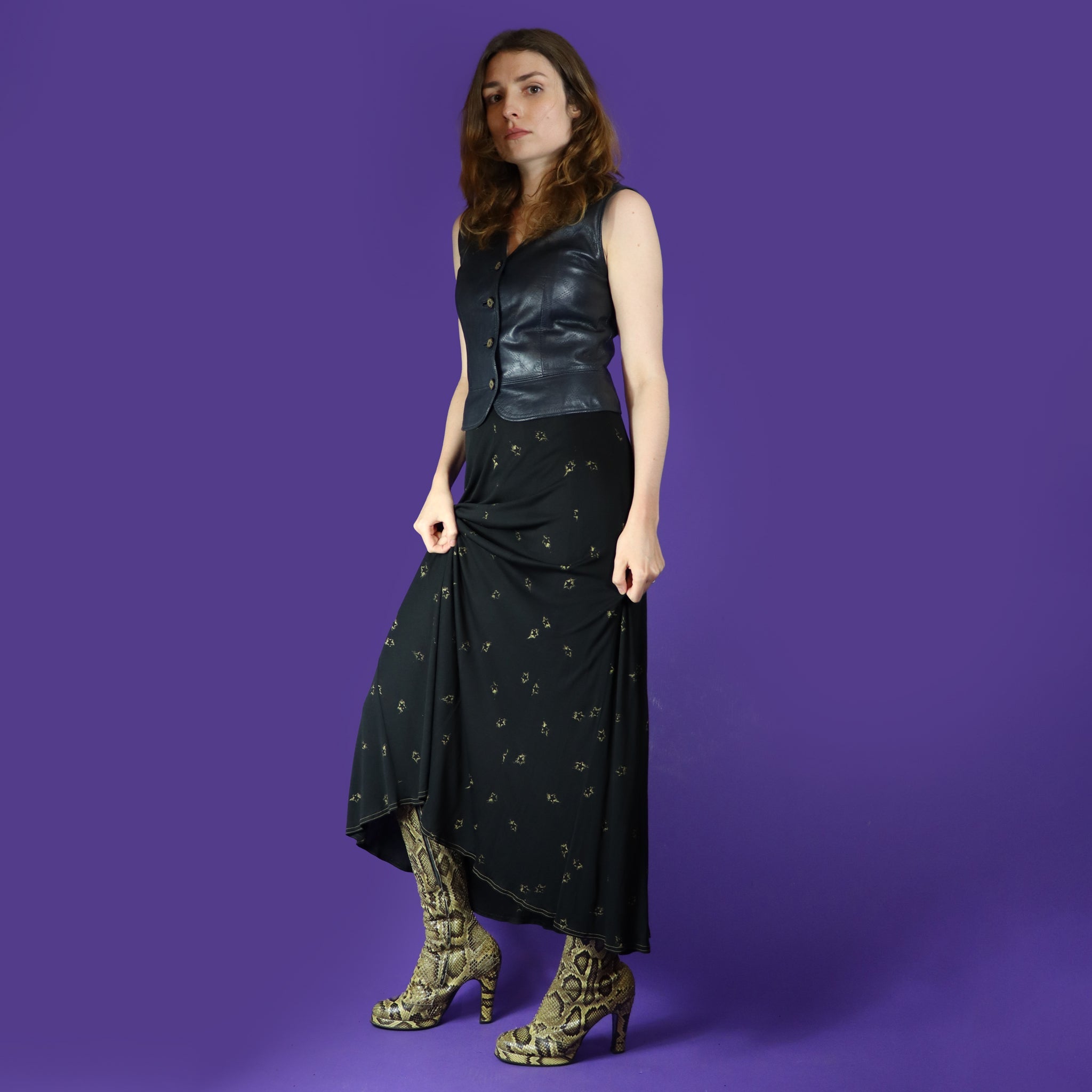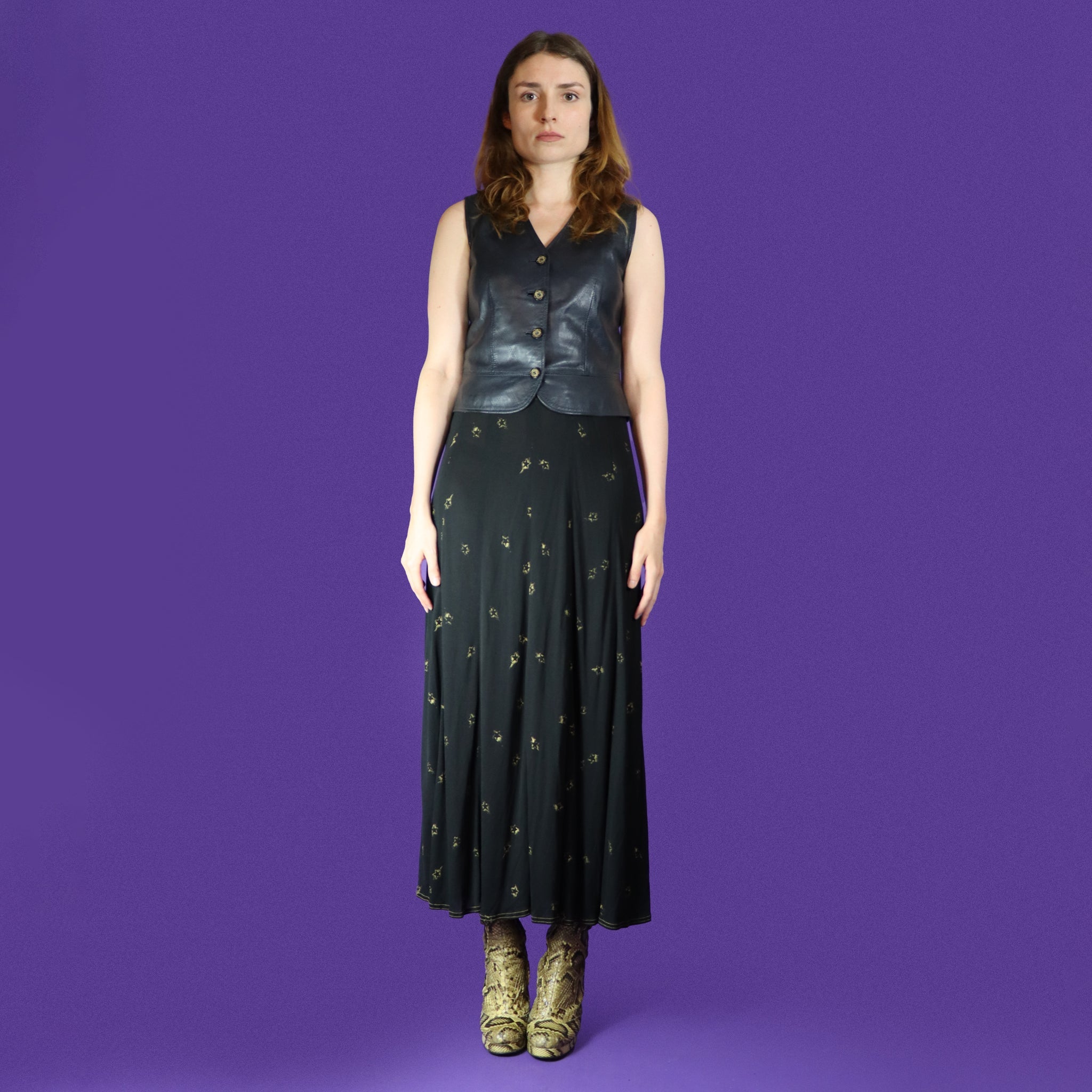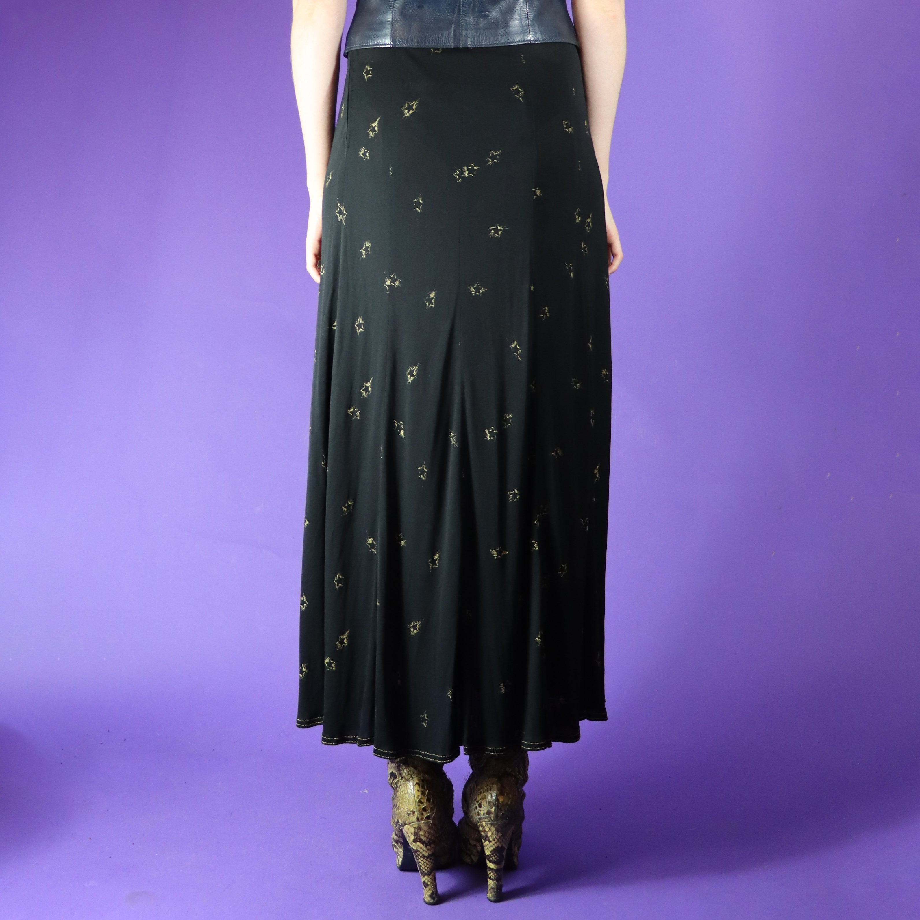 Vintage 1970s rayon crepe maxi skirt by iconic London designer Jean Muir. Muir was renowned for her innovative liquid rayon crepe which is soft, lightweight and hangs so beautifully on wear. Black with a fabulous shooting star design in golden yellow all over, with matching double stitch. Cut with a high waistband, clever pleating to create movement and a button & zipper closure. An incredibly flattering skirt in such a great print. A rare and collectible piece of fashion history.